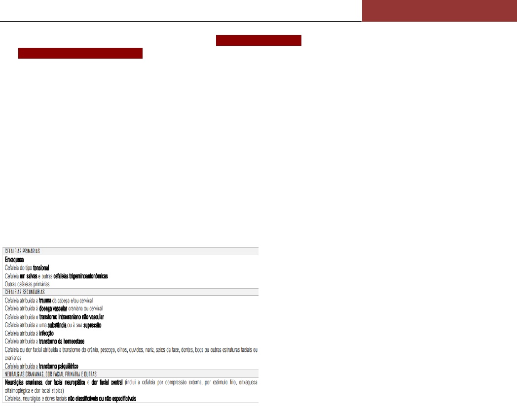 [GABRIELA BARBOSA] Turma 74- Medicina Unimontes RESUMO NEUROLOGIA CEFALEIAS / DOR DE CABEÇA - Inclui: dor na região do crânio (cefalgia ou cranialgia), dor na região da face (facialgia ou prosopalgia – abaixo da linha orbitomedial, acima do pescoço e anteriormente aos pavilhões auriculares) e/ou dor na região do pescoço (cerivcalgia); - Afecção frequente, que é a terceira queixa mais comum da prática médica; - Considerada um sinal de alarme, pois pode se relacionar com problemas de maior gravidade subjacentes (cefaleia secundária) ou não (cefaleia primária); - Epidemiologia – 90% dos adultos apresentam dor de cabeça em algum momento da vida, enquanto 75% das crianças apresentam cefaleia significativa por volta dos 15 anos - mais de 99% das mulheres e 94% dos homens sentirá no mínimo um tipo de cefaleia intensa durante a vida, mas em 90% dos casos, essa não será indicativo de um problema grave – o risco de desenvolver enxaqueca, cefaleia do tipo tensional ou cefaleia em salvas aumenta em até 4 vezes se um parente de primeiro grau tiver o mesmo tipo de dor; - Consequências: sofrimento físico, prejuízos sociais, laborais, emocionais e econômicos, dificuldade de aprendizado e prejuízo na qualidade de vida; 1. CLASSIFICAÇÃO DAS CEFALEIAS - A Sociedade Internacional de Dor da Cabeça, buscando padronizar e estruturar a abordagem das cefaleias, propôs a Classificação Internacional das Cefaleias (ICHD-2); a. ORIGEM - Primárias - a cefaleia por si só é a doença (sintoma principal), sendo causada por mecanismos de disfunção neuroquímica e neurofisiológica do sistema nervoso – são mais comuns até a 5ª década de vida, apresentando grande importância devido às suas recorrências e à possibilidade de se tornarem crônicas- características típicas: qualidade pulsátil, duração de 4 a 72h, dor de cabeça unilateral e náusea - tipos mais comuns: enxaqueca/migrânea (15 a 30%) e cefaleia tensional (35 a 78%); - Secundárias – a cefaleia é causada por uma doença subjacente, neurológica ou sistêmica, compondo o quadro sindrômico da doença – suas etiologias podem ser infecciosas, inflamatórias, parasitárias, traumáticas, vasculares, tumorais e metabólicas, sendo definida pelos exames complementares; b. MODO DE INSTALAÇÃO E EVOLUÇÃO - Agudas – atinge seu pico máximo em minutos ou poucas horas, durando horas ou dias – ocorre em cefaleias primárias ou secundárias; - Subagudas – apresentam instalação insidiosa, durando dias ou semanas, com máximo de dias até 3 meses – ocorre em cefaleias secundárias decorrentes de hematomas subdurais ou tumores de crescimento rápido; - Episódicas – ocorre em frequência inferior a 15 dias/mês; - Crônicas – ocorre em frequência superior a 15 dias/mês, persistindo por mais de 4 meses – ocorre em cefaleias primárias – podem ser recidivantes, ou seja, surgem por um período variável de tempo (minutos, horas, dias) e depois desaparecem, ressurgindo algum tempo depois (ex.: migrânea e cefaleia em salvas); **fatores de risco para dor de cabeça crônica: sexo feminino, dor do tipo enxaqueca, dor de cabeça frequente, obesidade, baixo nível socioeconômico e educacional, uso excessivo de medicamento, eventos estressantes e apneia do sono** 2. ANATOMIA E FISIOLOGIA DA CEFALEIA - Origem da cefaleia: mecanismos da dor nociceptiva (estimulação de nociceptores periféricos em resposta a um estímulo nocivo) ou da dor neuropática (lesão das vias nociceptivas do sistema nervoso periférico ou central) ou ambos; - O cérebro, o crânio, o epêndima e os plexos coroides são insensíveis à dor; - Estruturas Intracranianas Sensíveis à Dor: seios durais, veias de maior calibre, dura-máter, artéria meníngea média e as artérias do polígono de Willis; - Estruturas Extracranianas Sensíveis à Dor: couro cabeludo, pele, tecido subcutâneo, músculos, nervos, membranas submucosas, dentes e vasos sanguíneos maiores; - Inervação da Cabeça – (nervo V - trigêmeo) media a sensibilidade dolorosa das estruturas intra e extracranianas, da face e da cabeça, até a região do vértex (parte mais alta do crânio), inervando vasos sanguíneos, mucosas, músculos e tecidos; (nervos VII, IX e X) inerva pequenas áreas da cabeça; (nervos occipitais superiores – raízes originadas nos primeiros segmentos cervicais) inerva a região occipital do crânio; - Sistema Trigeminocervical: (1) terminais periféricos do nervo trigêmeo que inervam grandes vasos intracranianos e dura-máter; (2) as fibras nervosas a partir dessas fontes, principalmente pelo ramo oftálmico, atinge parte caudal do núcleo trigeminal, que se estende até os cornos dorsais da medula cervical superior, terminando no núcleo sensitivo principal do V nervo craniano e seu núcleo da raiz espinal (formado por vários subnúcleos, especialmente o subnúcleo caudalis), que recebe os impulsos da primeira e segunda raízes nervosas cervicais, ou seja, sinais de vasos meníngeos, regiões sensíveis da dura-máter e da medula cervical superior; (3) projeta-se para o tálamo ventropósteromedial e lateral através do trato espinotalâmico e para as regiões do diencéfalo e do tronco encefálico, envolvidas na regulação das funções autonômicas; (4) as informações nociceptivas talâmicas ascendem para o córtex sensorial e para outras áreas do cérebro – os sistemas modulares da dor influem na [GABRIELA BARBOSA] Turma 74- Medicina Unimontes transmissão do impulso dos nociceptores trigeminais em todos os níveis de vias de processamento da dor - principais estruturas envolvidas na cefaleia primária; - Mecanismos da Dor de Cabeça Secundária – estimulam a via nociceptiva por meio da compressão ou da inflamação associada; - Mecanismos da Dor de Cabeça Primária – ativação periférica causada pelo extravasamento neurogênico do plasma ativado espontaneamente ou pela depressão alastrante cortical; - A ativ