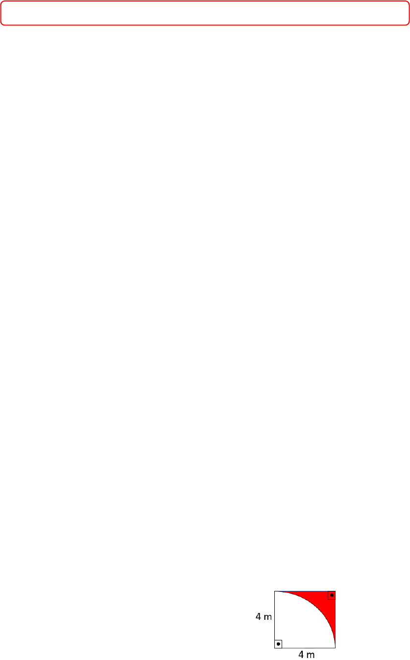 FUNDAMENTOS DE MATEMÁTICA LISTA DE EXERCÍCIOS SOBRE PERÍMETRO E ÁREA DE FIGURAS PLANAS Obs: As resoluções dos exercícios encontram-se no final desta lista. 1. Sabendo-se que o lado de um quadrado mede 8 cm, calcule o seu perímetro. 2. Um retângulo possui as seguintes dimensões, 5 cm de base e 3 cm de altura. Determine o seu perímetro. 3. Determine o perímetro de um retângulo, sabendo que a base mede 24 cm e sua altura mede a metade da base. 4. A praça de uma cidade possui a forma de um quadrado. Calcule quantos metros de corda deverão ser gastos para cercar a praça para uma festa sabendo que possui 45 m de lado e deseja-se dar 4 voltas com a corda. 5. Numa sala quadrada, foram gastos 24,80 m de rodapé de madeira. Essa sala tem apenas uma porta de 1,20 m de largura. Considerando que não foi colocado rodapé na largura da porta, calcule a medida de cada lado dessa sala. 6. O terreno de uma escola é retangular, com 100 m de comprimento por 65 m de largura. Em todo o contorno desse terreno será plantada árvores distantes 1,50 m uma da outra. Quantas árvores serão necessárias? 7. Um campo de futebol possui as seguintes dimensões, 155 m de comprimento e 75m de largura. Quantos metros de tela serão necessários para cercar este campo? 8. Qual é a área da região colorida da figura ao lado? Para os exercícios a seguir, adote 𝜋 = 3,14. 9. Uma pizza tem raio igual a 15 cm e está dividida em 6 fatias. Calcule a área de cada fatia. 10. Calcule a área de um círculo cujo o raio mede 8 cm. 11. Calcule a área de um círculo cujo diâmetro mede 20 cm. 12. Em um restaurante, a família “A” pediu uma pizza grande, de 43 cm de diâmetro, e outra família, a “B”, pediu duas médias, de 30 cm de diâmetro. Ambas as famílias comeram todas as pizzas pedidas. Qual família comeu mais quantidade de pizzas? 13. A área de uma circunferência é 28,26 m². Qual seu raio? 14. Calcule a área da região pintada, sabendo que a figura retangular é um quadrado. 15. Calcule a área da região pintada para cada alternativa abaixo: a) b) GABARITO 1. 32 cm 2. 16 cm 3. 72 cm 4. 720 m 5. 6,5 m 6. 220 árvores 7. 460 m 8. (16 − 4𝜋) m2 9. 117,75 cm² 10. 200,96 cm² 11. 314 cm² 12. Família A comeu mais quantidade de pizza, aproximadamente 1451 cm² 13. 3 m 14. 3,44 cm² 15. a) 30,37 cm²; b) 21,34 m² FUNDAMENTOS DE MATEMÁTICA LISTA DE EXERCÍCIOS SOBRE PERÍMETRO E ÁREA DE FIGURAS PLANAS (RESOLUÇÕES) 1. Sabendo-se que o lado de um quadrado mede 8 cm, calcule o seu perímetro. Resolução: Lembremos que perímetro (𝑃) é a soma das medidas de todos os lados de um polígono. Sendo assim, sabendo-se que um quadrado tem 4 lados de mesma medida, tem-se que o perímetro é: 𝑃 = 4 . 𝑙 = 4 . 8 = 32 𝑐𝑚 2. Um retângulo possui as seguintes dimensões, 5 cm de base e 3 cm de altura. Determine o seu perímetro. Resolução: Lembremos que perímetro (𝑃) é a soma das medidas de todos os lados de um polígono. O retângulo é um quadrilátero formado por quatro lados, sendo os lados opostos paralelos e de mesma medida. Assim, o perímetro (𝑃) do retângulo é: 𝑃 = 𝑏 + 𝑏 + ℎ + ℎ 𝑃 = 2 . 𝑏 + 2 . ℎ 𝑃 = 2. 5 + 2 . 3 𝑃 = 10 + 6 𝑃 = 16 𝑐𝑚 3. Determine o perímetro de um retângulo, sabendo que a base mede 24 cm e sua altura mede a metade da base. Resolução: Lembremos que perímetro (𝑃) é a soma das medidas de todos os lados de um polígono. Sendo b a medida da base do retângulo, h a medida da altura do retângulo e sabendo-se que h = 24 : 2 = 12 cm, tem-se que: 𝑃 = 𝑏 + 𝑏 + ℎ + ℎ 𝑃 = 2 . 𝑏 + 2 . ℎ 𝑃 = 2 . 24 + 2 . 12 𝑃 = 48 + 24 𝑃 = 72 𝑐𝑚 4. A praça de uma cidade possui a forma de um quadrado. Calcule quantos metros de corda deverão ser gastos para cercar a praça para uma festa sabendo que possui 45 m de lado e deseja-se dar 4 voltas com a corda. Resolução: Lembremos que perímetro (𝑃) é a soma das medidas de todos os lados de um polígono. Temos que calcular 4 vezes a medida do perímetro do quadrado (praça). Assim: 𝑃 = 4 . 𝑙 𝑃 = 4 . 45 𝑃 = 180 𝑚 Como deseja-se dar 4 voltas com a corda, tem-se que a quantidade de corda necessária será: 4 . 180 = 720 𝑚 5. Numa sala quadrada, foram gastos 24,80 m de rodapé de madeira. Essa sala tem apenas uma porta de 1,20 m de largura. Considerando que não foi colocado rodapé na largura da porta, calcule a medida de cada lado dessa sala. Resolução: Lembremos que perímetro (𝑃) é a soma das medidas de todos os lados de um polígono. 𝑃 = 4 . 𝑙 24,80 + 1,20 = 4 . 𝑙 26 = 4 . 𝑙 26 4 = 𝑙 𝑙 = 6,5 𝑚 Logo, a sala quadrada tem medida 6,5 m de lado. 6. O terreno de uma escola é retangular, com 100 m de comprimento por 65 m de largura. Em todo o contorno desse terreno serão plantadas árvores distantes 1,50 m uma da outra. Quantas árvores serão necessárias? Resolução: Lembremos que perímetro é a soma das medidas de todos os lados de um polígono. Inicialmente temos que saber o perímetro (𝑃) do terreno. 𝑃 = 100 + 100 + 65 + 65 = 330 𝑚 Como serão plantadas árvores com distância 1,50 m, temos que dividir a medida do perímetro do terreno por 1,5 m. Assim: 330 1,5 = 220 Serão necessárias 220 árvores para serem plantadas em todo contorno do terreno. 7. Um campo de futebol possui as seguintes dimensões, 155 m de comprimento e 75m de largura. Quantos metros de tela serão necessários para cercar este campo? Resolução: OBS: Perímetro (𝑃) é a soma das medidas de todos os lados de um polígono. 𝑃 = 155 + 155 + 75 + 75 𝑃 = 460 𝑚 A quantidade de tela necessária para cercar este campo é 460 m. 100 m 100 m 65 m 65 m Terreno 8. Qual é a área da região colorida da figura ao lado? Resolução: A área da região colorida (𝐴) é igual à área do quadrado (𝐴𝑄) menos 1 4 da área do círculo (𝐴𝐶): 𝐴 = 𝐴𝑄 − 1 4 . 𝐴𝐶 Área do quadrado (𝐴𝑄): 𝐴