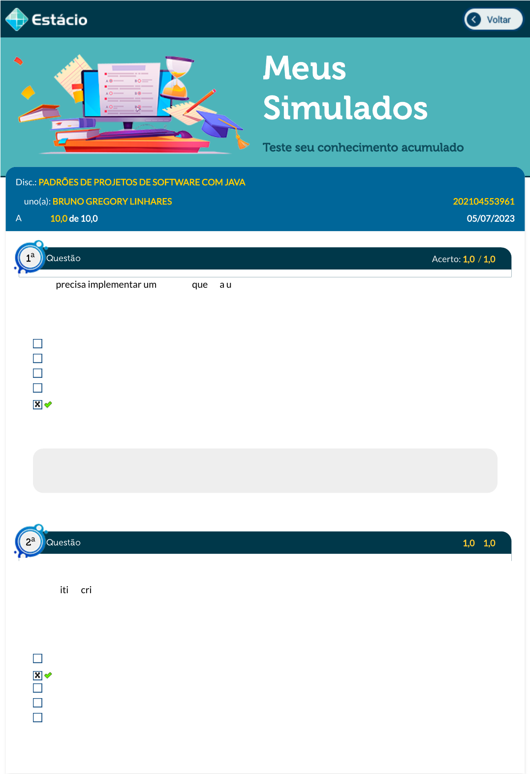 05/07/2023, 20:57 Estácio: Alunos https://simulado.estacio.br/bdq_simulados_avaliacao_parcial_resultado.asp?cod_hist_prova=313619538&cod_prova=6549980527&f_cod_disc= 1/5 Meus Simulados Teste seu conhecimento acumulado Disc.: PADRÕES DE PROJETOS DE SOFTWARE COM JAVA Aluno(a): BRUNO GREGORY LINHARES 202104553961 Acertos: 10,0 de 10,0 05/07/2023 Acerto: 1,0 / 1,0 Você precisa implementar um módulo que leia um arquivo RTF (Rich Text Format) e converta seu conteúdo em diferentes formatos (ASCII, TeX, HTML etc.). Sabendo que o arquivo é composto por diferentes partes (texto, formatação, �guras etc.), qual dos padrões seria mais indicado para isolar o conversor das diferentes formas de representação do conteúdo gerado? Abstract Factory Singleton Prototype Factory Method Builder Respondido em 05/07/2023 20:36:44 Explicação: A resposta certa é: Builder Acerto: 1,0 / 1,0 Analise o propósito a seguir: ''Permitir a criação de uma família de objetos relacionados ou dependentes, de forma que o módulo cliente não precise conhecer os objetos especí�cos das diferentes famílias, lidando apenas com as interfaces genéricas dos produtos dessas famílias''. Assinale a alternativa com o nome do padrão que possui esse propósito: Builder Abstract Factory Prototype Factory Method Singleton Respondido em 05/07/2023 20:49:44 Questão1 a Questão2 a https://simulado.estacio.br/alunos/inicio.asp javascript:voltar(); 05/07/2023, 20:57 Estácio: Alunos https://simulado.estacio.br/bdq_simulados_avaliacao_parcial_resultado.asp?cod_hist_prova=313619538&cod_prova=6549980527&f_cod_disc= 2/5 Explicação: A resposta certa é: Abstract Factory Acerto: 1,0 / 1,0 Conseguir adicionar um novo fornecedor externo de um serviço já utilizado por um sistema, apenas adicionando um módulo que seja capaz de converter uma requisição de uma interface conhecida pelo sistema para a interface proprietária fornecida pelo componente externo é um dos efeitos obtidos com a aplicação de qual padrão? Flyweight Bridge Facade Adapter Proxy Respondido em 05/07/2023 20:50:06 Explicação: A resposta certa é: Adapter Acerto: 1,0 / 1,0 Sobre o padrão Composite, assinale a alternativa correta: Esse padrão é utilizado na composição de adaptadores para serviços implementados por componentes de terceiros. Esse padrão é apropriado para situações em que operações sobre o todo não devam ser aplicadas de forma recursiva às suas partes. Esse padrão é orientado para construção e manipulação de grafos cíclicos de objetos. Esse padrão permite manipular agregados e seus elementos com uma interface uniforme, isto é, com as mesmas operações. O conceito de polimor�smo não está presente na solução proposta pelo padrão. Respondido em 05/07/2023 20:50:34 Explicação: A resposta certa é: Esse padrão permite manipular agregados e seus elementos com uma interface uniforme, isto é, com as mesmas operações. Acerto: 1,0 / 1,0 "Esse padrão encapsula uma requisição em um objeto, desacoplando o requisitante e o objeto executor. Esse encapsulamento permite registrar o histórico de requisições, reproduzir essas requisições em outro ambiente, bem como implementar operações de desfazer ou refazer o processamento associado à requisição". Assinale a alternativa com o nome do padrão que possui esse propósito: Questão3 a Questão4 a Questão5 a 05/07/2023, 20:57 Estácio: Alunos https://simulado.estacio.br/bdq_simulados_avaliacao_parcial_resultado.asp?cod_hist_prova=313619538&cod_prova=6549980527&f_cod_disc= 3/5 Mediator Iterator Template Method Chain of Responsibility Command Respondido em 05/07/2023 20:50:56 Explicação: Gabarito: Command Acerto: 1,0 / 1,0 Esse padrão de�ne uma estrutura similar à de um esquema Publisher-Subscriber, pois existe um Publisher detentor de um conjunto de informações e registra um conjunto de objetos interessados em receber noti�cações de modi�cação desse conjunto de informações, ou seja, do estado do Publisher. Ao ter o seu estado interno modi�cado, o Publisher noti�ca os Subscribers que, por sua vez, executam algum procedimento especí�co de tratamento dessa modi�cação. Assinale a opção com o padrão correspondente à descrição acima: Template Method State Observer Visitor Strategy Respondido em 05/07/2023 20:51:11 Explicação: Gabarito: Observer Acerto: 1,0 / 1,0 Um módulo X escreve dados em uma tabela de um banco de dados relacional que é lida por um módulo Y. Se o desenvolvedor responsável pelo módulo X resolver mudar algo no esquema dessa tabela, será preciso avaliar o impacto dessa mudança em Y. Esse fato evidencia a existência de um acoplamento de que natureza entre os módulos X e Y? Acoplamento de Controle Acoplamento de Estrutura Acoplamento de Dados Acoplamento Global Acoplamento Externo Respondido em 05/07/2023 20:51:34 Explicação: O acoplamento externo ocorre quando módulos compartilham alguma parte do ambiente externo ao software, tais como banco de dados. Questão6 a Questão7 a 05/07/2023, 20:57 Estácio: Alunos https://simulado.estacio.br/bdq_simulados_avaliacao_parcial_resultado.asp?cod_hist_prova=313619538&cod_prova=6549980527&f_cod_disc= 4/5 Acerto: 1,0 / 1,0 Assinale a alternativa CORRETA sobre o padrão GRASP Acoplamento: Em um sistema de acoplamento baixo, as mudanças de requisitos tendem a gerar modi�cações em poucas classes. O acoplamento Global entre dois módulos corresponde a um grau baixo de acoplamento, já que eles não dependem um do outro, mas sim de uma variável global. Um sistema que não faz uso do recurso de interfaces abstratas, sendo implementado apenas com classes, tende a ser um sistema com grau de acoplamento baixo. Quando passamos um objeto com diversos atributos como argumento para um método e este método utiliza apenas um desses atributos no seu processamento, temos um acoplamento de dados. Um sistema com acoplamento baixo indica que a lógica do sistema está concentrad
