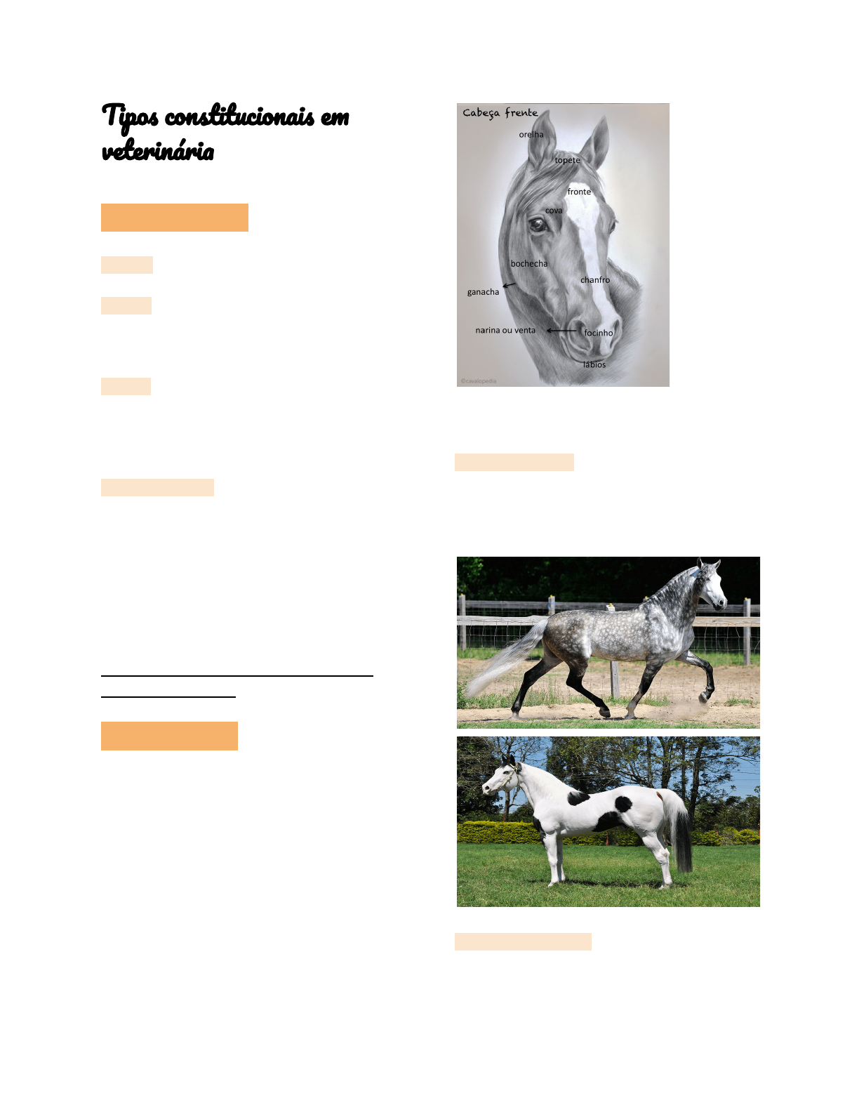 Tip�� constitucionai� e� veterinári� Conceitos importantes Genótipo: características hereditárias, parte do genoma do animal Fenótipo: combinação dos fatores genéticos e não-genéticos, características observáveis do indivíduo. ex.: clima da região onde vive, alimentação Parátipo: variação do tipo original da espécie, é por fatores não-genéticos que há uma variação das raças, local onde se desenvolveram, alimentação, clima, atividades que praticam. Tipo constitucional: resultado do genótipo + fenótipo. Refere-se a cada padrão racial, a estrutura anatômica que são comuns às várias raças que apresentam as mesmas aptidões funcionais. O genótipo sofre a ação do fenótipo no seu desenvolvimento, os genes, a parte hereditária do animal sofre a influência dos fatores externos do ambiente onde vive, gerando um tipo constitucional daquela raça para aquele local. Variação na constituição/formação do animal a depender de onde vive. Fatores morfológicos - Perfil (Aloidismo): estudo do perfil, conjuntos das linhas de contorno do corpo do animal. (A cabeça é melhor analisada por não sofrer variações de obesidade) Regiões analisadas no perfil, para o estudo do perfil, o mais importante é a região da fronte. Retilíneo ou ortóide: cabeça com fronte plana e região dorsal do nariz retilínea. Margem superior do pescoço é retilínea, a linha dorso lombar também. Ex.: Cavalo andaluz Concavilíneo ou selóide: cabeça com depressão na fronte que se prolonga pela linha dorsal do nariz, a margem superior do pescoço também é côncava. *Se a depressão fronto-nasal for muito aparente, esse perfil pode ser considerado como medianamente côncavo ou ultra côncavo. Convexilíneo ou certóide: linha fronto-nasal meio convexa, o pescoço é arqueado (pescoço de cisne). *O grau de convexidade pode mudar: subconvexo, convexo ou ultra convexo Ex.: Cavalo Bretão A classificação dos tipos constitucionais depende da caracterização dos índices zoométricos, que estuda as proporções em animais adultos. ÍNDICE DO PERFIL CORPÓREO = Comprimento do tronco X 100 Perímetro torácico ÍNDICE TORÁCICO TRANSVERSAL= Largura do tórax X 100 Altura do tórax ÍNDICE DÁTILO-TORÁCICO= Perímetro do metacarpo X 100 Perímetro torácico ÍNDICE CEFÁLICO= Largura da fronte nas órbitas X 100 Comprimento da cabeça Classificação dos tipos constitucionais e aptidões de trabalho - Harmonia de conformação Anamorfose: estudo das proporções corpóreas Brevilíneos: predominam diâmetros transversais. Grande massa corpórea, pescoço e tronco curtos e musculosos, cabeça de perfil convexilíneo. Aptidão: cavalos de tração pesada ou meio pesada Exemplos: Bretão - Equus caballus Origem: Bretanha (Breton horse) Pelagem: Alazã e Castanha, com frequência de crina clara Altura: macho e fêmea de 1,55m a 1,63m Raça utilizada em atividades militares, agrícolas e de transporte. Os cascos são cobertos por um pouco de plumagem. Ainda há subtipos: Bretão corlay (Petit trait), é o menor, para atividades leves ou montaria. Bretão postier é utilizado para tarefas mais leves nas fazendas Bretão de tração (Trait breton) maior dos subtipos, utilizado para trabalho pesado Percheron - Equus ferus caballus Origem: Francesa Pelagem: Cinza ou negro Altura: de 1,70m a 1,96m Cavalo de tração, utilizado para trabalhos agrícolas ou urbanos. Há dois tipos, o grande Trait Percheron, com maior peso e altura, para tração pesada. E o pequeno Diligencier Percheron, de menores dimensões. Mediolíneos: Proporções mais harmoniosas entre os diâmetros, perfil reto ou convexo. Animais de tração leve ou de trabalho de campo, porte médio e ágil. Exemplos: Mangalarga - Equus ferus caballus Origem: Brasileira Pelagem: existem vários tipos sendo os mais comuns, Castanha, Alazã, Tordilho. Altura: macho - 1,47 a 1,57 | fêmea - 1,40 a 1,54 O seu porte médio e ágil colabora para seu uso em montaria. Temperamento ativo e dócil. Campolina Origem: Brasileira Pelagem: Baia, Alazã, Castanha, Preta, Tordilha, Branca, Pampa. Altura: machos - 1,58m | fêmeas - 1,52m Utilizado para montaria e lida com o gado. Tem o perfil convexo, temperamento dócil. Longilíneos: Grande velocidade, linhas leves, membros longos, perfil Retilíneo tendendo a côncavo. Animais utilizados em corrida. Exemplos: Puro Sangue Inglês - Equus ferus caballus Origem: Inglaterra Altura: 1,65m a 1,70m Pelagem: Alazã, Castanha, Tordilho, Negro. Utilizado para corrida (turfe) e hipismo, sua velocidade de corroído é de 70km/h. Tem influência do cavalo Árabe. Gene da velocidade: descoberta do gene associado à uma mutação da miostatina, uma proteína ligada ao fator crescimento, que limita o crescimento do tecido muscular, a mutação no gene que produz a miostatina forma um indivíduo mais forte, como não há impedimento do desenvolvimento muscular. Árabe - Puro Sangue Árabe Origem: Médio Oriente Pelagem: Alazã, Branca, Preta e Tordilha Altura: 1,40m a 1,58m Peso: 450kg Perfil côncavo, orelhas pequenas, focinho curto, olhos expressivos, pescoço de cisne, garota reta e rabo com inserção alta. Foi utilizado no melhoramento genético de várias raças, garantindo velocidade, refinamento, resistência e estrutura óssea. Utilizados em esportes equestres olímpicos. Adaptações do cavalo Árabe Os olhos são grandes, proporcionando uma excelente visão para o alerta de predadores As narinas se dilatam no momento da corrida, proporcionando grande captação de ar, normalmente elas ficam semicerradas, reduzindo a inspiração de poeira nos climas mais secos do deserto. A grande captação de ar é comprovada pelo maior número de células vermelhas, indicando o uso mais eficiente do oxigênio. A pele escura por baixo dos pelos na região dos olhos reduz o reflexo da luz do sol e protege contra queimaduras. A pele fina proporciona a rápida evaporação do suor, resfriando o corpo mais rap