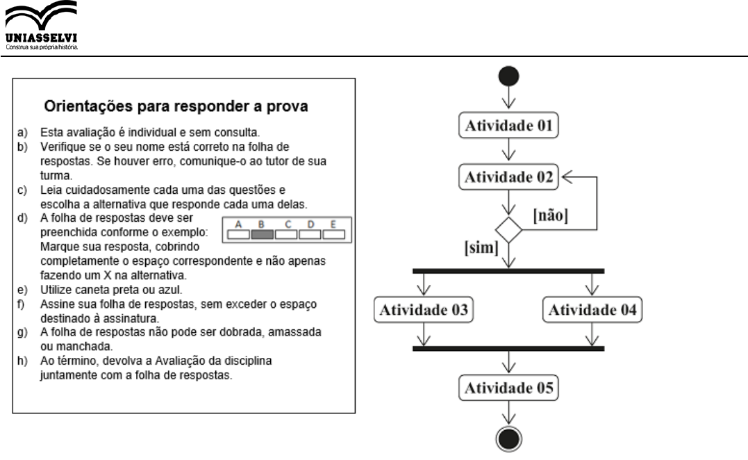 05/07/2023, 18:14 Impresso de Prova - Grupo UNIASSELVI https://www.uniasselvi.com.br/extranet/o-2.0/prova_ead/impressao_v2/impressao_prova_html.php 1/5 1.O diagrama de atividades é um dos diagramas disponíveis na UML (Linguagem de Modelagem Unificada) para a modelagem de aspectos dinâmicos de sistemas. Com relação ao diagrama de atividades apresentado, analise as afirmativas a seguir: I- A atividade 05 será executada se a atividade 03 ou a atividade 04 for concluída. II- A ramificação sequencial existente após a atividade 02 significa que, caso o fluxo seja [não], é necessário que sejam executadas novamente as atividades 01 e 02. III- As atividades 03 e 04 vão ter início ao mesmo tempo, entretanto, não significa que terminarão ao mesmo tempo. IV- Caso o fluxo da ramificação sequencial existente após a atividade 02 tenha o fluxo [sim], a atividade 02 não será mais executada. Assinale a alternativa CORRETA: A. ( ) As afirmativas I e IV estão corretas. B. ( ) As afirmativas I e II estão corretas. C. ( ) As afirmativas III e IV estão corretas. D. ( ) As afirmativas II e III estão corretas. 2.Um BPMS constitui-se de uma plataforma formada por diversos componentes de software, dentre os quais podemos destacar os padrões de conhecimento, ferramentas e sistemas BPM, Servidores BPM, Motores, Componentes, Linguagens e Plataformas. Acerca das linguagens e Plataformas que fazem parte do BPMS, analise as opções a seguir: I- J2EE. II- PMI. III- XML. IV- .NET. Assinale a alternativa CORRETA: A. ( ) As opções III e IV estão corretas. B. ( ) As opções I, II e III estão corretas. C. ( ) As opções I e II estão corretas. D. ( ) As opções I, III e IV estão corretas. 3.Além dos elementos de fluxo (atividades, gateways e eventos), dos elementos conectores (fluxo de sequência e fluxo de mensagem) e dos elementos organizacionais (swimlanes), BPMN oferece elementos adicionais para sinalização visual do processo denominados artefatos. Sobre o objeto de dados, avalie as asserções a seguir: CENTRO UNIVERSITÁRIO LEONARDO DA VINCI Período Letivo: 2023/1 - Turma: 2900GTI/4 - Sexta/Noturno Disciplina: Modelagem e Gestão de Processos de Neg. (GTI03) Prova: 67250485 - Avaliação Final (Objetiva) - Individual Acadêmico: Rafael Gomes da Costa (3688963) 05/07/2023, 18:14 Impresso de Prova - Grupo UNIASSELVI https://www.uniasselvi.com.br/extranet/o-2.0/prova_ead/impressao_v2/impressao_prova_html.php 2/5 I- O objeto de dados é um mecanismo para mostrar como os dados são requeridos ou produzidos por atividades, e são considerados artefatos. PORQUE II- Não tem nenhum efeito direto sobre o fluxo de sequência ou fluxo de mensagem do processo, mas pode fornecer informações sobre o que a atividade necessita para ser executada ou/e o que elas produzem. Assinale a alternativa CORRETA: A. ( ) A primeira asserção é uma proposição falsa, e a segunda, uma proposição verdadeira. B. ( ) As duas asserções são proposições verdadeiras, mas a segunda não é uma justificativa correta da primeira. C. ( ) A primeira asserção é uma proposição verdadeira, e a segunda, uma proposição falsa. D. ( ) As duas asserções são proposições verdadeiras, e a segunda é uma justificativa correta da primeira. 4.A definição de negócio se refere a pessoas que executam processos, utilizando tecnologias da informação, com a finalidade de entregar valor aos clientes e gerar retorno de investimentos às partes interessadas. Nesse contexto, assinale a alternativa CORRETA que apresenta o que é necessário conhecer para definir os processos de uma organização: A. ( ) Os objetivos do negócio, os resultados esperados e os diagramas de processo de negócios privados. B. ( ) Os objetivos do negócio devem estar alinhados ao planejamento estratégico da organização. C. ( ) Os processos de negócio devem estar alinhados com o processo empresarial. D. ( ) Os processos de negócio devem estar relacionados com as cadeias de valores. 5.O ciclo de gerenciamento dos processos possui como objetivo principal fazer a gestão do ciclo de vida de todos os processos organizacionais, os quais utilizam a notação BPM para o gerenciamento e para a execução das atividades, sejam elas operacionais ou de negócio. O ciclo de vida de um projeto BPM possui como características a organização, o alinhamento, as tecnologias, as metodologias, a cultura e a estratégia dos processos. Analisando o ciclo de vida de um projeto BPM, sobre as atividades pertencentes ao ciclo de gerenciamento dos processos, assinale a alternativa CORRETA: A. ( ) Planejamento, análise, modelagem, implementação, monitoramento e refinamento. B. ( ) Entender o ambiente interno, estratégias de negócio, ambiente interno e externo. C. ( ) Entender, selecionar, priorizar, preparar, melhoria contínua e técnicas de melhoria. D. ( ) Coordenar, estabelecer diretrizes, verificar, levantamento, controlar, definir e alinhar. 6.Os processos de negócios são classificados como primários e secundários. O processo primário representa as funcionalidades e as atividades que são essenciais para a organização. Suas características compreendem: entrega de valor ao cliente e criação e percepção de valor. O processo secundário é definido por dar suporte aos processos primários definidos formalmente para uma determinada atividade. Suas características não possuem relacionamento direto com o cliente e não disponibilizam uma visão funcional dos processos da organização. Assinale a alternativa CORRETA que apresenta o nome do processo que possui a finalidade de atingir metas operacionais, financeiras e regulatórias: A. ( ) Processo de relações. B. ( ) Processo de estruturas. C. ( ) Processos gerenciais. D. ( ) Processo de negócio. 7.Com o incremento da importância da TI dentro da estratégia do negócio nas organizações, torna- se necessário analisar o desempenho dos serviços de TI quanto aos resultados alcançados. Par