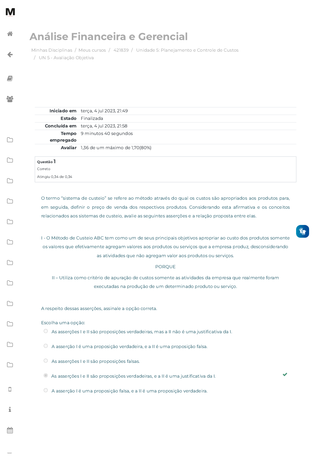04/07/2023, 21:59 UN 5 - Avaliação Objetiva: Revisão da tentativa https://avap.multivix.edu.br/mod/quiz/review.php?attempt=3541111&cmid=1312805 1/5 Minhas Disciplinas / Meus cursos / 421839 / Unidade 5: Planejamento e Controle de Custos / UN 5 - Avaliação Objetiva Análise Financeira e Gerencial Iniciado em terça, 4 jul 2023, 21:49 Estado Finalizada Concluída em terça, 4 jul 2023, 21:58 Tempo empregado 9 minutos 40 segundos Avaliar 1,36 de um máximo de 1,70(80%) Questão 1 Correto Atingiu 0,34 de 0,34 O termo “sistema de custeio” se refere ao método através do qual os custos são apropriados aos produtos para, em seguida, de�nir o preço de venda dos respectivos produtos. Considerando esta a�rmativa e os conceitos relacionados aos sistemas de custeio, avalie as seguintes asserções e a relação proposta entre elas. I - O Método de Custeio ABC tem como um de seus principais objetivos apropriar ao custo dos produtos somente os valores que efetivamente agregam valores aos produtos ou serviços que a empresa produz, desconsiderando as atividades que não agregam valor aos produtos ou serviços. PORQUE II – Utiliza como critério de apuração de custos somente as atividades da empresa que realmente foram executadas na produção de um determinado produto ou serviço. A respeito dessas asserções, assinale a opção correta. Escolha uma opção: As asserções I e II são proposições verdadeiras, mas a II não é uma justi�cativa da I. A asserção I é uma proposição verdadeira, e a II é uma proposição falsa. As asserções I e II são proposições falsas. As asserções I e II são proposições verdadeiras, e a II é uma justi�cativa da I. A asserção I é uma proposição falsa, e a II é uma proposição verdadeira. https://avap.multivix.edu.br/my/ https://avap.multivix.edu.br/course/view.php?id=20290 https://avap.multivix.edu.br/course/view.php?id=20290§ion=6 https://avap.multivix.edu.br/mod/quiz/view.php?id=1312805 https://avap.multivix.edu.br/my/ https://avap.multivix.edu.br/course/view.php?id=20290 https://avap.multivix.edu.br/user/index.php?id=20290 https://avap.multivix.edu.br/course/view.php?id=20290§ion=1 https://avap.multivix.edu.br/course/view.php?id=20290§ion=2 https://avap.multivix.edu.br/course/view.php?id=20290§ion=3 https://avap.multivix.edu.br/course/view.php?id=20290§ion=4 https://avap.multivix.edu.br/course/view.php?id=20290§ion=5 https://avap.multivix.edu.br/course/view.php?id=20290§ion=6 https://avap.multivix.edu.br/course/view.php?id=20290§ion=7 https://avap.multivix.edu.br/course/view.php?id=20290§ion=8 https://avap.multivix.edu.br/course/view.php?id=20290§ion=9 https://avap.multivix.edu.br/course/view.php?id=20290§ion=10 https://avap.multivix.edu.br/course/view.php?id=20290§ion=11 https://avap.multivix.edu.br/course/view.php?id=20290§ion=12 https://avap.multivix.edu.br/hooks/portal/ https://avap.multivix.edu.br/mod/page/view.php?id=1252%2F%22%20target%3D%22_blank https://avap.multivix.edu.br/calendar/view.php/ https://avap.multivix.edu.br/local/staticpage/view.php?page=biblioteca https://avap.multivix.edu.br/ 04/07/2023, 21:59 UN 5 - Avaliação Objetiva: Revisão da tentativa https://avap.multivix.edu.br/mod/quiz/review.php?attempt=3541111&cmid=1312805 2/5 Questão 2 Correto Atingiu 0,34 de 0,34 Como as empresas necessitam ter resultados favoráveis para sua sobrevivência e crescimento, não planejar e controlar custos pode resultar em perdas irrecuperáveis para as organizações devido a decisões tomadas com base em informações erradas ou mesmo tomadas sem qualquer relatório gerencial. Considerando esta a�rmativa e os conceitos relacionados ao controle de custos organizacionais, avalie as seguintes asserções e a relação proposta entre elas. I – Ao de�nir o Custo Estimado, a empresa deve considerar o comportamento de seus gastos (�xos e variáveis) concomitantemente à sua estrutura de produção. PORQUE II – Os Custos Controláveis se referem aos itens que compõem os custos incorridos na produção da empresa que estão sob responsabilidade de um determinado funcionário da empresa, sendo que este funcionário normalmente ocupa um cargo que envolve supervisão ou gerenciamento. A respeito dessas asserções, assinale a opção correta. Escolha uma opção: As asserções I e II são proposições verdadeiras, e a II é uma justi�cativa da I. As asserções I e II são proposições verdadeiras, mas a II não é uma justi�cativa da I. A asserção I é uma proposição falsa, e a II é uma proposição verdadeira. A asserção I é uma proposição verdadeira, e a II é uma proposição falsa. As asserções I e II são proposições falsas. https://avap.multivix.edu.br/my/ https://avap.multivix.edu.br/course/view.php?id=20290 https://avap.multivix.edu.br/user/index.php?id=20290 https://avap.multivix.edu.br/course/view.php?id=20290§ion=1 https://avap.multivix.edu.br/course/view.php?id=20290§ion=2 https://avap.multivix.edu.br/course/view.php?id=20290§ion=3 https://avap.multivix.edu.br/course/view.php?id=20290§ion=4 https://avap.multivix.edu.br/course/view.php?id=20290§ion=5 https://avap.multivix.edu.br/course/view.php?id=20290§ion=6 https://avap.multivix.edu.br/course/view.php?id=20290§ion=7 https://avap.multivix.edu.br/course/view.php?id=20290§ion=8 https://avap.multivix.edu.br/course/view.php?id=20290§ion=9 https://avap.multivix.edu.br/course/view.php?id=20290§ion=10 https://avap.multivix.edu.br/course/view.php?id=20290§ion=11 https://avap.multivix.edu.br/course/view.php?id=20290§ion=12 https://avap.multivix.edu.br/hooks/portal/ https://avap.multivix.edu.br/mod/page/view.php?id=1252%2F%22%20target%3D%22_blank https://avap.multivix.edu.br/calendar/view.php/ https://avap.multivix.edu.br/local/staticpage/view.php?page=biblioteca https://avap.multivix.edu.br/ 04/07/2023, 21:59 UN 5 - Avaliação Objetiva: Revisão da tentativa https://avap.multivix.edu.br/mod/quiz/review.php?attem