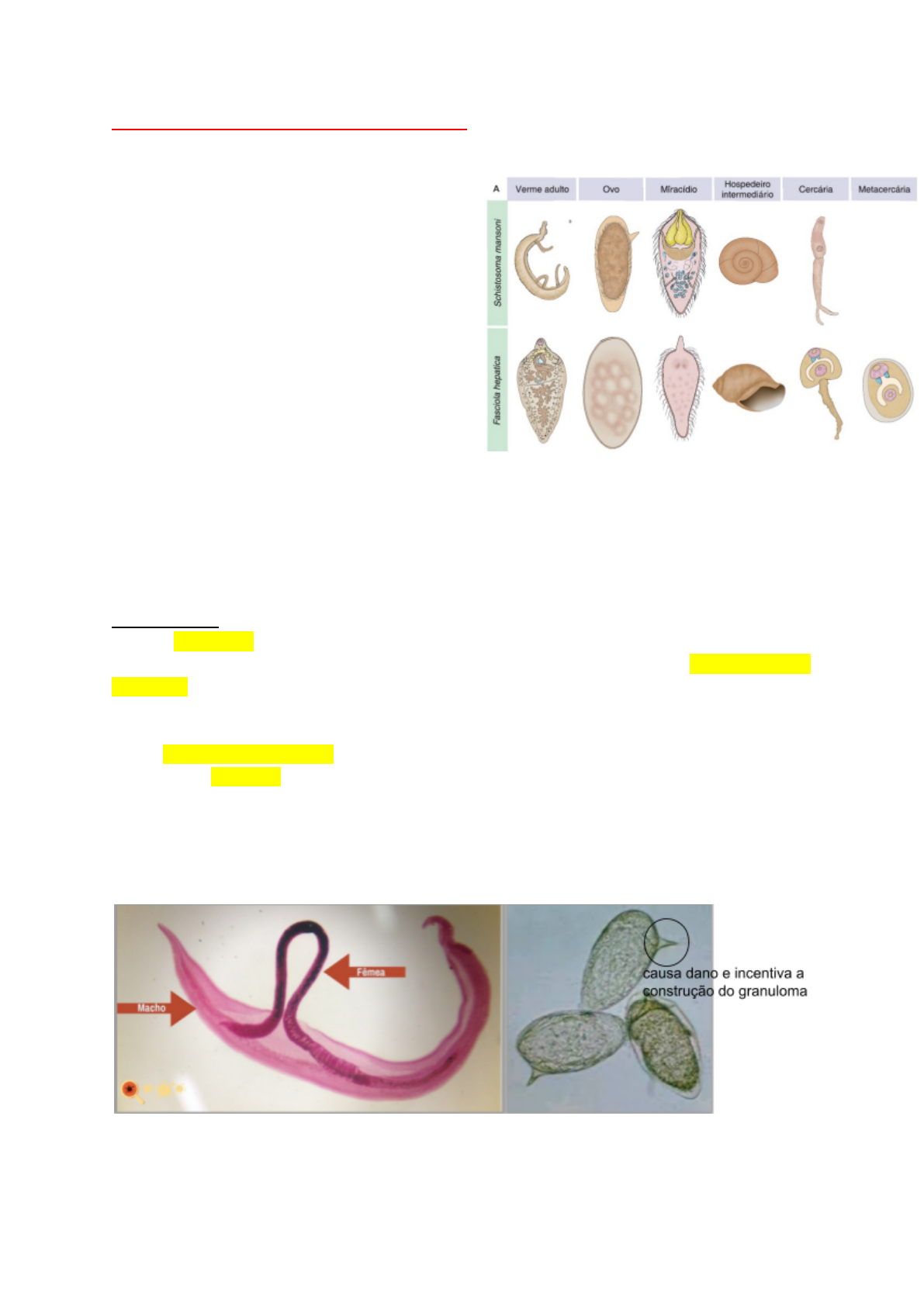 ESQUISTOSSOMOSE, TENÍASE, CISTICERCOSE - Trematódeos digenéticos (apresentam ciclo heteroxeno) • Filo: Platyhelminthes • Subclasse: Trematoda • Infraclasse: Digenea • Corpo não segmentado • Par de ventosas: oral e ventral (acetábulo) • São hermafroditas • Reprodução sexuada no hospedeiro vertebrado – Schistosoma spp. • São achatados dorsoventralmente (formato de folha) • Schistosoma spp.: longo e largo, com dimorfismo sexual Miracídio= infecta o hospedeiro intermediário Cercária= infecta o hospedeiro definitivo ● ESQUISTOSSOMOSE MANSÔNICA Agente etiológico: Schistosoma mansoni (Platelminto dióico) Verme adulto Possui tegumento constituído por uma camada sincicial de células anucleadas, sendo recoberto por uma citomembrana heptalamelar espessa, a qual é constantemente renovada. • O tubo digestivo comunica-se com o exterior unicamente através da boca (não possui ânus) Nutrem-se do sangue. Os produtos não aproveitáveis na digestão são eliminados pela boca. A excreção é realizada por células especializadas denominadas solenócitos. • Sem aparelho circulatório H. INTERMEDIÁRIO: Caramujo biomphalaria H. DEFINITIVO: Ser humano A forma infectante é a cercária que penetra a pele íntegra. Como profilaxia temos controle da população do caramujo, saneamento básico e tratamento dos doentes. - CICLO Ovos → larva ciliada (miracídio) → eclosão do ovo → liberação do miracídio → infecção do caramujo → reprodução mitótica dentro do caramujo → esporocisto → cercárias → infecção do hospedeiro vertebrado ou encistamento (metacercárias) TRANSMISSÃO: penetração ativa da cercária na pele (Dermatite cercariana) ELIMINAÇÃO DE OVOS: A partir da 5a semana de infecção Não ocorre transmissão: Por contato direto ou autoinfecção - ETIOLOGIA Alojam-se aos pares vênulas terminais do plexo mesentérico inferior. Faz hipersensibilidade do tipo 4 (granulomas) que causam hipertensão portal hepática. O verme adulto (parasita intravascular obrigatório): vênulas do plexo hemorroidário superior e nas ramificações mais finas das veias mesentéricas, particularmente da mesentérica inferior • Encontrados preferencialmente do fígado e intestinos • Vida média: 3 a 5 anos, podendo chegar a 25 anos - SUSCETIBILIDADE À INFECÇÃO Qualquer pessoa, independente de idade, sexo ou grupo étnico, que entre em contato com as cercárias, pode vir a contrair a infecção Áreas hiperendêmicas: certo grau de resistência (infecções com carga parasitária menor), com quadro clínico menos grave - FORMA CLÍNICA Evolução crônica: Vermes habitam os vasos sanguíneos do fígado e intestinos Fase inicial • Penetração das cercárias e resposta inflamatória local • Assintomática: na infância com sintomas inespecíficos. O diagnóstico laboratorial inclui eosinofilia e presença de ovos nas fezes • Sintomática: presença de dermatite cercariana (podem permanecer até 5 dias pós exposição) • Febre de Katayama (QUADRO AGUDO): linfodenopatia, febre, cefaléia, anorexia, dor abdominal e, com menor frequência, o paciente pode referir diarreia, náuseas, vômitos e tosse seca. Ao exame físico, pode ser encontrado hepatoesplenomegalia. O achado laboratorial é de eosinofilia e presença de IgM específica elevada é bastante sugestivo, quando associado a dados epidemiológicos. Fase tardia: Forma crônica: 6 meses pós infecção Podem surgir os sinais de progressão da doença para diversos órgãos, chegando a atingir graus extremos de severidade, como hipertensão pulmonar e portal, ascite, ruptura de varizes do esôfago • Hepatointestinal/Hepática: caracteriza-se pela presença de diarreias e epigastralgia. Ao exame físico, o paciente apresenta fígado palpável, com nodulações que, nas fases mais avançadas dessa forma clínica, correspondem a áreas de fibrose decorrentes de granulomatose periportal ou fibrose de Symmers • Hepatoesplênica compensada: a característica fundamental desta forma é a presença de hipertensão portal, levando à esplenomegalia e ao aparecimento de varizes no esôfago Hepatoesplênica descompensada: inclui as formas mais graves de esquistossomose mansônica, responsáveis por óbitos por essa causa específica. Caracteriza-se por diminuição acentuada do estado funcional do fígado. Essa descompensação relaciona-se à ação de vários fatores, tais como os surtos de hemorragia digestiva e consequente isquemia hepática e fatores associados (hepatite viral, alcoolismo). Outras formas clínicas: • Vasculopulmonar: apresentando hipertensão pulmonar, verificadas em estágios avançados da doença, e a glomerulopatia. • Neuroesquistossomose: caracterizada pela presença de ovos e de granulomas esquistossomóticos no sistema nervoso central (adormecimento, dor, parestesia- vértebras) - DIAGNÓSTICO ***ASCITE (barriga d'água): fazer punção para saber se é exsudato (inflamatório) ou transudato (obstrutivo). Direto • Parasito, suas partes, ovos, substâncias antigênicas ou fragmentos celulares, sendo os mais frequentes os exames de fezes, biópsia retal, pesquisa de antígenos circulantes e reação de polimerase em cadeia (PCR) • Técnicas quantitativas de sedimentação. Dentre elas, destaca-se a técnica de Kato-Katz Indireto • Exames ultrassonográficos e os testes imunológicos de reação intradérmica ou sorológica Reação intradérmica: Esquistossomina Material: Antígeno de Schistosoma mansoni. Procedimento: injeção de 0,05 mL do antígeno na face flexora do antebraço. Leitura após 20 minutos. Método: Intradermo- reação. Interferentes: Uso de corticóides ou anti-histamínicos. (falso negativo) Valores normais: São consideradas positivas reações com pápulas iguais ou superiores a 1,2 cm. ● FASCIOLA HEPÁTICA trematódeo digenético Infecta herbívoros e, ocasionalmente, o homem Hospedeiro intermediário: caramujo do gênero Lymnaea e Galba
