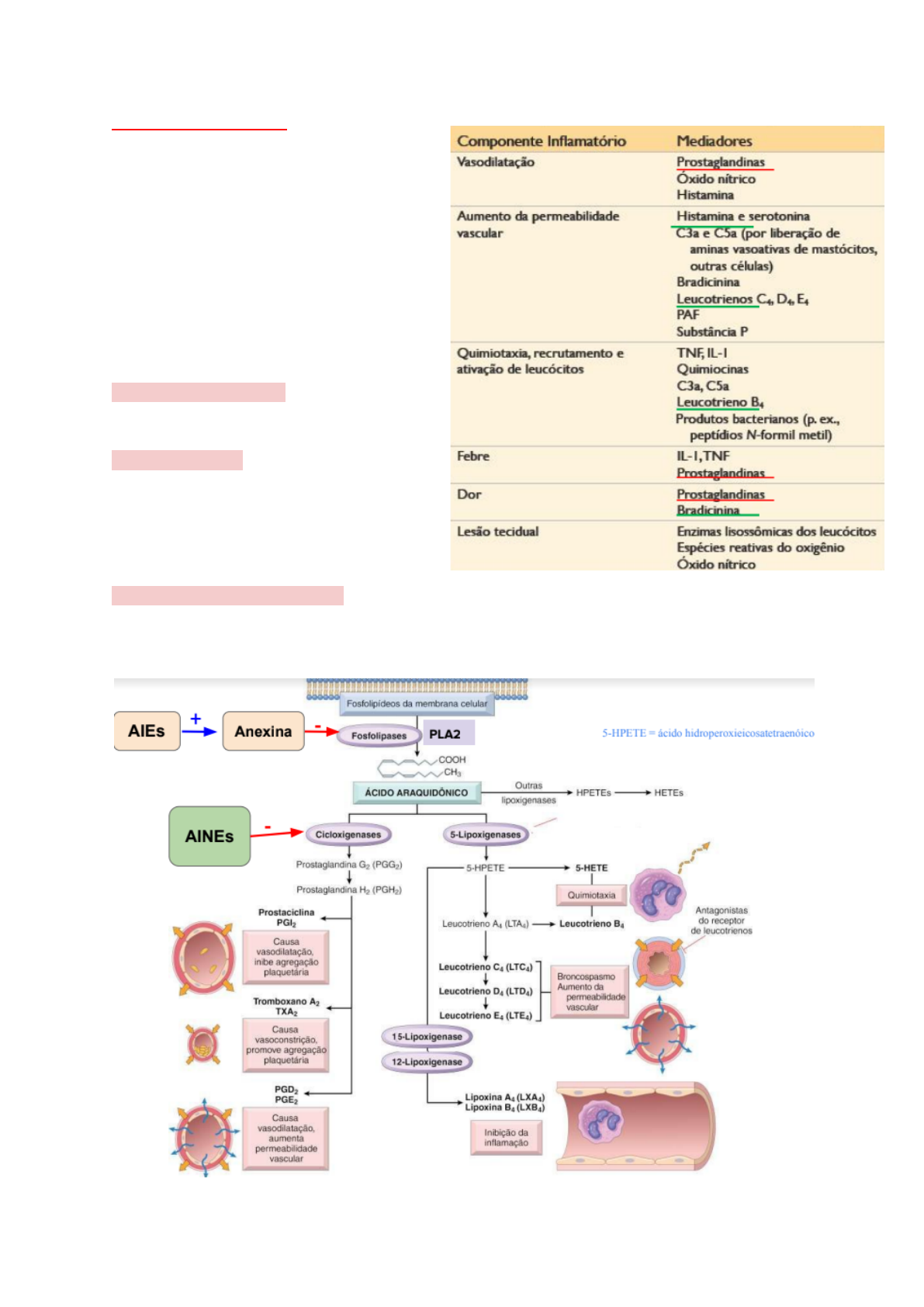 ANTI-INFLAMATÓRIO ● INFLAMAÇÃO AGUDA Vasodilatação – rubor- ; permeabilidade vascular - tumor- ; ação de citocinas SNC – calor; Ação nociceptores – dor A cascata de inflamação não está envolvida apenas nos sinais flogísticos da inflamação. Os produtos derivados do ácido araquidônico (AA), as COXs (cicloxigenases) são importantes: COX 1 (constitutiva)- Importante na regulação da homeostase, Estômago, rins COX 2 (induzida)- Importante no processo inflamatório e constitutivamente no endotélio, cérebro, intestinos, rins, testículos, ovários, tireóide, pâncreas. INFLAMAÇÃO E PROTEÇÃO COX-3 (isoforma da COX-1)- Encontrada no cérebro (FEBRE), na medula espinal e coração ● SUBDIVISÕES ● FUNÇÕES FISIOLÓGICAS DOS PROSTANÓIDES - Efeito gastrintestinal - PGE e PGI - nas células epiteliais estimulam a produção de muco e bicarbonato - PGE e PGI - nas células parietais inibem a bomba de H+ - Efeito Renal - PGE e PGI - vasodilatação compensatória na arteríola aferente em resposta à vasoconstritores como norepinefrina e angiotensina II - PGE - inibe reabsorção de Na na alça de Henle e ductos coletores = natriurese AINES DIMINUEM O EFEITO DE IECA, BRA, DIURÉTICOS e Beta BLOQUEADOR - Importante em pacientes com comprometimento renal, idosos, cardiopatas ou hepatopatas: ● ANTI-INFLAMATÓRIOS NÃO ESTEROIDAIS (AINEs) Fármacos que apresentam propriedades analgésicas, antipiréticas e anti-inflamatórias usados no tratamento dos sintomas da inflamação. Podem ser atípicos (pouco efeito anti-inflamatório) e típicos, podendo ser seletivos (inibem COX 2) ou não seletivos (inibem COX 1 e COX 2) EFEITO ANALGÉSICO: Os AINES diminuem as ações das prostaglandinas diminuindo a sensibilidade dos nociceptores periféricos. EFEITO ANTIPIRÉTICO: IL-1, IL-6, TNF-α no hipotálamo induzem produção de PGE2 que aumentam a taxa de disparos dos neurônios alterando a termorregulação. No hipotálamo a temperatura “considerada normal” aumenta causando febre. - AINEs atípicos (AAS, dipirona e paracetamol) ÁCIDO ACETILSALICÍLICO (AAS) AINE MAIS PRESCRITO - BLOQUEIO IRREVERSÍVEL DA COX-1 (MODIFICA A ENZIMA)- lesão gástrica Atípico seletivo em baixas doses USOS Dor leve a moderada: cefaléia, mialgia Antitérmico Antiagregante plaquetário (doses baixas) Contra indicados em caso de suspeita de dengue Anti-inflamatório (doses de 1g) → Muito usado como anti-agregante plaquetário (de 100 até 325 mg) • Pacientes que sofreram eventos trombóticos: - IAM - AVE - TEP • Pacientes com alto risco de trombos: - Com fibrilação atrial (comum em idosos) - Ataque isquêmico transitório Uso crônico de AAS: para cirurgias, suspender o uso ~10 dias antes do procedimento ****CONTRAINDICADO PARA CRIANÇAS**** - Síndrome de Reye Disfunção mitocondrial associada a encefalopatia e esteatose hepática microvesicular. Associada a infecções virais. AAS pode causar ainda: - Úlceras e hemorragias gástricas, nefrotoxicidade e lesão hepática - Exacerbação da asma (5-10%) - Deslocamento da via aumentando a conversão da LOX e aumento da produção de leucotrieno e consequentemente causando broncoespasmo - Alergias - Intoxicação (em altas doses – barreira hematoencefálica) Não há antídotos. Controle das convulsões e ressuscitação do paciente caso ocorra parada cardiorrespiratória Administração de bicarbonato para o aprisionamento iônico PARACETAMOL (acetaminofeno) ● Atípico e não seletivo ● Muito utilizado como antipirético (COX-3?) e analgésico ● Pouco efeito anti-inflamatório ● Menos efeito em plaquetas e TGI - Extremamente hepatotóxico (cuidado com a dose) → Não exceder 4 g/dia Tratamento na intoxicação por paracetamol: - Lavagem gástrica com ou sem carvão ativado - N-acetilcisteína DIPIRONA ● Muito utilizado como antipirético (COX-3?) e analgésico ● Pouco efeito anti-inflamatório ● Sem risco elevado de lesão hepática (paracetamol) Chance (remota) de causar: - agranulocitose (redução de neutrófilos, basófilos, eosinófilos) - aplasia medular (deficiência medular) Hipotermia pode ocorrer - AINEs típicos não seletivos EFEITOS ADVERSOS DE AINES TÍPICOS NÃO SELETIVOS - Formação de úlcera péptica →Reduzem PGs Incidência - 20-40% Atenção redobradas aos pacientes que fazem uso de AINEs por tempo prolongado Ibuprofeno < diclofenaco < naproxeno < indometacina < piroxicam - Lesão renal - Os AINEs podem causar Insuficiência Renal Aguda (hemodinamicamente induzida) - Uso crônico ou abusivo pode causar nefropatia analgésica - AINEs típicos altamente seletivos para COX 2 ● ANTI-INFLAMATÓRIOS ESTEROIDAIS - AIEs ou GLICOCORTICÓIDES Aumenta a aldosterona (reabsorve Na e H2O e elimina K) causa edema Cortisol → Glicocorticóide Endógeno. A produção de cortisol está relacionada a diversos fatores: Estresse, hipoglicemia, sono, emoções, frio, dor excessiva, traumatismos, queimaduras, hipovolemia, choque, cirurgias PARA EVITAR EFEITOS ADVERSOS RELACIONADOS À SUPRESSÃO DO EIXO Hipotálamo hipófise adrenal (HHA): • Dose única matutina; • GC de meia-vida curta ou intermediária; • GC meia-vida longa em dias alternados (exceto enfermos reumáticos); • Pulsoterapia para pacientes graves (metilprednisolona 15 a 20mg/kg/dose por três dias) • Via oral preferível - IM tem biodisponibilidade variável; • Via tópica preferível em enfermidades dermatológicas, respiratórias, intestinais (enemas), oculares. • Deve haver redução lenta e gradual em usuários crônicos (desmame); SÍNDROME DA RETIRADA ABRUPTA DOS GC ● Aparecimento de sintomas físicos ou psíquicos: - Físicos: anorexia, náuseas, vômitos, letargia, cefaléia, artralgias, mialgias, fraqueza, perda de peso, hipotensão postural, taquicardia, descamação da pele e febre - Psíquicos: mudanças do humor, labilidade emocional, delírio e estados psicóticos ● Restabelecimento da doença de base ● CASO CLÍNI