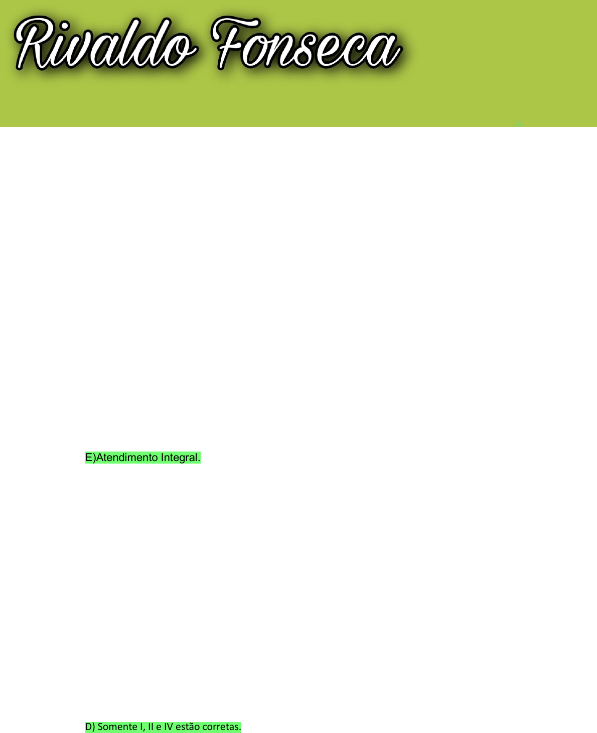 POLÍTICAS DE SAÚDE 1: O Sistema Único de Saúde (SUS) é um dos maiores sistemas de saúde público do mundo e foi criado em 1988 para garantir o acesso à saúde de qualidade para todos os brasileiros. O SUS possui desde atendimento ambulatorial até transplantes de alta complexidade. No SUS os usuários têm direito a serviços de promoção, proteção e recuperação da saúde. Qual diretriz do SUS o texto se refere? A) Universalidade. B) Igualdade. C) Descentralização. D) Participação da Comunidade. E)Atendimento Integral. 2: Os três componentes da Seguridade Social adotada pela Constituição Federal são: I.A Saúde Pública. II. A Previdência Social. III. O Sistema Único de Saúde. IV. Assistência Social. A) Somente I e III estão corretas. B) Somente II e III estão corretas. C) Somente I, II e III estão corretas. D) Somente I, II e IV estão corretas. E) Somente II, III e IV estão corretas. 3: Durante o período de Ditadura Militar, entre 1964 e 1985, a saúde não era considerada um direito humano. O governo comandava em regime autoritário e o incentivo à privatização era a politica central, o que em relação à saúde privilegiava a classe trabalhadora. Analise as afirmativas a seguir sobre o modelo de assistência médica oferecida na época: I. A direta participação do governo no atendimento à saúde da população foi substancialmente reduzida II. A Assistência Médica era realizada apenas para quem tinha carteira de trabalho assinada, sendo que os que estavam fora desse cenário eram atendidos de maneira superficial, sem o adequado financiamento do Estado. III. O Estado repassava os recursos financeiros destinados à saúde para as instituições privadas, mas também investia grande parte desses recursos na Saúde Pública. Responda: A) Todas são falsas. B) l e ll são verdadeiras. C) I e III são verdadeiras. D) Somente Il é verdadeira. E) Todas são verdadeiras. 4: Os Sistemas de Saúde são entendidos como o conjunto de todas as instituições públicas e privadas existentes para melhorar, manter ou restabelecer a saúde. Os seus papéis são diversos, mas relevantes para a equidade, participação social, resposta às necessidades individuais e sociais, e capacidade de lidar com crises. Sob o lema "investir em Saúde é investir no desenvolvimento humano, no bem-estar social e na prosperidade", as nações debatem os valores, objetivos e o impacto na saúde, na economia e na sociedade, do investimento em sistemas de saúde eficientes. A seguir serão apresentadas algumas questões relevantes para o planejamento e avaliação de sistemas de saúde. Analise-as e aponte uma delas que não é pertinente ao tema. A) O uso de serviços de saúde pode impactar positivamente a saúde das populações, prevenindo a ocorrência e, mesmo, erradicando algumas doenças (por exemplo, doenças imunopreviníveis); reduzindo a mortalidade por causas específicas e aumentando as taxas de sobrevivência (por exemplo, tratamentos para alguns tipos de câncer). B) Os Sistemas de Saúde têm um impacto fundamental no nível de saúde das populações e no desenvolvimento econômico, na coesão social, na competitividade e na produtividade das nações. C) Serviços de saúde devem responder às demandas populacionais que resultam da conjugação de fatores sociais, individuais e culturais. Para isso, faz-se necessário o conhecimento do padrão de consumo de serviços de saúde. D) As demandas por serviços de saúde refletem nível de saúde de uma população. Quanto maior a demanda, piores são os indicadores de morbidade e mortalidade encontrados na localidade. Espaços geográficos com condições sociais ideais, apresentam menor consumo de serviços de saúde e os gastos implementados pelo governo e pelo setor privado também são comparativamente menores. E) No uso de serviços de saúde devem ser considerados os fatores de capacitação, os quais se referem à capacidade de um indivíduo procurar e receber serviços de saúde. Eles estão diretamente ligados, por um lado, às condições econômicas individuais e familiares e, por outro, à oferta de serviços na comunidade onde o indivíduo reside. Esses fatores incluem renda, planos de saúde, suporte familiar, disponibilidade, proximidade e quantidade de serviços ofertados. 5: No início do século XX, a cidade do Rio de Janeiro apresentava um quadro caótico, caracterizado pela presença de diversas doenças graves que acometiam a população. Este quadro gerou sérias consequências no seguinte setor do país: I. A Saúde. II. A Marinha. III. O Comércio Exterior. IV. A Agricultura. Está correto o que se afirma em: A) Somente I. B) Somente II. C) Somente III. D) Somente IV. E) Somente II e IV. 6: O que é o Sistema Único de Saúde (SUS)? A) É a prestação de saúde para os indivíduos trabalhadores no território nacional. B) É a assistência à saúde da população brasileira. C) É o conjunto de ações e serviços de saúde prestados por órgãos e instituições públicas federais, estaduais e municipais, da administração direta e indireta e das fundações mantidas pelo poder público e complementarmente pelo setor privado. D) É um conjunto de ações e estratégias que visam o desenvolvimento de atividades de promoção e recuperação da saúde de toda a população brasileira. E) Todas as alternativas acima estão incorretas. 7: A Conferência Internacional sobre Cuidados Primários de Saúde, reunida em Alma Ata em 19 expressou a necessidade de ação de todos os governos e de todos que trabalham nos campos da saúde e desenvolvimento, a fim de promover a saúde de todos os povos do Mundo. Os Cuidados Primários de Saúde baseiam-se em: A) Liberação de recursos financeiros e acompanhamento da execução das ações preventivas de saúde. B) Prestação de contas como pré-requisito para concessão de auxilio aos países pobres. C) Instruções das entidades internacionais e publica