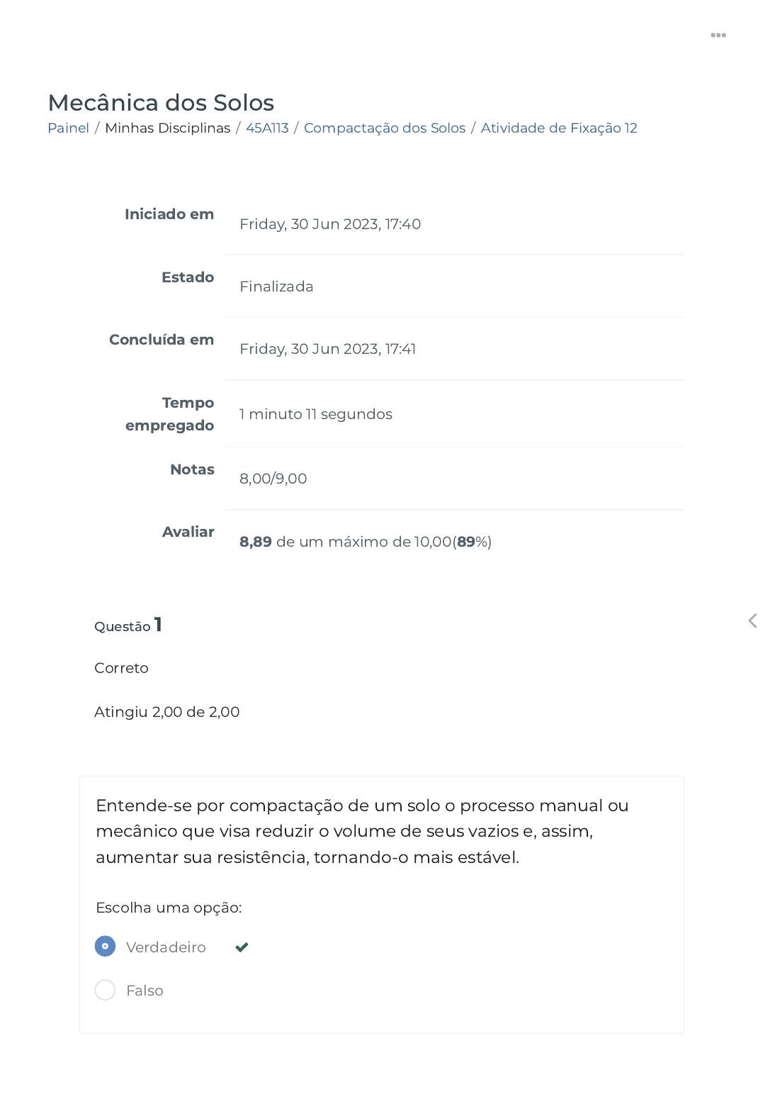 Painel / Minhas Disciplinas / 45A113 / Compactação dos Solos / Atividade de Fixação 12 Mecânica dos Solos Iniciado em Friday, 30 Jun 2023, 17:40 Estado Finalizada Concluída em Friday, 30 Jun 2023, 17:41 Tempo empregado 1 minuto 11 segundos Notas 8,00/9,00 Avaliar 8,89 de um máximo de 10,00(89%) Questão 1 Correto Atingiu 2,00 de 2,00 Entende-se por compactação de um solo o processo manual ou mecânico que visa reduzir o volume de seus vazios e, assim, aumentar sua resistência, tornando-o mais estável. Escolha uma opção: Verdadeiro Falso https://ava.politecnicabr.com.br/my/ https://ava.politecnicabr.com.br/course/view.php?id=1071 https://ava.politecnicabr.com.br/course/view.php?id=1071#section-14 https://ava.politecnicabr.com.br/mod/quiz/view.php?id=32867 https://ava.politecnicabr.com.br/ https://ava.politecnicabr.com.br/ Questão 2 Correto Atingiu 1,00 de 1,00 A Norma Brasileira de ensaio de compactação prevê as seguintes alternativas de ensaio. Exceto: Escolha uma opção: a. Ensaio em solo com pedregulho, pois, quando o solo apresenta quantidade considerável de pedregulho, a sua compactação em cilindro com 10 cm de diâmetro impõe di�culdades. Assim, a norma NBR 7182/86 indica que a compactação seja feita num cilindro com volume de 12.085 cm³ e o solo é compactado em cinco camadas, aplicando-se 12 golpes por camada, com um soquete de 4,536 kg e altura de queda de 45,7 cm. b. Ensaio sem reuso do material, que pode ser feito com amostras virgens para cada ponto da curva. Embora exija maior quantidade de material, o resultado é mais con�ável. Em alguns casos, é imprescindível que assim seja feito, por exemplo, quando as partículas são facilmente quebradiças, de tal maneira que a amostra para o segundo ponto já se mostra diferente da original pela quebra de grãos. c. Ensaio sem secagem prévia do solo, pois a experiência tem mostrado que a secagem prévia do solo in�ui nas propriedades do solo, além de di�cultar a posterior homogeneização da umidade incorporada. d. Ensaio em solo arenoso, pois, utilizando-se da quantidade considerável de pedras, a sua compactação em cilindro com 5 cm de diâmetro impõe di�culdades. Assim, a norma NBR 7182/90 indica que a compactação seja feita num cilindro com volume de 16.085 cm³ e o solo é compactado em cinco camadas, aplicando- se 22 golpes por camada, com um soquete de 7,536 kg e altura de queda de 55,7 cm. Areia https://ava.politecnicabr.com.br/ https://ava.politecnicabr.com.br/ Questão 3 Correto Atingiu 2,00 de 2,00 A compactação de um solo visa melhorar suas características, não só quanto à resistência, mas, também, nos aspectos permeabilidade, compressibilidade e absorção d’água. Escolha uma opção: Verdadeiro Falso Areia Arenosa Areia Argilosa Argila Plástica https://ava.politecnicabr.com.br/ https://ava.politecnicabr.com.br/ Questão 4 Parcialmente correto Atingiu 1,00 de 2,00 As curvas de compactação, embora di�ram para cada tipo de solo, se assemelham quanto à forma. Na Figura abaixo indique algumas delas, para uma mesma energia de compactação (Costet-Sanglerat). https://ava.politecnicabr.com.br/ https://ava.politecnicabr.com.br/ © 2022 - Escola Politécnica Brasileira Questão 5 Correto Atingiu 2,00 de 2,00 Para comprovar se a compactação está sendo feita devidamente, deve-se determinar sistematicamente o tamanho e o peso especí�co aparente do material. Escolha uma opção: Verdadeiro Falso Entre em Contato https://www.politecnicabr.com.br 0800 084 2627 0800 084 2627 Links Úteis Dicas da nossa Diretora Acadêmica Planner de Estudos Declaração de Matrícula Orientações do AVA Abertura de Ticket Fale com o Tutor Cronograma de Estudos Manual de Estágio Manual de Competência Siga-nos nas redes sociais https://ava.politecnicabr.com.br/mod/quiz/0 https://www.politecnicabr.com.br/ https://soundcloud.com/user-501638417/sets/escola-politecnica-brasileira https://storage.googleapis.com/sirius-pubstore/semestre_plannerdeestudo%20poli.pdf https://storage.googleapis.com/sirius-pubstore/declaracao_matricula.pdf https://storage.googleapis.com/sirius-pubstore/orientacoes_ava.pdf https://storage.googleapis.com/sirius-pubstore/abertura_ticket.pdf https://storage.googleapis.com/sirius-pubstore/fale_com_tutor.pdf https://storage.googleapis.com/sirius-pubstore/cronograma_estudos.pdf https://storage.googleapis.com/sirius-pubstore/manual_estagio.pdf https://storage.googleapis.com/sirius-pubstore/manual_competencia.pdf https://www.facebook.com/politecnicabr https://www.instagram.com/politecnicabr_oficial https://ava.politecnicabr.com.br/