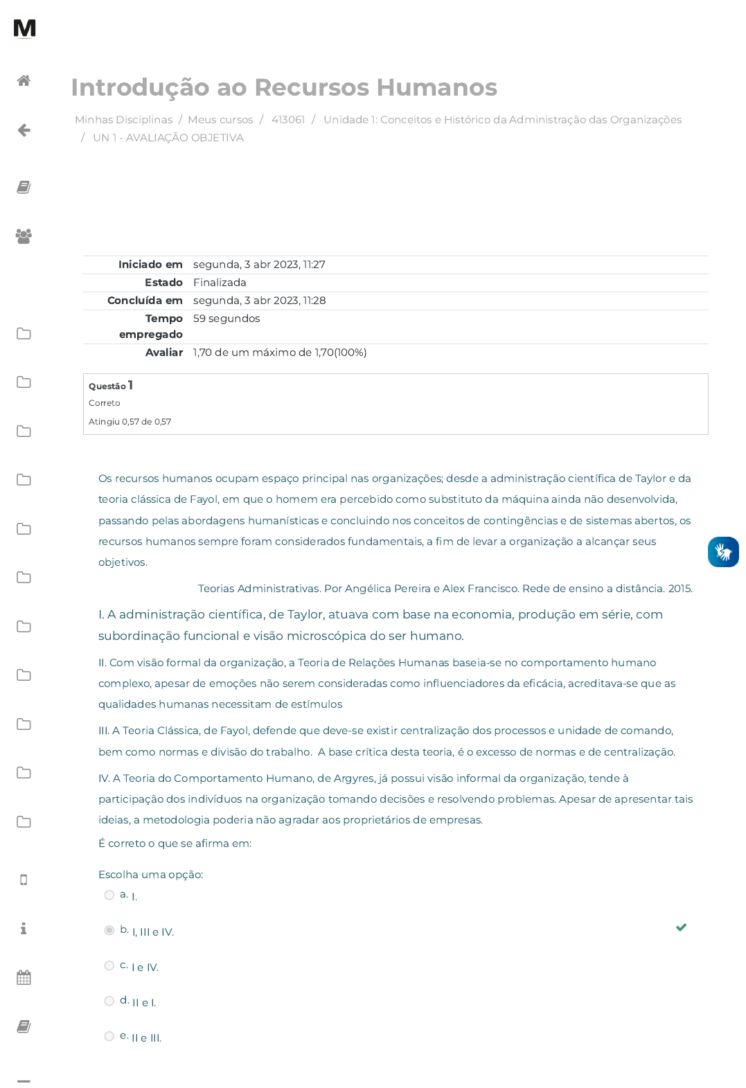 11/07/2023, 08:29 UN 1 - AVALIAÇÃO OBJETIVA: Revisão da tentativa https://avap.multivix.edu.br/mod/quiz/review.php?attempt=2666605&cmid=1314644 1/3 Minhas Disciplinas / Meus cursos / 413061 / Unidade 1: Conceitos e Histórico da Administração das Organizações / UN 1 - AVALIAÇÃO OBJETIVA Introdução ao Recursos Humanos Iniciado em segunda, 3 abr 2023, 11:27 Estado Finalizada Concluída em segunda, 3 abr 2023, 11:28 Tempo empregado 59 segundos Avaliar 1,70 de um máximo de 1,70(100%) Questão 1 Correto Atingiu 0,57 de 0,57 Os recursos humanos ocupam espaço principal nas organizações; desde a administração cientí�ca de Taylor e da teoria clássica de Fayol, em que o homem era percebido como substituto da máquina ainda não desenvolvida, passando pelas abordagens humanísticas e concluindo nos conceitos de contingências e de sistemas abertos, os recursos humanos sempre foram considerados fundamentais, a �m de levar a organização a alcançar seus objetivos. Teorias Administrativas. Por Angélica Pereira e Alex Francisco. Rede de ensino a distância. 2015. I. A administração cientí�ca, de Taylor, atuava com base na economia, produção em série, com subordinação funcional e visão microscópica do ser humano. II. Com visão formal da organização, a Teoria de Relações Humanas baseia-se no comportamento humano complexo, apesar de emoções não serem consideradas como in�uenciadores da e�cácia, acreditava-se que as qualidades humanas necessitam de estímulos III. A Teoria Clássica, de Fayol, defende que deve-se existir centralização dos processos e unidade de comando, bem como normas e divisão do trabalho. A base crítica desta teoria, é o excesso de normas e de centralização. IV. A Teoria do Comportamento Humano, de Argyres, já possui visão informal da organização, tende à participação dos indivíduos na organização tomando decisões e resolvendo problemas. Apesar de apresentar tais ideias, a metodologia poderia não agradar aos proprietários de empresas. É correto o que se a�rma em: Escolha uma opção: a. I. b. I, III e IV. c. I e IV. d. II e I. e. II e III. https://avap.multivix.edu.br/my/ https://avap.multivix.edu.br/course/view.php?id=20064 https://avap.multivix.edu.br/course/view.php?id=20064§ion=2 https://avap.multivix.edu.br/mod/quiz/view.php?id=1314644 https://avap.multivix.edu.br/my/ https://avap.multivix.edu.br/course/view.php?id=20064 https://avap.multivix.edu.br/user/index.php?id=20064 https://avap.multivix.edu.br/course/view.php?id=20064§ion=1 https://avap.multivix.edu.br/course/view.php?id=20064§ion=2 https://avap.multivix.edu.br/course/view.php?id=20064§ion=3 https://avap.multivix.edu.br/course/view.php?id=20064§ion=4 https://avap.multivix.edu.br/course/view.php?id=20064§ion=5 https://avap.multivix.edu.br/course/view.php?id=20064§ion=6 https://avap.multivix.edu.br/course/view.php?id=20064§ion=7 https://avap.multivix.edu.br/course/view.php?id=20064§ion=8 https://avap.multivix.edu.br/course/view.php?id=20064§ion=9 https://avap.multivix.edu.br/course/view.php?id=20064§ion=10 https://avap.multivix.edu.br/course/view.php?id=20064§ion=11 https://avap.multivix.edu.br/hooks/portal/ https://avap.multivix.edu.br/mod/page/view.php?id=1252%2F%22%20target%3D%22_blank https://avap.multivix.edu.br/calendar/view.php/ https://avap.multivix.edu.br/local/staticpage/view.php?page=biblioteca https://portalweb.multivix.edu.br/gabaritos/login.aspx https://avap.multivix.edu.br/ 11/07/2023, 08:29 UN 1 - AVALIAÇÃO OBJETIVA: Revisão da tentativa https://avap.multivix.edu.br/mod/quiz/review.php?attempt=2666605&cmid=1314644 2/3 Questão 2 Correto Atingiu 0,57 de 0,57 A Teoria das Relações Humanas surgiu nos Estados Unidos como consequência das conclusões da Experiência em Hawthorne, desenvolvida por Elton Mayo e seus colaboradores. Foi um movimento de reação e de oposição à Teoria Clássica da Administração. A consequência desta teoria foi uma quebra de paradigma em relação aos princípios da Teoria de Administração Cienti�ca de Frederick Winslow Taylor (1856-1915), incluindo variáveis comportamentais dos indivíduos na execução de atividades e retirando a tendência de desumanização do trabalho com aplicação de métodos cientí�cos e precisos e tem o objetivo de entender a in�uência da iluminação na produtividade do colaborador. Comprovou-se a preponderância do fator psicológico sobre o fator �siológico. CHIAVENATO, R. Introdução á Teoria Geral da Administração. 6ª Ed. Rio de Janeiro, 2000.Adaptada. Sobre as origens da teoria das Relações Humanas. Assinale a opção que descreve corretamente uma dessas funções, denominada de função administrativa: Escolha uma opção: a. As idéias da �loso�a pragmática de Elton John e da Psicologia dinâmica de Michael Jackson. b. De necessidade de celular, de participação em grupos de contato; de autocon�ança; de beleza interior. c. “homo economicus” = homem primata. d. A necessidade de humanizar e democratizar a Administração. e. O desenvolvimento da tecnologia por Jonas Marra. https://avap.multivix.edu.br/my/ https://avap.multivix.edu.br/course/view.php?id=20064 https://avap.multivix.edu.br/user/index.php?id=20064 https://avap.multivix.edu.br/course/view.php?id=20064§ion=1 https://avap.multivix.edu.br/course/view.php?id=20064§ion=2 https://avap.multivix.edu.br/course/view.php?id=20064§ion=3 https://avap.multivix.edu.br/course/view.php?id=20064§ion=4 https://avap.multivix.edu.br/course/view.php?id=20064§ion=5 https://avap.multivix.edu.br/course/view.php?id=20064§ion=6 https://avap.multivix.edu.br/course/view.php?id=20064§ion=7 https://avap.multivix.edu.br/course/view.php?id=20064§ion=8 https://avap.multivix.edu.br/course/view.php?id=20064§ion=9 https://avap.multivix.edu.br/course/view.php?id=20064§ion=10 https://avap.multivix.edu.br/course/view.php?id=20064§ion=11 https://avap.multivix.edu.br/hooks/portal/ https://avap.