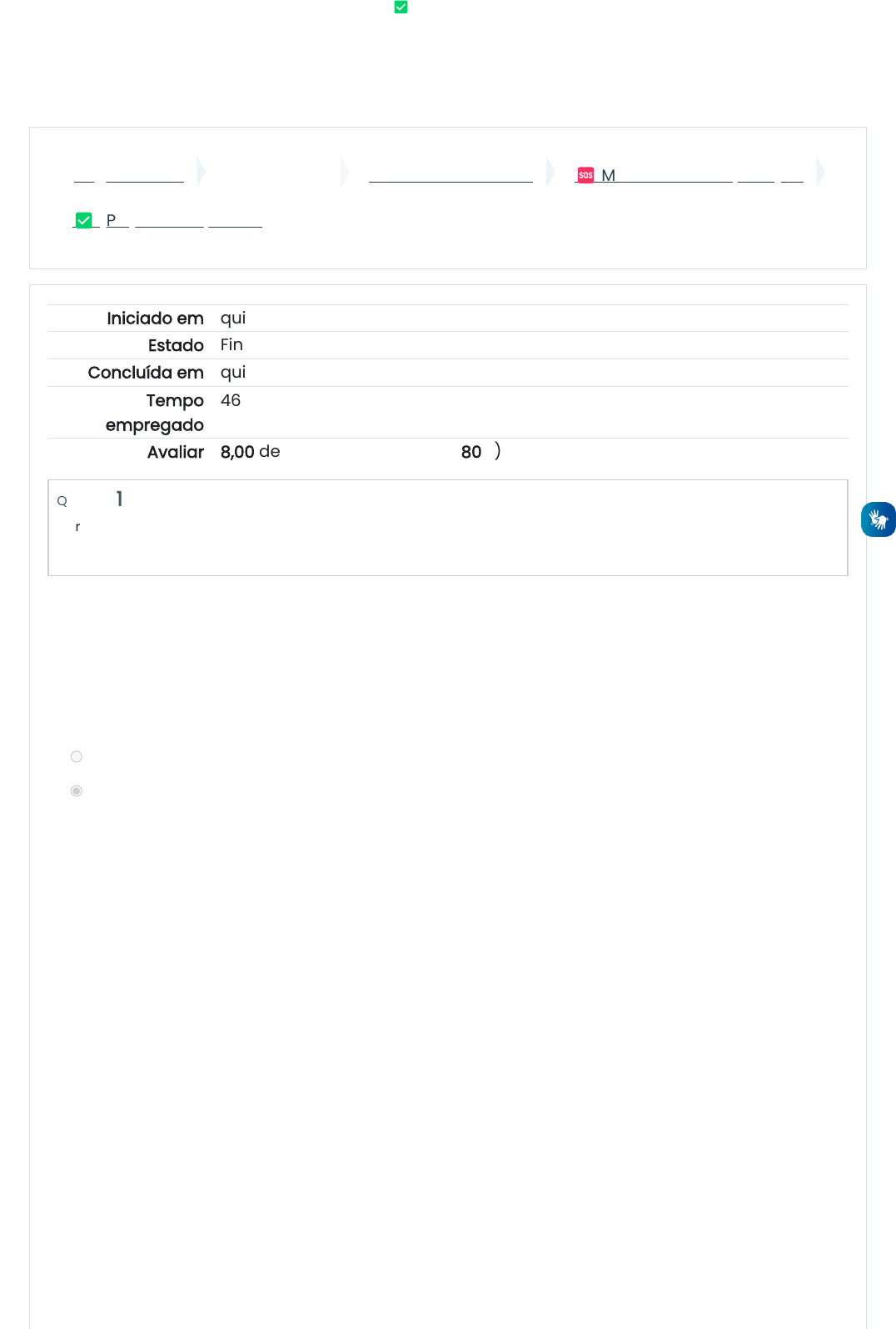 18/05/2023, 17:09 ✅ [PO] Prova Optativa: Revisão da tentativa https://ava.ufms.br/mod/quiz/review.php?attempt=638587&cmid=616931#question-745964-10 1/6 Página inicial Meus cursos 32010001906-2023-1 🆘 Módulo de Recuperação ✅ [PO] Prova Optativa Iniciado em quinta, 18 mai 2023, 16:24 Estado Finalizada Concluída em quinta, 18 mai 2023, 17:11 Tempo empregado 46 minutos 57 segundos Avaliar 8,00 de um máximo de 10,00(80%) Questão 1 Correto Atingiu 1,00 de 1,00 As operações mais básicas em listas lineares são as operações de busca, inserção e remoção. O custo dessas operações é o mesmo, independente do tipo de lista linear (simples ou encadeada). Escolha uma opção: Verdadeiro Falso Tamanho da fonte A- A A+ Cor do site R A A A https://ava.ufms.br/ https://ava.ufms.br/course/view.php?id=44592 https://ava.ufms.br/course/view.php?id=44592#section-7 https://ava.ufms.br/mod/quiz/view.php?id=616931 18/05/2023, 17:09 ✅ [PO] Prova Optativa: Revisão da tentativa https://ava.ufms.br/mod/quiz/review.php?attempt=638587&cmid=616931#question-745964-10 2/6 Questão 2 Correto Atingiu 1,00 de 1,00 Questão 3 Correto Atingiu 1,00 de 1,00 O pseudocódigo abaixo manipula um vetor V de n elementos. V = [ ] soma = 0 for i in range( n ): if V[i] == 0: break soma = soma + V[i] Escolha a alternativa que apresenta a complexidade de melhor caso deste algoritmo. a. O( 2*n ) b. O( 1 ) c. O( n ) d. O( 3*n ) e. O( n*n ) Dada um mesmo vetor de inteiros V e dois algoritmos de ordenação X e Y quaisquer (recursivos e não recursivos), os algoritmos X e Y realizarão a mesma quantidade de comparações para ordenar V. Escolha uma opção: Verdadeiro Falso Tamanho da fonte A- A A+ Cor do site R A A A 18/05/2023, 17:09 ✅ [PO] Prova Optativa: Revisão da tentativa https://ava.ufms.br/mod/quiz/review.php?attempt=638587&cmid=616931#question-745964-10 3/6 Questão 4 Correto Atingiu 1,00 de 1,00 Questão 5 Correto Atingiu 1,00 de 1,00 Considerando o código abaixo (escrito na linguagem Python), escolha a alternativa que apresenta uma afirmação correta. Soma = 0 Cont = 0 arq = open(“Inteiros.txt”, “r”) S = arq.readline() while S != “”: N = int(S) Soma = Soma + N Cont = Cont + 1 print(“Elemento {0} = {1}”.format(Cont, N)) S = arq.readline() arq.close() print(“\nSoma = {0}”.format(Soma)) a. Esse programa lê um arquivo e totaliza os valores encontrados. Essa é a única maneira de implementar um programa com esse objetivo. b. A implementação desse mesmo código utilizando um iterador de arquivo ficaria mais enxuta. Entretanto, códigos enxutos não fazem parte do estilo de programação em Python. c. Se esse mesmo código fosse implementado usando um iterador de arquivo, o programa ficaria menos enxuto e mais pesado. d. O programa lê um arquivo binário contendo uma sequência de valores binários em cada linha. e. Esse programa lê um arquivo e totaliza os valores encontrados. Seria possível implementar um programa com o mesmo objetivo utilizando o conceito de iterador de arquivo. Uma das diferenças da implementação das operações com fila em relação às operações com pilha é que, no caso da fila, é necessário manter uma marcação do início e do fim da estrutura. Já na pilha, a marcação principal é no topo. Escolha uma opção: Verdadeiro Falso Tamanho da fonte A- A A+ Cor do site R A A A 18/05/2023, 17:09 ✅ [PO] Prova Optativa: Revisão da tentativa https://ava.ufms.br/mod/quiz/review.php?attempt=638587&cmid=616931#question-745964-10 4/6 Questão 6 Incorreto Atingiu 0,00 de 1,00 Questão 7 Correto Atingiu 1,00 de 1,00 Considere as seguintes afirmações em relação à análise de complexidade de algoritmos. 1. O objetivo dos métodos analíticos é determinar uma expressão matemática que represente o comportamento de tempo de um algoritmo. 2. Métodos analíticos medem o tempo de execução de um algoritmo independente do computador utilizado. 3. Medir o tempo de execução de um algoritmo em um computador específico pode acabar fornecendo uma análise de tempo limitada. 4. Ao calcular a complexidade assintótica de um algoritmo, é possível concluir de maneira direta quando será o tempo de execução (em segundos) desse algoritmo. Escolha a alternativa que apresenta TODAS as sentenças corretas. a. 1 e 2. b. 4. c. 1, 2 e 3. d. 1 e 4. e. 2 e 3. Em geral, os algoritmos recursivos realizam chamadas para si próprio e passam por parâmetro uma nova entrada, que geralmente é maior que a entrada anterior. Ou seja, a cada chamada recursiva o tamanho da entrada aumenta, e essa é a dinâmica que levará ao término da recursão. Escolha uma opção: Verdadeiro Falso Tamanho da fonte A- A A+ Cor do site R A A A 18/05/2023, 17:09 ✅ [PO] Prova Optativa: Revisão da tentativa https://ava.ufms.br/mod/quiz/review.php?attempt=638587&cmid=616931#question-745964-10 5/6 Questão 8 Correto Atingiu 1,00 de 1,00 Questão 9 Incorreto Atingiu 0,00 de 1,00 Em relação aos algoritmos de ordenação por intercalação e ordenação rápida, escolha uma alternativa que contenha uma sentença correta. a. Tanto a ordenação por intercalação quanto a ordenação rápida são versões modificadas do algoritmo de ordenação por bolha. b. O algoritmo de ordenação por intercalação divide a lista em dois pedaços de tamanhos aleatórios. c. A ideia básica do algoritmo de ordenação por intercalação é intercalar as duas metades de uma lista quando essas duas metades estão desordenadas. d. O algoritmo de ordenação rápida descobrirá um pivô para dividir a lista em dois pedaços, mas não há garantias de que esse pivô será o elemento no centro da lista (mediana). e. Intercalar duas listas já ordenadas é um procedimento similar ao algoritmo de particionamento utilizado na ordenação rápida. O código abaixo tenta resolver o problema de Fibonacci. def fib( n ): if n == 0: return 0 else if n == 1: return 1 else return fib( n-1 ) + fib( n-2 ) Em relação a essa s