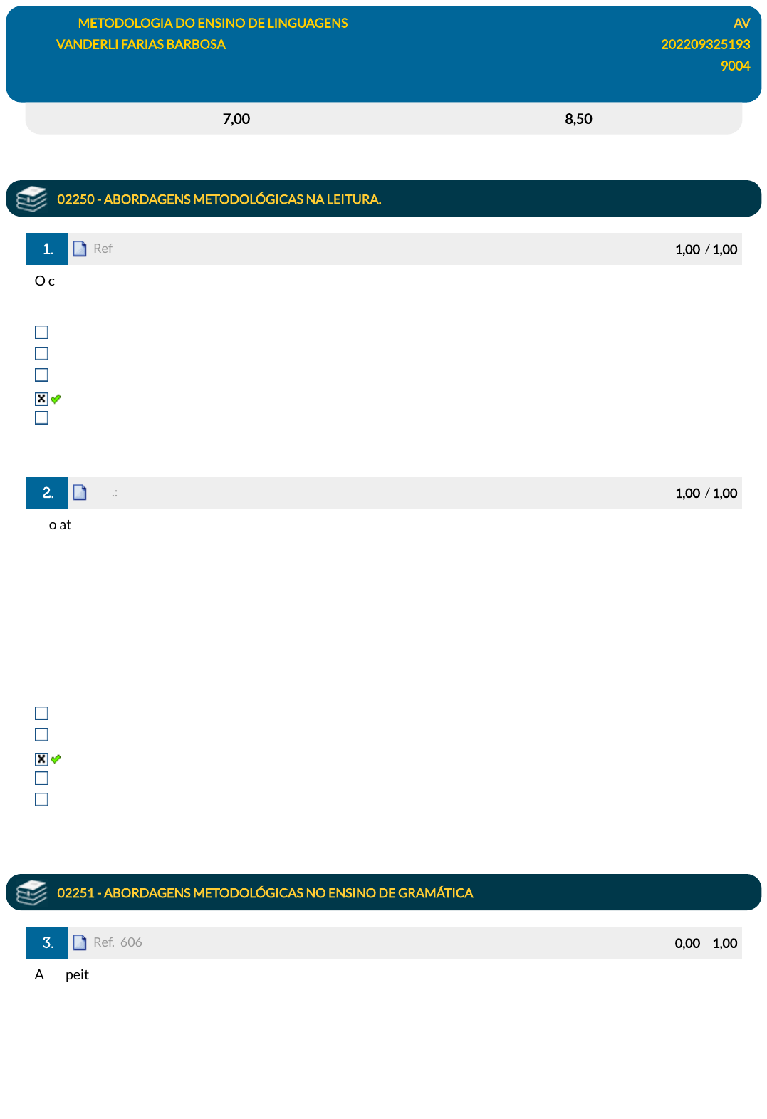 10/07/2023, 15:12 EPS https://simulado.estacio.br/alunos/ 1/4 Disciplina: METODOLOGIA DO ENSINO DE LINGUAGENS AV Aluno: VANDERLI FARIAS BARBOSA 202209325193 Turma: 9004 DGT0758_AV_202209325193 (AG) 25/03/2023 17:16:44 (F) Avaliação: 7,00 pts Nota SIA: 8,50 pts 02250 - ABORDAGENS METODOLÓGICAS NA LEITURA. 1. Ref.: 6080151 Pontos: 1,00 / 1,00 O cânone literário deve ser sempre revisto e ampliado, porque não tem a mesma qualidade das obras atuais. é composto de obras cujas linguagens estão ultrapassadas. os livros são de difícil acesso. foi composto por valores, critérios e hierarquias que nem sempre atraem o jovem leitor iniciante. cada leitor deve ler as obras de seu tempo histórico. 2. Ref.: 6080149 Pontos: 1,00 / 1,00 São atividades produtivas para o estímulo da leitura em sala de aula: I ¿ A cópia integral de textos literários. II ¿ A releitura das obras literárias por meio de dramatizações. III ¿ A substituição das obras originais por versões em histórias em quadrinhos. IV ¿ A comparação e a relação com versões fílmicas dos textos literários. Assinale a alternativa correta. Somente II e IV são atividades produtivas. Somente III são atividades produtivas. Somente I, II e IV são atividades produtivas. I, II, III e IV são atividades produtivas. Somente I e II são atividades produtivas. 02251 - ABORDAGENS METODOLÓGICAS NO ENSINO DE GRAMÁTICA 3. Ref.: 6063414 Pontos: 0,00 / 1,00 A respeito da competência gramatical, analise as a�rmativas a seguir: I. A tese comportamentalista a�rma que a competência gramatical é adquirida no meio em que a criança cresce e interage verbalmente. II. Para os gerativistas, o conhecimento internalizado da língua permite aos falantes intuir sobre construções agramaticais. javascript:alert('C%C3%B3digo da quest%C3%A3o: 6080151.'); javascript:alert('C%C3%B3digo da quest%C3%A3o: 6080149.'); javascript:alert('C%C3%B3digo da quest%C3%A3o: 6063414.'); 10/07/2023, 15:12 EPS https://simulado.estacio.br/alunos/ 2/4 III. A gramática explícita está relacionada com a tese inatista da linguagem e corresponde ao que é internalizado da língua. Está correto o que se a�rma em: III, apenas. I e II, apenas. II, apenas. I e III, apenas. I, apenas. 4. Ref.: 6063415 Pontos: 1,00 / 1,00 Sobre os tipos de gramática, analise as a�rmativas a seguir: I. Os gregos fundaram a gramática normativa, relacionando a linguagem ao pensamento e à realidade. II. Existem vários tipos de gramática, como a normativa, descritiva, histórica e comparada. III. A gramática descritiva pode ser de�nida como um conjunto de regras que devem ser seguidas. IV. A gramática normativa não leva em conta a variação linguística. Está correto o que se a�rma em I e III, apenas. I, II, III e IV. I e II, apenas. I, II e IV, apenas. I e IV, apenas. 03125 - RECURSOS DIDÁTICOS E ENSINO DE LÍNGUA 5. Ref.: 6074915 Pontos: 1,00 / 1,00 (ENADE / 2014) Em relação ao uso das Tecnologias da Informação e da Comunicação (TIC) na leitura e na escrita, assinale a opção correta. A leitura e escrita tornaram-se mais a acessíveis devido às tecnologias digitais, as quais provocaram distanciamento de textos impressos e instauraram o "internetês" como linguagem o�cial. A diminuição das distâncias espaciais e temporais intensi�cou e diversi�cou os modos de comunicação e informação, �exibilizando a formação de leitores de modo mais abrangente e super�cial. Os leitores da atualidade descartaram os materiais impressos em prol das facilidades dos repositórios digitais, como os tablets, que dinamizam os processos da leitura e da escrita. Os avanços tecnológicos promoveram mudanças signi�cativas nos modos de ler e escrever, favorecendo, principalmente no ato da leitura, a capacidade de unir diferentes linguagens para a construção da signi�cação. As mudanças proporcionadas pela tecnologia nas maneiras de ler, de produzir e de fazer circular textos nas sociedades desconsideram não só outras formas de ler e escrever, mas também outros suportes de circulação. 6. Ref.: 6074913 Pontos: 0,00 / 1,00 javascript:alert('C%C3%B3digo da quest%C3%A3o: 6063415.'); javascript:alert('C%C3%B3digo da quest%C3%A3o: 6074915.'); javascript:alert('C%C3%B3digo da quest%C3%A3o: 6074913.'); 10/07/2023, 15:12 EPS https://simulado.estacio.br/alunos/ 3/4 O conceito de recursos de multimídia consiste em materiais com informação digital nos quais pode estar representada em som, vídeo e animação em conjunto com mídias tradicionais voltadas à educação. Neste sentido, o uso de recursos de multimídias se justi�ca no espaço educacional: porque ensejam que os discentes aprendam melhor quando se combinam palavras e imagens. porque relaciona as palavras e imagens. porque ativam a criatividade dos alunos por combinam palavras e imagens. porque seguram a atenção dos alunos por combinam palavras e imagens. porque são atrativos para os alunos por combinam palavras e imagens. 03230 - ESTRATÉGIAS PEDAGÓGICAS PARA O ENSINO DE LINGUAGENS 7. Ref.: 7629884 Pontos: 1,00 / 1,00 Leia o trecho a seguir: "Compreensão dos efeitos de sentidos provocados pelos usos de recursos linguísticos e multissemióticos em textos pertencentes a gêneros diversos" (BRASIL, 2018, p. 79). BRASIL. Ministério da Educação. Base Nacional Comum Curricular. Brasília, 2018. Disponível em: http://basenacionalcomum.mec.gov.br/images/BNCC_EI_EF_110518_versao�nal_site.pdf. Acesso em: 03 de fev. de 2022. Com base no texto acima, avalie as a�rmativas abaixo: I. Posts do Instagram não seriam recursos didáticos apropriados. PORQUE II. Não possibilitariam um estudo sobre os efeitos de sentido de recursos multissemióticos. As a�rmativas I. e II. estão corretas, mas II. não justi�ca I. As a�rmativas I. e II. estão corretas e II. justi�ca I. Somente a a�rmativa II. está correta. Somente a a�rmativa I. está correta. As a�rmativas I. e II. estão incorretas. 8. 
