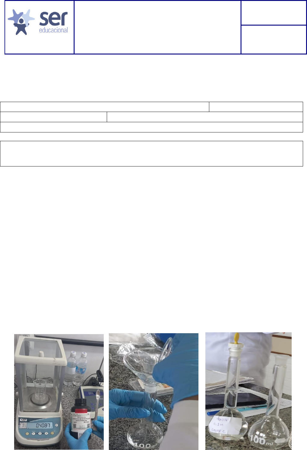 RELATÓRIO DE AULAS PRÁTICAS - EaD AULA ___ DATA: 20/05/2023 VERSÃO:01 RELATÓRIO DE AULAS PRÁTICAS: QUÍMICA ANALÍTICA QUANTITATIVA– AULA 2 DADOS DO(A) ALUNO(A): NOME: ELENIZE RAPOSO FERREIRA MATRÍCULA: 04089339 CURSO: FARMÁCIA POLO: UNAMA BR/ANANINDEUA/PA PROFESSOR(A) ORIENTADOR(A): WANDSON BRAAMCAMP TEMA DE AULA: PREPARAÇÃO E PADRONIZAÇÃO DE SOLUÇÃO NAOH 0,1 MOL/L / AFERIÇÃO DE MATERIAL VOLUMÉTRICO 1 RELATÓRIO: 1. Como preparar uma solução partindo de um soluto sólido? Para a preparação foi utilizado: Hidróxido de sódio (NaOH) e Água destilada (solvente líquido). Procedimento: 1º Calcular o soluto de NaOH a 0,1 ml/L necessário para a preparação da solução; 2º Adicionar esse soluto no Becker e pesa-lo em uma balança analítica; 3º Adicionar o solvente líquido na solução; 4º agite o Becker para homogeneizar a solução até a completa dissolução; 5º Transfira quantitativamente toda solução para um balão volumétrico de 100 ml 6º Complete o volume do balão com o solvente até o traço de aferição contido no gargalo da vidraria e vedar, e mantenha-o em temperatura ambiente; 7º guardar a solução preparada no balão volumétrico devidamente rotulado com o nome do grupo e tipo da solução preparada. RELATÓRIO DE AULAS PRÁTICAS - EaD AULA ___ DATA: 20/05/2023 VERSÃO:01 2. Qual a diferença de uma balança analítica para as demais? A balança analítica tem como diferença em relação as demais, medir pequenas massas com grande precisão. Tem mais sensibilidade e consequentemente maior exatidão e precisão, capaz de medir quatro casas decimais à direita do ponto decimal (0,0004g) e por conta da sua sensibilidade, a balança analítica deve ser sempre utilizada em ambiente totalmente fechado e neutro. Isso porque variações de temperatura, umidade, corrente de ar podem alterar significativamente os resultados de leitura. Sua principal característica é uma espécie de capela porta vidro que evita turbulência do ar e garantindo os resultados mais rápidos e precisos. Desta forma, devido a esse detalhamento e exatidão a balança analítica é usada em ambiente muito mais controlado e exige um nível de cuidado muito maior, o que não seria necessário no uso das demais balanças. Balança analítica Balança semianalítica RELATÓRIO DE AULAS PRÁTICAS - EaD AULA ___ DATA: 20/05/2023 VERSÃO:01 3. Por qual razão na pesagem de uma solução se deve utilizar uma balança de precisão? Devido a capacidade da mesma apresentar alto grau de precisão nas pesagens das soluções, medindo quantidades exatas. Permitindo a obtenção de dados confiáveis. 4. Como é feito o processo de preparo de solução para solutos sólidos? O processo é realizado através de pesagem, diluição e homogeneização. Durante a aula o processo foi realizado utilizando a massa do hidróxido de sódio (NaOH) a 0,1 mol/L, que após a realização do cálculo teve como resultado 0,4081g do soluto sólido. Com o soluto necessário para a preparação da solução, deu-se o início para a realização da pesagem da massa na balança analítica. Após isso, foi realizado a pesagem da quantidade calculada em um béquer de capacidade apropriada, em seguida foi adicionado uma quantidade aproximada de 10 mL de água destilada para homogeneizar a solução até a sua completa dissolução e em seguida com o auxílio de um funil a solução foi transferido quantitativamente para o balão volumétrico de 100mL, para retirar todo o conteúdo presente no béquer foi preciso efetuar a lavagem do béquer com pequeno volume de água destilada e transferido para o balão volumétrico e por último foi preciso completar a solução com a água destilada até o traço de aferição e homogeneizar a solução, por fim rotular a solução e guardá-la para uso posterior. 5. A calibração após o preparo da solução deve ser realizada por qual motivo? Para se obter resultados precisos, garantindo que as soluções estejam dentro das especificações exigidas e caso essa atividade seja ignorada, os erros e as incertezas durante as medições serão devastadores, transformando os valores em suposições. 6. As Vidrarias utilizadas devem ser aferidas antes do preparo por quê? Porque nelas tem níveis de incerteza, segundo o fabricante. Devido a isso, deve haver aferição das vidrarias para aumentar a precisão dos volumes contidos ou aferidos pela mesma. Uma vidraria do tipo pipeta graduada de 5ml não quer dizer que ela realmente marcará 5ml, ou seja, ela pode conter 4,98mL ou 5,08mL e tudo causa erro nos volumes medidos por essa vidraria, reduzindo a precisão e a exatidão dos resultados obtidos. RELATÓRIO DE AULAS PRÁTICAS - EaD AULA ___ DATA: 20/05/2023 VERSÃO:01 REFERÊNCIA AULA PRÁTICA. Realizada em 20 de maio de 2023 PREPARAÇÃO DE SOLUÇÕES: https://www2.ufjf.br/quimica/files/2020/03/QUI147- AULA02.pdf https://www2.ufjf.br/quimica/files/2015/06/2018-QUI126-AULA-3- SOLU%c3%87%c3%95ES-PREPARO-E-DILUI%c3%87%c3%83O-ilovepdf- compressed-1.pdf AGOSTINHO, Gelbis Martins; COSTA, Gilmar Santos. USO DE BALANÇAS PARA ENTENDIMENTO DOS TERMOS DE EXATIDÃO E PRECISÃO. https://www2.ufjf.br/quimica/files/2020/03/QUI147-AULA02.pdf https://www2.ufjf.br/quimica/files/2020/03/QUI147-AULA02.pdf https://www2.ufjf.br/quimica/files/2015/06/2018-QUI126-AULA-3-SOLU%c3%87%c3%95ES-PREPARO-E-DILUI%c3%87%c3%83O-ilovepdf-compressed-1.pdf https://www2.ufjf.br/quimica/files/2015/06/2018-QUI126-AULA-3-SOLU%c3%87%c3%95ES-PREPARO-E-DILUI%c3%87%c3%83O-ilovepdf-compressed-1.pdf https://www2.ufjf.br/quimica/files/2015/06/2018-QUI126-AULA-3-SOLU%c3%87%c3%95ES-PREPARO-E-DILUI%c3%87%c3%83O-ilovepdf-compressed-1.pdf