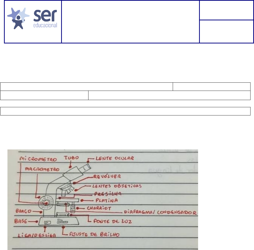RELATÓRIO DE AULAS PRÁTICAS - EaD AULA 01 DATA: ______/______/______ VERSÃO:01 RELATÓRIO DE AULAS PRÁTICAS: CITOLOGIA, HISTOLOGIA E GENÉTICA DADOS DO(A) ALUNO(A): NOME: ANA SHEYLA PINHO DE MENEZES MATRÍCULA:04104441 CURSO:FISIOTERAPIA POLO: UNAMA ALCINDO CACELA TEMA DE AULA: CONHECENDO O MICROSCÓPIO ÓPTICO RELATÓRIO: 1. Descreva as partes do microscópio óptico e como eles se classificam. O microscópio é constituído em várias partes: · Oculares: normalmente são dois sistemas de lentes (em microscópio mais simples há apenas um). Elas te poder de aumento de até 10X é por meio delas que podemos observar a imagem ampliada. · Tubo: também chamado de canhão, é o suporte das oculares. · Revolver: peça giratória que se encontra as objetivas. Para trocar de objetiva é preciso manuseá-lo, sem forçar. · Platina: Também podemos chama-la de mesa, é o suporte onde se coloca a lâmina. Ela pode ser levantada ou baixada para regular o foco, utilizando-se os reguladores macro e micrométrico. · Condensador: Concentra os raios luminosos que incidem sobre a lâmina. · Fonte de luz: lâmpada que ajuda na visualização da lâmina, nos microscópios mais antigos era um espelho que refletia a luz. · Liga/desliga: Botão que serve para ligar e desligar a lâmpada. · Macrométrico: botão regulador que permite regular a altura da platina. Faz movimentos amplos para um ajuste grosso. · Micrométrico: botão regulador que permite regular a altura da platina. Permite um ajuste fino do foco. · Braço: Também chamado de coluna, é fixo na base do microscópio e serve de suporte para as Charriot: peça que permite movimentar a lâmina sobre a platina. Não aparece na figura pois geralmente localiza-se na lateral direita do corpo do microscópio. TEMA DE AULA: TECIDO EPITELIAL RELATÓRIO: 2. Dentre as lâminas visualizadas a respeito do Tecido Epitelial, escolha duas lâminas correspondentes ao Tecido Epitelial de Revestimento e duas lâminas ao Tecido Epitelial glandular e descreva o nome do tecido ou glândula, localização no corpo humano, função e classificação. Tecido epitelial de revestimento: há três tipos básicos, cuja nomenclatura se relaciona com a forma celular: células pavimentosas, cúbicas e cilíndricas. Lâmina (Aorta)-Tecido Epitelial de Revestimento Simples pavimentoso Possuem as células achatadas com núcleos alongados e apresentam apenas uma camada, reveste o interior dos vasos sanguíneos e linfáticos, a cavidade pleural peritoneal e pericárdica. Ela se inicia no coração, na base do ventrículo esquerdo, e termina na altura da quarta vertebra lombar, onde se divide nas artérias ilíacas comuns. Ela leva o sangue oxigenado para todas as partes do corpo através da circulação sistêmica. Lâmina — (pele fina) - Tecido Epitelial de Revestimento Estratificado Pavimentoso queratinizado Apresenta suas células em camadas e são responsáveis pelo revestimento da superfície externa do corpo (epiderme) e as cavidades corporais internas. Sua principal função é de proteção. Caracteriza -se por ser um conjunto de células epiteliais poliédricas e justaposta, com o mínimo de espaço intracelular entre elas. 3. Desenhe a lâmina correspondente a Pele, descreva o nome do tecido e suas partes. A pele é um órgão dinâmico, variável. Tem três camadas principais: epiderme, derme e a hipoderme (camada subcutânea). Cada uma delas é composta por várias subcamadas. Os folículos pilosos e a glândulas sebáceas e sudoríparas, também desempenham uma função global. Epiderme: é acamada externa da pele que podemos ver e tocar, ela nos protege das toxinas, bactérias e da perda de líquidos. Ela é formada por 5 subcamadas de células chamadas queratinócitos. · Camada basal: é a camada mais interna. · Camada espinhosa: produzem queratina (fibras de proteína). · Camada granular: após a produção de grânulos duros e à medida que eles empurram para cima, estes grânulos se transformam em queratina e lipídeos epidérmicos. · Camada lúcida: as células são bem comprimidas e não se distinguem uma das outras. · Camada córnea: é a mais externa da epiderme, com uma média de 20 subcamadas. A camada córnea também abriga os poros das glândulas sudoríparas e as aberturas das glândulas sebáceas. Derme: é acamada media da pele, grossa elástica e firme composta por duas subcamadas. · Camada inferior: é uma área grossa e profunda, que forma uma fronteira líquida com a subcutânea. · Camada superior: forma uma fronteira definida em forma de onda com a derme. a derme protege o corpo das influências externas, assim como nutre as camadas externas da pele por dentro. Hipoderme: também conhecida como camada subcutânea, é a mais interna da nossa pele armazena energia enquanto protege e isola termicamente o nosso corpo. É composta principalmente de: · Células adiposas( adipócitos) · Fibras especiais de colágeno (septos tissulares) · Vasos sanguíneos. TEMA DE AULA: DIVISÃO CELULAR RELATÓRIO: 4. Diante da lâmina de corte de cebola visualizada no laboratório, desenhe e nomeei os eventos da divisão celular (mitose). Fases da mitose da raiz de cebola. (1) interfase (2) prófase, (3) metáfase, (4) anáfase e Telófase . (5) A mitose tem quatro fases: prófase, metáfase, anáfase e telófase. Os cromossomos Se duplicam na interfase, assim sendo, na primeira fase da divisão os cromossomos já estão duplicados. • Prófase: os cromossomos se condensam passando da forma difusa observada na Interfase para estruturas altamente empacotadas características da célula em divisão. Em microscopia óptica não é possível definir com precisão a transição de interfase para prófase. Considera-se que a célula está em prófase quando os cromossomos se condenssam a ponto de se tornarem visíveis em microscopia óptica. As cromátides irmãs estão unidas pelo centrômero (que também estão duplicados). • Metáfase: os cromosso
