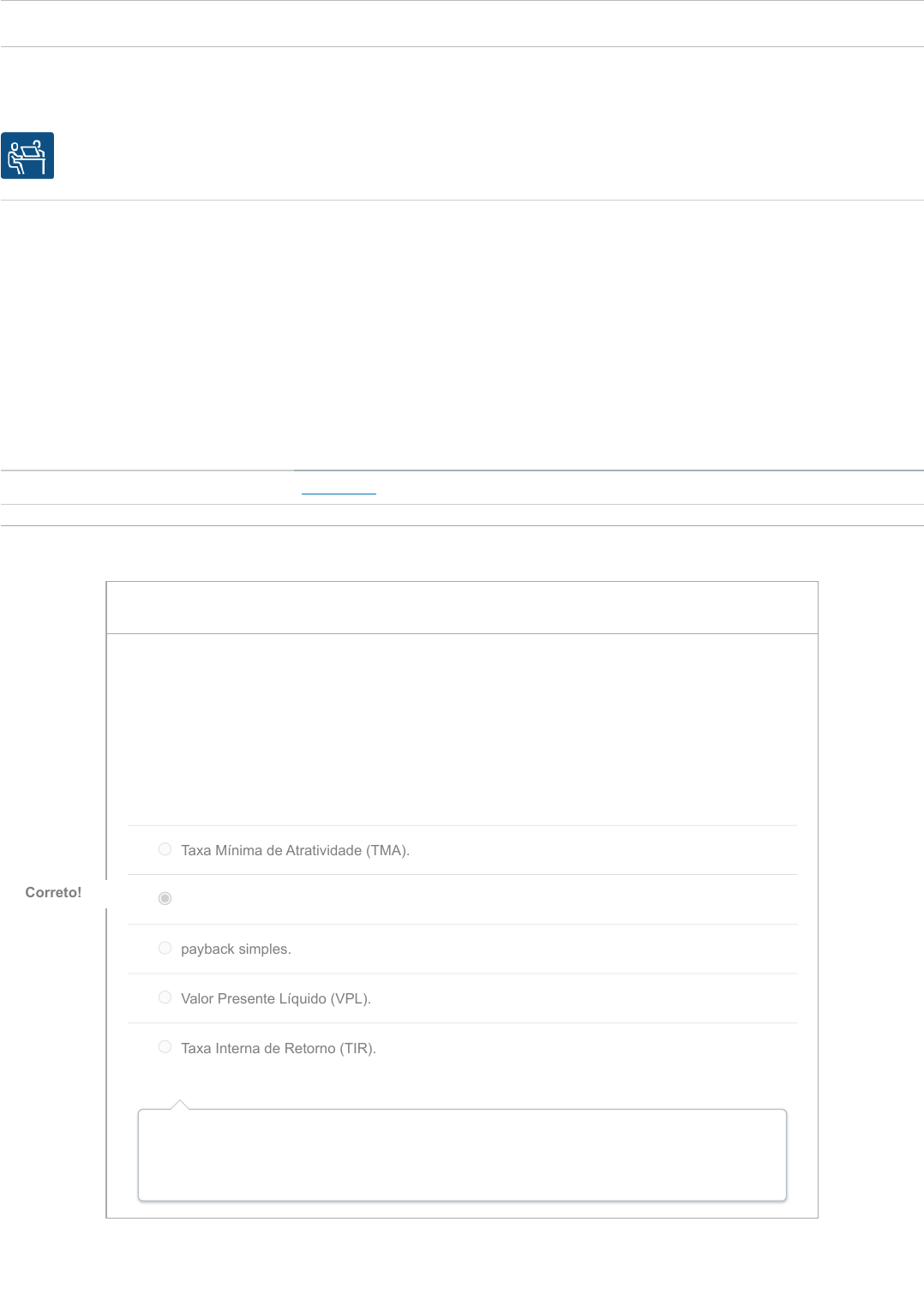 16/06/23, 16:41 Unidade 5: Exercício final da unidade: RISCO, RETORNO E VALOR (2023/13/0027_202313B) https://online.instructure.com/courses/3548/quizzes/74787 1/4 Unidade 5: Exercício final da unidade Entrega Sem prazo Pontos 100 Perguntas 5 Limite de tempo Nenhum Instruções Histórico de tentativas Tentativa Tempo Pontuação MAIS RECENTE Tentativa 1 5 minutos 100 de 100 Enviado 16 jun em 16:41 Exercício final da unidade 5 Analise e responda. Você verá os resultados no final do período de realização do teste. Estude cuidadosamente as explicações para qualquer pergunta que você responda incorretamente. Esse feedback ajudará a redirecioná-lo no início do seu aprendizado se um conceito não estiver claro. 20 / 20 ptsPergunta 1 Para todo investimento que se pretende realizar, um montante de retorno é esperado, no fim do projeto. O tempo necessário para se recuperar determinado investimento a uma taxa de desconto é denominado: Taxa Mínima de Atratividade (TMA). payback descontado. Correto!Correto! payback simples. Valor Presente Líquido (VPL). Taxa Interna de Retorno (TIR). Payback descontado representa o prazo total para se recuperar um investimento, descontando-se o custo do capital no período. https://online.instructure.com/courses/3548/quizzes/74787/history?version=1 16/06/23, 16:41 Unidade 5: Exercício final da unidade: RISCO, RETORNO E VALOR (2023/13/0027_202313B) https://online.instructure.com/courses/3548/quizzes/74787 2/4 20 / 20 ptsPergunta 2 Uma empresa pretende realizar um investimento e decide utilizar o ROI para verificar se realiza ou não essa ação. O ROI é um indicador muito popular em finanças, empregado para avaliar o potencial desempenho de investimentos, por incorporar os três princípios da lucratividade, ou seja, receita, custo e investimento. Considerando essa relação no ROI, como retorno de um investimento (receita, custo e investimento), espera-se que a receita: Aumente, o custo diminua e o investimento diminua. Aumente, o custo diminua e o investimento aumente. Correto!Correto! Diminua, o custo aumente e o investimento aumente. Aumente, o custo aumente e o investimento aumente. Diminua, o custo diminua e o investimento diminua. O que se espera em uma ação de investimento é a maximização de resultados, ou seja, o aumento dos lucros, que é, justamente, a relação entre o capital investido e a lucratividade, percebida quando a receita aumenta, os custos diminuem e o emprego de capital se reduz. 20 / 20 ptsPergunta 3 Considere as seguintes informações: custo de capital próprio (Ke) = 3,6%, custo de capital de terceiros (Kd) = 5,2%, impostos sobre renda (tc) = 40%, capital próprio = $2.509.454,54, total de ativos = 3.345.939,39 e capital de terceiros= $836.484,84. Qual o valor do custo médio ponderado de capital? CMPC = 5,20% CMPC = 3,12% CMPC = 2,48% CMPC = 3,48% Correto!Correto! CMPC = 3,60% 16/06/23, 16:41 Unidade 5: Exercício final da unidade: RISCO, RETORNO E VALOR (2023/13/0027_202313B) https://online.instructure.com/courses/3548/quizzes/74787 3/4 Resposta correta: CMPC = 3,48% Veja o espelho de cálculo: CMPC = W/E * Ke + W/D * Kd (1-tc) = 0,75 * 0,036 + 0,25 * 0,052*(1-0,40) = 0,027 + 0,25 * (0,052 *0,60) = 0,027 + 0,25 * 0,0312 = 0,027 + 0,0078. CMPC = 0,0348 ou 3,48% 20 / 20 ptsPergunta 4 Considerando as análises de investimento no ativo, a razão entre o valor presente esperado dos benefícios de um investimento e o valor presente dos custos desse mesmo investimento em um projeto, o que representa essa razão? Payback simples. Taxa Interna de Retorno (TIR). Correto!Correto! Payback descontado. Valor Presente Líquido (VPL). Taxa Mínima de Atratividade (TMA). TIR de um investimento é a relação entre os benefícios e os custos em um projeto. 20 / 20 ptsPergunta 5 Observe as seguintes informações: Taxa livre de risco (Rf) = 1,2%, Taxa de mercado (Rm) =4,2%, beta (B) =1,0. Qual o custo de capital próprio (Ke) utilizando o método CAPM? Ke = 4,2% Correto!Correto! Ke = 3,0% Ke = 5,4% Ke = 4,6% Ke = 1,2% 16/06/23, 16:41 Unidade 5: Exercício final da unidade: RISCO, RETORNO E VALOR (2023/13/0027_202313B) https://online.instructure.com/courses/3548/quizzes/74787 4/4 Resposta correta: Ke = 4,2% Veja o espelho de cálculo: Ke= Rf + b (Rm-Rf) = 0,012 + 1(0,042 – 0,012) = 0,012 + 0,03 = 0,042 ou 4,2%.