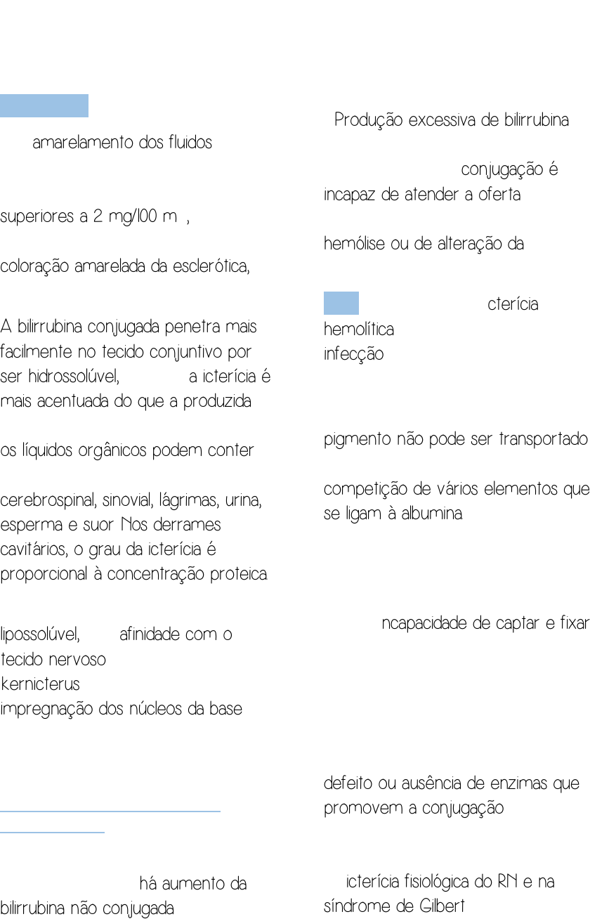 ICTERÍCIA É o amarelamento dos fluidos e tecidos do organismo pela elevação da bilirrubina no soro, em níveis superiores a 2 mg/100 mℓ, cuja exteriorização clínica principal é a coloração amarelada da esclerótica, mucosas, pele e líquidos orgânicos. A bilirrubina conjugada penetra mais facilmente no tecido conjuntivo por ser hidrossolúvel, por isso, a icterícia é mais acentuada do que a produzida pela bilirrubina não conjugada. Todos os líquidos orgânicos podem conter bilirrubina, tais como pleural, ascítico, cerebrospinal, sinovial, lágrimas, urina, esperma e suor. Nos derrames cavitários, o grau da icterícia é proporcional à concentração proteica. A bilirrubina não conjugada, por ser lipossolúvel, tem afinidade com o tecido nervoso e pode causar kernicterus em recém-nascidos por impregnação dos núcleos da base. CLASSIFICAÇÃO DAS ICTERÍCIAS HIPERBILIRRUBINEMIAS NÃO CONJUGADAS O primeiro grupo compreende as situações nas quais há aumento da bilirrubina não conjugada, por um desses quatro mecanismos: I: Produção excessiva de bilirrubina em setores distantes do fígado, condição na qual a conjugação é incapaz de atender a oferta. Este processo pode ser decorrente de hemólise ou de alteração da eritropoese; OBS: O paciente com icterícia hemolítica morre, 100% das vezes, por infecção, já que não transporta O2 adequadamente II: No nível da membrana, quando o pigmento não pode ser transportado até o hepatócito, devido à competição de vários elementos que se ligam à albumina. Pode ocorrer em RNs ou devido à competição medicamentosa; III: No nível do hepatócito, quando houver incapacidade de captar e fixar a bilirrubina à proteína Y (ligandina), também por fatores competitivos. Pode ocorrer em RNs ou devido à competição medicamentosa; IV: No nível microssomal, quando há defeito ou ausência de enzimas que promovem a conjugação, impedindo a transformação de bilirrubina indireta em direta. Isso ocorre, por exemplo, na icterícia fisiológica do RN e na síndrome de Gilbert Em todas essas situações, se a bilirrubina não é completamente ICTERÍCIA E HEPATOMEGALIA conjugada, ocorre, no plasma, um nítido predomínio da fração indireta ou não conjugada sobre a direta. Essa forma de hiperbilirrubinemia raramente ultrapassa 5 mg/100 mℓ, e a icterícia não é acentuada, sendo percebida, em geral, apenas nas escleróticas. Por ser uma fração insolúvel, a bilirrubina indireta não é filtrada pelos rins e, por isso, não há colúria. HIPERBILIRRUBINEMIAS CONJUGADAS O segundo grupo pertence às hiperbilirrubinemias conjugadas, que constituem as causas mais frequentes de icterícia. O mecanismo básico é a excreção deficiente da bilirrubina direta, seja de origem intra ou extra- hepática. Intrahepáticas As alterações intrahepáticas ocorrem nos níveis hepatocelular e canalicular. No primeiro caso, existem condições nas quais o defeito excretório é congênito e seletivo (síndromes de Dubin-Johnson e de Rotor), ou o defeito é generalizado e adquirido (hepatites, álcool, cirrose e colestase intrahepática). No segundo caso, pode-se ter, como causas, medicamentos, cirrose biliar primária, atresia das vias biliares, colangite esclerosante e colangiocarcinoma Extrahepáticas As condições extrahepáticas caracterizam-se por um obstáculo ao fluxo de bile, sejam intrínsecas ou extrínsecas à árvore biliar. Por exemplo, pode-se ter, como causas, colelitíase, coledocolitíase, atresias, neoplasias da papila/colédoco/vesícula/pâncreas e ligadura do colédoco Qualquer que seja a causa, a icterícia por aumento da fração conjugada pode alcançar níveis bastante elevados, muitas vezes de evolução progressiva. A característica principal é o predomínio da bilirrubina direta. A indireta também se encontra elevada, mas sempre em níveis inferiores à conjugada Independentemente dos mecanismos e das causas, a hiperbilirrubinemia conjugada tem como denominador comum a colúria (a bilirrubina direta é hidrossolúvel) e a impregnação evidente dos tecidos, tornando fácil o reconhecimento da síndrome. Highlight OBS: Mucosas e esclera (onde existe grande quantidade de tecido elástico) tingem-se com o pigmento em concentrações de bilirrubina acima de 2 a 2,5mg/dl, enquanto que na pele os níveis necessários excedem a 3mg/dl. Via de regra, cicatrizes e áreas de edema são poupados. A baixa pigmentação do tecido fibroso e a diluição da bilirrubina no interstício expandido são as causas, respectivamente. OBS: A icterícia ocorre, primeiramente, no frêmito da língua. Após impregnar a esclera e a pele, a bilirrubina estará bem aumentada OBS: Se a bilirrubina indireta estiver 2- 3 vezes aumentada em relação a direta, há problema OBS: Paciente que toma anticonvulsivante, anticoagulante e medicações em geral há tendência de aumento da bilirrubina VALORES DE BILIRRUBINA TONS DE PELE X TIPOS DE ICTERÍCIA HEMOLÍTICA: PRÉ HEPÁTICA Amarelo Claro HEPATOCELULAR: INTRA HEPÁTICA Amarelo acastanhado ou alaranjado COLESTÁTICA: PÓS HEPÁTICA Amarelo esverdeado SOROLOGIAS A SEREM FEITAS EM ICTÉRICOS HIV, Hepatite B, Hepatite C, Citomegalovírus, Epstein Barr Vírus, Parvovírus, VDRL (sífilis) e HTLV DIAGNÓSTICO CLÍNICO E LABORATORIAL A avaliação diagnóstica deve começar pelo reconhecimento e caracterização da própria icterícia. Para isso, o paciente deve ser examinado à luz natural. Por vezes, em obstrução de longo tempo com profunda icterícia, a pele do doente adquire um tom esverdeado (icterícia verdínica), devido à oxidação da bilirrubina e ao acúmulo de biliverdina. Toda icterícia mostra-se nas escleróticas. Quando apenas a pele está amarelada, poupando as escleróticas, o fenômeno é geralmente secundário à hipercarotenemia. O reconhecimento bioquímico da icterícia é feito pela dosagem das bilirrubinas. Este exame é útil apenas para distinguir as form