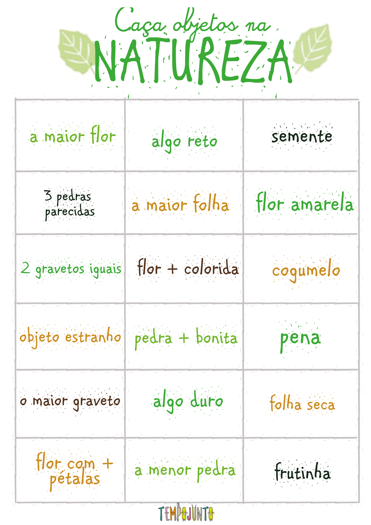 pena 2 gravetos iguaisflor + colorida o maior graveto algo duro objeto estranho cogumelo folha seca flor com + pétalas a maior folha3 pedras parecidas frutinha sementea maior flor pedra + bonita a menor pedra algo reto flor amarela Caça objetos na NATUREZA