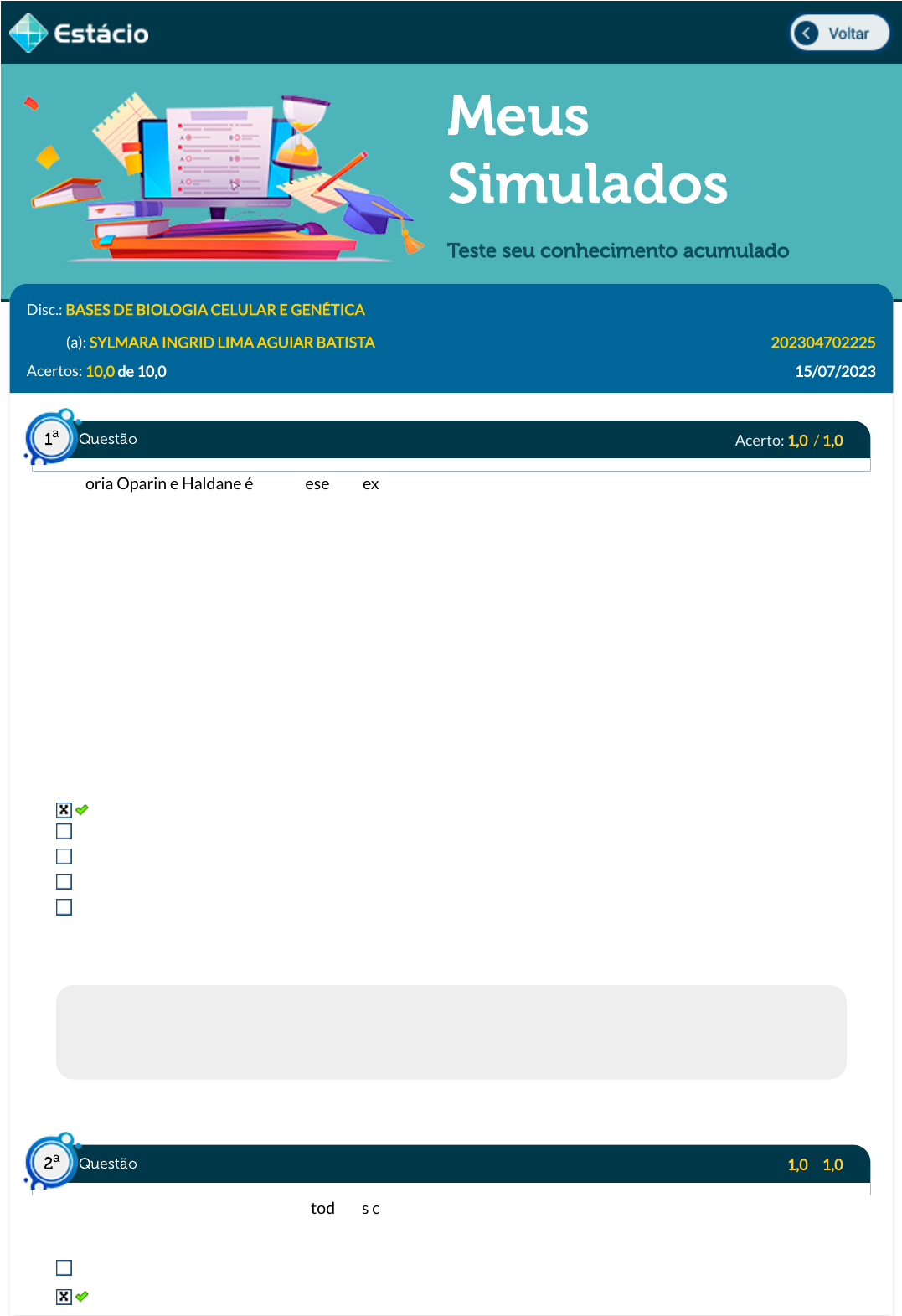 15/07/2023, 14:44 Estácio: Alunos https://simulado.estacio.br/alunos/ 1/5 Meus Simulados Teste seu conhecimento acumulado Disc.: BASES DE BIOLOGIA CELULAR E GENÉTICA Aluno(a): SYLMARA INGRID LIMA AGUIAR BATISTA 202304702225 Acertos: 10,0 de 10,0 15/07/2023 Acerto: 1,0 / 1,0 A teoria Oparin e Haldane é a hipótese que explica como a partir da organização de compostos inorgânicos sugiram os seres vivos. A cerca desta teoria, analise as a�rmativas abaixo. I. A Terra, em seus primórdios, estaria em intensa atividade vulcânica o que liberaria na atmosfera amônia, hidrogênio, metano e vapor de água. II. Os aminoácidos (compostos orgânicos mais complexos) foram formados a partir de elementos mais simples presentes na atmosfera primitiva. III. Os proteinoides se assemelhavam em estrutura aos carboidratos, lipídios e proteínas que existem atualmente. IV. Os coacervados foram formados a partir da organização das moléculas conhecidas como proteinoides. Esses coacervados surgiram, ao longo do tempo, a partir de novas reações químicas que foram acontecendo. Marque a alternativa que apresenta as a�rmativas corretas. Apenas as a�rmativas I, II e IV estão corretas. Apenas as a�rmativas I e IV estão corretas. As a�rmativas I, II, III e IV estão corretas. Apenas as a�rmativas I e II estão corretas. Apenas as a�rmativas I, III e IV estão corretas. Respondido em 15/07/2023 14:28:18 Explicação: A a�rmativa III está incorreta pois os proteinoides se assemelhavam em estrutura aos somente as proteínas que existem atualmente. Acerto: 1,0 / 1,0 A água é o principal componente de todas as células dos organismos vivos, entretanto a sua quantidade nos organismos: É constante, mesmo com o aumento da idade. Tende a diminuir conforme aumenta a idade. Questão1 a Questão2 a https://simulado.estacio.br/alunos/inicio.asp javascript:voltar(); 15/07/2023, 14:44 Estácio: Alunos https://simulado.estacio.br/alunos/ 2/5 Aumenta, conforme vai aumentando a idade. Tem relação com a idade, varia conforme as espécies, mas é igual em todas as células do mesmo organismo. Não está relacionada com a idade. Respondido em 15/07/2023 14:19:18 Explicação: A resposta certa é: Tende a diminuir conforme aumenta a idade. Acerto: 1,0 / 1,0 Os endossomos e lisossomos apresentam grande relação entre si e participam da Via Endocítica. Leia as asserções a seguir e assinale a alternativa correta. I. É entendido que um endossomo inicial, após passar pelo processo de maturação, origina um endossomo tardio que pode formar um lisossomo. PORQUE II. Na maturação, o endossomo sofre modi�cações como redução progressiva do pH, recebimento de vesículas do aparelho de Golgi, ativação das enzimas e fusão com endossomos preexistentes, que podem originar um lisossomo. As asserções I e II são verdadeiras e a II é uma justi�cativa para a I. A asserção I é falsa e a II é verdadeira. As asserções I e II são verdadeiras e a II não é uma justi�cativa para a I. A asserção I é verdadeira e a II é falsa. As asserções I e II são falsas. Respondido em 15/07/2023 14:19:48 Explicação: O endossomo inicial, ao passar por modi�cações, forma um endossomo tardio que vai continuar no processo de maturação, podendo formar um lisossomo. As modi�cações sofridas pelos endossomos incluem a redução progressiva do pH, a ativação das suas enzimas, o recebimento de vesículas do Complexo de Golgi e a fusão com endossomos preexistentes. Acerto: 1,0 / 1,0 (UNEMAT) Teste de paternidade é feito por análise do DNA dos pais e do(a) �lho(a). Além deste, existe uma forma de excluir a paternidade, que se baseia nos tipos sanguíneos do sistema ABO. A única alternativa que indica exclusão da paternidade é: O �lho é do tipo AB, a mãe do tipo A e o suposto pai do tipo A. O �lho é do tipo A, a mãe do tipo B e o suposto pai do tipo A. O �lho é do tipo B, a mãe do tipo O e o suposto pai do tipo B. O �lho é do tipo AB, a mãe do tipo A e o suposto pai do tipo B. O �lho é do tipo A, a mãe do tipo A e o suposto pai do tipo B. Respondido em 15/07/2023 14:31:13 Questão3 a Questão4 a 15/07/2023, 14:44 Estácio: Alunos https://simulado.estacio.br/alunos/ 3/5 Explicação: Durante a primeira fase do século XX, cientistas utilizavam o sistema ABO para analisar possíveis candidatos a pais biológicos, quando era necessário ser feito algum tipo de reconhecimento. No entanto, esse tipo de análise só pode ser utilizado para saber quais dos candidatos poderiam ser pais em potencial, devido às limitadas possibilidades de combinações dos tipos sanguíneos. Acerto: 1,0 / 1,0 No câncer as células podem passar a se dividir de forma anormal e descontrolada. Essa multiplicação anômala dá origem a uma massa tumoral que pode invadir estruturas além daquelas onde se originou. Com relação a este assunto, analise as proposições abaixo. I. Células tumorais malignas podem se disseminar por todo o corpo do indivíduo, através da corrente sanguínea ou do sistema linfático. II. Radiação solar em excesso, exposição a radiações ionizantes e certas substâncias químicas se apresentam como fatores de risco para o surgimento do câncer. III. Diversas formas de câncer diagnosticadas em pulmão, laringe, esôfago e bexiga urinária, no homem, estão associadas ao tabagismo. Quais a�rmativas são corretas: Apenas I está correta. I, II e III estão corretas. Apenas I e II estão corretas. Apenas II e III estão corretas. Apenas I e III estão corretas. Respondido em 15/07/2023 14:37:38 Explicação: Câncer é o nome dado a uma série de doenças que possuem um fator em comum: o crescimento desordenado de células que ocasiona a formação de tumores. Essas doenças podem ser muito agressivas, uma vez que as células cancerosas se dividem rapidamente e de forma incontrolável, podendo espalhar-se para outras regiões do corpo, invadir outros tecidos e órgãos c