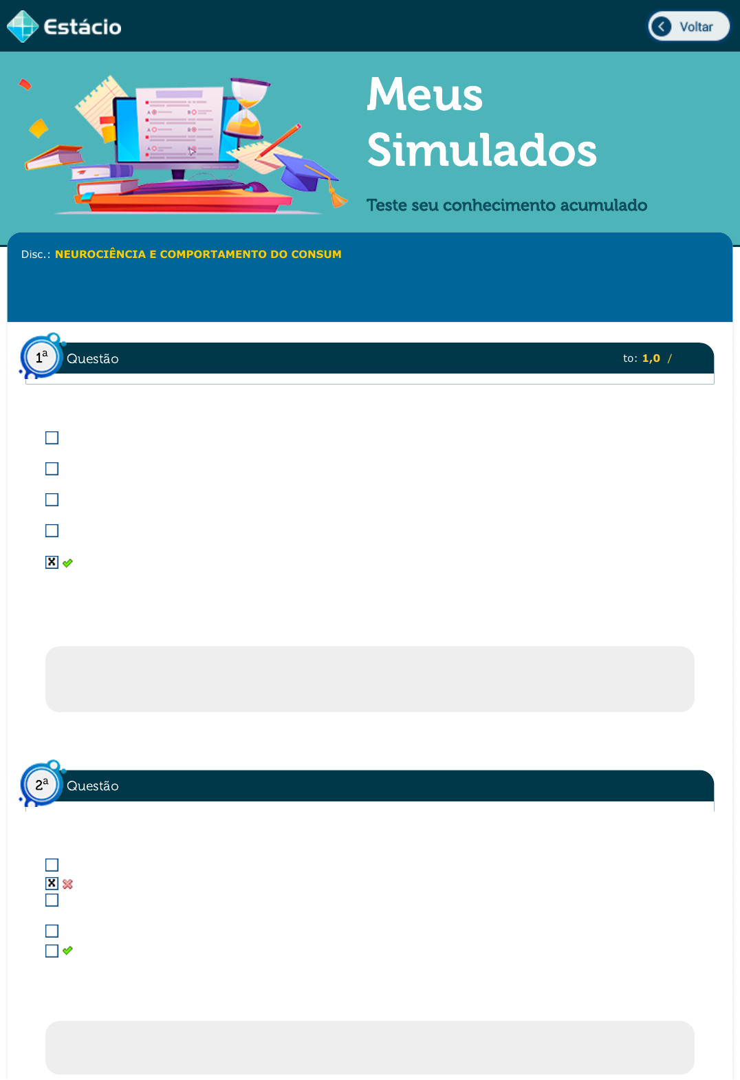 21/12/2022 12:55 Estácio: Alunos https://simulado.estacio.br/alunos/ 1/4 Meus Simulados Teste seu conhecimento acumulado Disc.: NEUROCIÊNCIA E COMPORTAMENTO DO CONSUMIDOR Aluno(a): ROSANA ALVES LAGUNA 202208040632 Acertos: 9,0 de 10,0 21/12/2022 Acerto: 1,0 / 1,0 Indique abaixo a alternativa que descreve as etapas e a sequência da tomada de decisão do consumidor segundo o modelo de cinco etapas: 1- avaliação do problema, 2- avaliação de alternativas, 3- busca de informações suplementares, 4- decisão de compra, 5- avaliação de recompra. 1- avaliação do problema, 2- busca de informações, 3- avaliação experimental de uso, 4- decisão de compra, 5- comportamento pós-compra. 1- avaliação do problema, 2- avaliação de alternativas, 3- avaliação experimental de uso, 4- decisão de compra, 5- comportamento pós-compra. 1- reconhecimento do problema, 2- busca de informações, 3- avaliação experimental de uso, 4- decisão de compra, 5- avaliação de recompra. 1- reconhecimento do problema, 2- busca de informações, 3- avaliação de alternativas, 4- decisão de compra, 5- comportamento pós-compra. Respondido em 21/12/2022 12:39:02 Explicação: A resposta correta é: 1- reconhecimento do problema, 2- busca de informações, 3- avaliação de alternativas, 4- decisão de compra, 5- comportamento pós-compra. Acerto: 0,0 / 1,0 Como seres sociais, os consumidores são amplamente influenciados pelos diferentes tipos de grupos. Indique abaixo a definição mais apropriada para os chamados grupos dissociativos: São grupos com os quais os consumidores tentam, mas não conseguem se associar. São grupos que rejeitam consumidores com certas características. São grupos com os quais os consumidores pertencentes se dissociam positivamente dos não pertencentes. São grupos que se fragmentaram por divergências de crenças e valores. São grupos com os quais os consumidores não desejam se associar. Respondido em 21/12/2022 12:47:03 Explicação: A resposta correta é: São grupos com os quais os consumidores não desejam se associar. Questão1 a Questão2 a https://simulado.estacio.br/alunos/inicio.asp javascript:voltar(); 21/12/2022 12:55 Estácio: Alunos https://simulado.estacio.br/alunos/ 2/4 Acerto: 1,0 / 1,0 Qual é a principal diferença entre os métodos de pesquisa qualitativa e quantitativa em Neuromarketing? Os dois métodos de pesquisa são similares e entendem o comportamento do consumidor de forma objetiva. A pesquisa quantitativa estuda o comportamento do consumidor a partir da observação e é subjetiva, enquanto a qualitativa quantifica os eventos. Os dois métodos de pesquisa são similares e entendem o comportamento do consumidor de forma subjetiva, concisa e consciente. A pesquisa qualitativa estuda o comportamento do consumidor a partir da observação e é subjetiva, enquanto a quantitativa quantifica os eventos. A pesquisa qualitativa estuda o comportamento do consumidor a partir da observação e é objetiva, enquanto a quantitativa quantifica os eventos. Respondido em 21/12/2022 12:48:42 Explicação: A resposta correta é: A pesquisa qualitativa estuda o comportamento do consumidor a partir da observação e é subjetiva, enquanto a quantitativa quantifica os eventos. Acerto: 1,0 / 1,0 O Neuromarketing envolve uma série de questões sensíveis do ponto de vista ético. Assinale a alternativa que não representa uma crítica sobre os aspectos éticos relacionado ao Neuromarketing: Preço excessivamente caro, o que causa uma competição desleal. Influência nos consumidores de modo inconsciente. Possível incentivo ao consumo excessivo. Possível de ameaça à privacidade dos participantes nos estudos. Ausência de regulamentação específica. Respondido em 21/12/2022 12:50:26 Explicação: A resposta correta é: Preço excessivamente caro, o que causa uma competição desleal. Acerto: 1,0 / 1,0 Qual opção abaixo não é uma forma de segmentação: Segmentação por renda. Todas as alternativas estão incorretas. Segmentação por idade de pessoas que não fazem parte do publico alvo da empresa. Segmentação comportamental. Segmentação por idade, e por nível de fidelidade com a empresa ou produto/serviço. Respondido em 21/12/2022 12:41:57 Explicação: Questão3 a Questão4 a Questão5 a 21/12/2022 12:55 Estácio: Alunos https://simulado.estacio.br/alunos/ 3/4 A resposta correta é: Segmentação por idade de pessoas que não fazem parte do publico alvo da empresa. Acerto: 1,0 / 1,0 Quais dos itens abaixo contém alguma variável que não indica fatores ambientais que afetam a segmentação de mercado: Tendências tecnológicas. Tendências culturais e emocionais. Tendências políticas e culturais. Todas as alternativas estão incorretas. Tendências demográficas e tecnológicas. Respondido em 21/12/2022 12:51:33 Explicação: A resposta correta é: Tendências culturais e emocionais. Acerto: 1,0 / 1,0 Qual item NÃO apresenta um potencial uso para pesquisa de mercado: Melhoria de processos de atendimento. Todas as alternativas estão incorretas. Aumento da rentabilidade de produtos. Realização de pesquisa de clima. Reposicionamento de marca. Respondido em 21/12/2022 12:52:33 Explicação: A resposta correta é: Realização de pesquisa de clima. Acerto: 1,0 / 1,0 Qual item NÃO contém uma variável relevante para definir a metodologia de uma pesquisa de mercado: Todas as alternativas estão incorretas. A relevância das conclusões. Aspectos associados a ética. O custo. O método utilizado na pesquisa anterior relacionado a um tema diferente ao estudado na pesquisa atual. Respondido em 21/12/2022 12:52:53 Explicação: A resposta correta é: O método utilizado na pesquisa anterior relacionado a um tema diferente ao estudado na pesquisa atual. Questão6 a Questão7 a Questão8 a 21/12/2022 12:55 Estácio: Alunos https://simulado.estacio.br/alunos/ 4/4 Acerto: 1,0 / 1,0 Existem diversos tipos de normas sociais. Indique abaixo o tipo de 