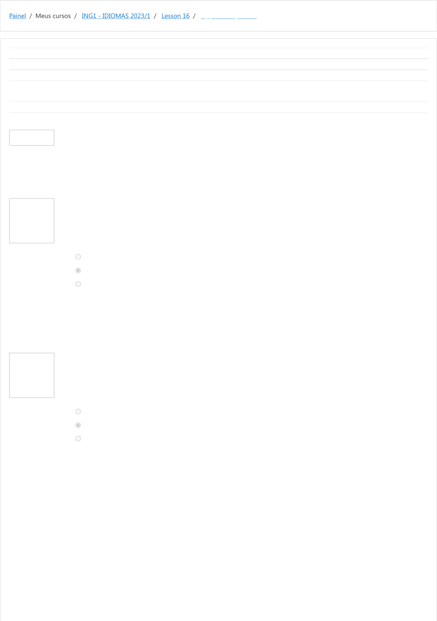 Painel / Meus cursos / ING1 - IDIOMAS 2023/1 / Lesson 16 / Opposite adjectives Informação Questão 1 Correto Atingiu 1,00 de 1,00 Questão 2 Correto Atingiu 1,00 de 1,00 Iniciado em segunda, 17 jul 2023, 10:40 Estado Finalizada Concluída em segunda, 17 jul 2023, 10:42 Tempo empregado 1 minuto 45 segundos Notas 7,00/7,00 Avaliar 10,00 de um máximo de 10,00(100%) Listen to some people making comments about different places and pay attention to the adjectives that are mentioned. In each question, select the adjective with the opposite meaning from the one used in the comment. Escolha uma opção: wide small big Sua resposta está correta. A resposta correta é: small Escolha uma opção: calm boring crowded Sua resposta está correta. A resposta correta é: boring https://moodle.ifsul.edu.br/novohamburgo/my/ https://moodle.ifsul.edu.br/novohamburgo/course/view.php?id=336 https://moodle.ifsul.edu.br/novohamburgo/course/view.php?id=336#section-25 https://moodle.ifsul.edu.br/novohamburgo/mod/quiz/view.php?id=53464 Questão 3 Correto Atingiu 1,00 de 1,00 Questão 4 Correto Atingiu 1,00 de 1,00 Questão 5 Correto Atingiu 1,00 de 1,00 Questão 6 Correto Atingiu 1,00 de 1,00 Escolha uma opção: a. narrow b. rich c. expensive Sua resposta está correta. A resposta correta é: expensive Escolha uma opção: a. quiet b. modern c. ugly Sua resposta está correta. A resposta correta é: ugly Escolha uma opção: quiet beautiful dirty Sua resposta está correta. A resposta correta é: quiet Escolha uma opção: little clean packed Sua resposta está correta. A resposta correta é: clean Questão 7 Correto Atingiu 1,00 de 1,00 Escolha uma opção: narrow boring ugly Sua resposta está correta. A resposta correta é: narrow ◄ Human Behavior Seguir para... Classmates ► https://moodle.ifsul.edu.br/novohamburgo/mod/quiz/view.php?id=53462&forceview=1 https://moodle.ifsul.edu.br/novohamburgo/mod/quiz/view.php?id=53465&forceview=1