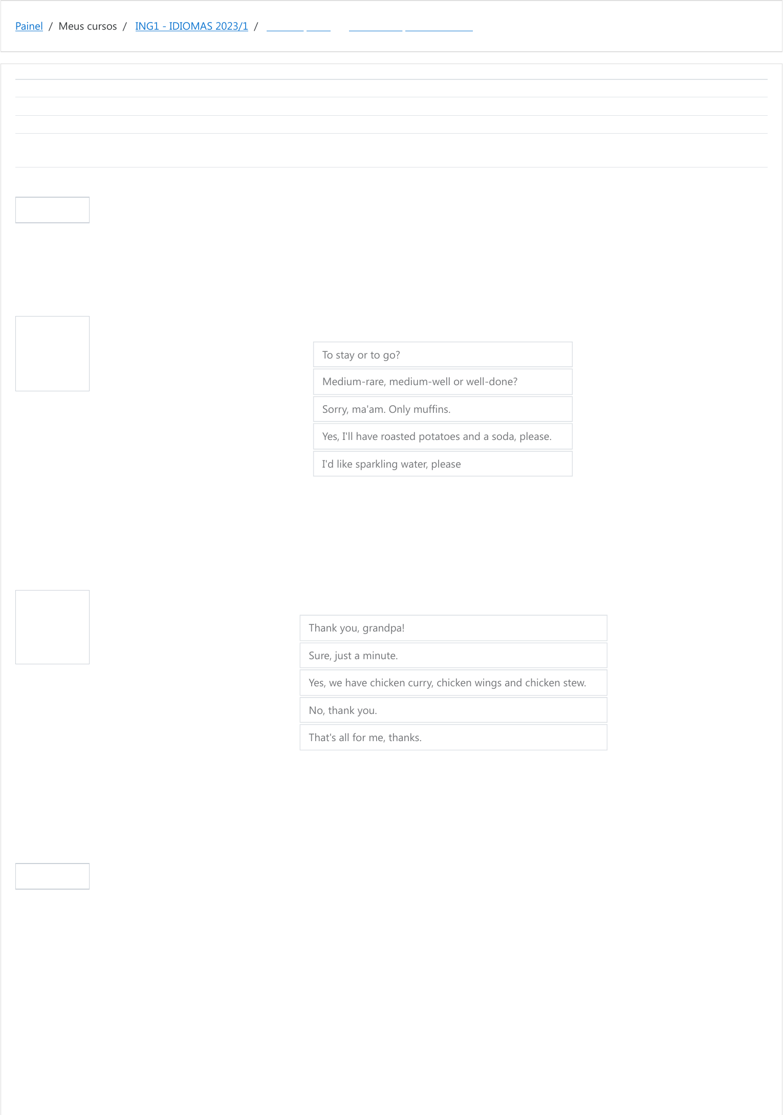 Painel / Meus cursos / ING1 - IDIOMAS 2023/1 / AVALIAÇÃO 3 / RECUPERAÇÃO DO TEST 3 Informação Questão 1 Correto Atingiu 0,40 de 0,40 Questão 2 Correto Atingiu 0,40 de 0,40 Informação Iniciado em segunda, 17 jul 2023, 09:19 Estado Finalizada Concluída em segunda, 17 jul 2023, 10:26 Tempo empregado 1 hora 6 minutos Avaliar 10,00 de um máximo de 10,00(100%) Match the columns to make the conversations. Good evening, I'd like to order a pizza. May I have a beef steak, please? Do you have any brownie? Are you ready to order? What would you like to drink? To stay or to go? Medium-rare, medium-well or well-done? Sorry, ma'am. Only muffins. Yes, I'll have roasted potatoes and a soda, please. I'd like sparkling water, please A resposta correta é: Good evening, I'd like to order a pizza. → To stay or to go?, May I have a beef steak, please? → Medium-rare, medium-well or well-done?, Do you have any brownie? → Sorry, ma'am. Only muffins., Are you ready to order? → Yes, I'll have roasted potatoes and a soda, please., What would you like to drink? → I'd like sparkling water, please. Today the check is on me. Can I have the check, please? Do you have any dish with chicken? Would you like some coffee? Anything else? Thank you, grandpa! Sure, just a minute. Yes, we have chicken curry, chicken wings and chicken stew. No, thank you. That's all for me, thanks. A resposta correta é: Today the check is on me. → Thank you, grandpa!, Can I have the check, please? → Sure, just a minute., Do you have any dish with chicken? → Yes, we have chicken curry, chicken wings and chicken stew., Would you like some coffee? → No, thank you., Anything else? → That's all for me, thanks.. Dude's grandfather is telling a friend how he's feeling. Match the columns to find out what is wrong with him. https://moodle.ifsul.edu.br/novohamburgo/my/ https://moodle.ifsul.edu.br/novohamburgo/course/view.php?id=336 https://moodle.ifsul.edu.br/novohamburgo/course/view.php?id=336#section-28 https://moodle.ifsul.edu.br/novohamburgo/mod/quiz/view.php?id=53494 Questão 3 Correto Atingiu 0,40 de 0,40 Questão 4 Correto Atingiu 0,40 de 0,40 Informação My tooth hurts. I slept on a very uncomfortable bed two days ago. I ate a sandwich yesterday; I think the mayonnaise was bad. My body is in pain and I have a runny nose. My body temperature is 39°C. I have a toothache. I have a backache. I have diarrhea. I have a cold. I have a fever. A resposta correta é: My tooth hurts. → I have a toothache., I slept on a very uncomfortable bed two days ago. → I have a backache., I ate a sandwich yesterday; I think the mayonnaise was bad. → I have diarrhea., My body is in pain and I have a runny nose. → I have a cold., My body temperature is 39°C. → I have a fever.. My neck is swollen. I have red blisters all over my skin. Yesterday, I spent many hours at the computer without my glasses. I can’t sleep at night. I feel off balance. I have the mumps. I have chickenpox. I have a headache. I have Insomnia. I am dizzy. A resposta correta é: My neck is swollen. → I have the mumps., I have red blisters all over my skin. → I have chickenpox., Yesterday, I spent many hours at the computer without my glasses. → I have a headache., I can’t sleep at night. → I have Insomnia., I feel off balance. → I am dizzy.. Read the sentences and write the correct name of the body part according to the context: Questão 5 Correto Atingiu 0,40 de 0,40 Informação We use our to kick balls and walk. We see with our . When we play videogame, we use our . We listen with our . We have 10 in our hands and 10 in our feet. We eat and smile using our . Our heart is inside the . We wear a watch and bracelets on the . When we ride a bike, we exercise our . We carry a bag on our . feet eyes hands ears fingers toes mouth chest wrist legs shoulders A resposta correta é: We use our [feet] to kick balls and walk. We see with our [eyes]. When we play videogame, we use our [hands]. We listen with our [ears]. We have 10 [fingers] in our hands and 10 [toes] in our feet. We eat and smile using our [mouth]. Our heart is inside the [chest]. We wear a watch and bracelets on the [wrist]. When we ride a bike, we exercise our [legs]. We carry a bag on our [shoulders]. Billy and Carly are good friends. They did many things in the past few days, because they had an extended holiday. Match the sentences with the corresponding verb in the past. Questão 6 Correto Atingiu 0,40 de 0,40 Informação Questão 7 Correto Atingiu 0,40 de 0,40 Informação Questão 8 Correto Atingiu 2,00 de 2,00 We our favorite songs in the morning during breakfast. We in the montains last summer. Billy and I with our new bikes. Carly and I some books in the evening to relax. We the guitar to practice the chords. We the first chapter of our biography. We our friends who live in the countryside. We Rolling Stones on the way to the montains. We to the beach. We our dinner with a portable stove. sang hiked cycled read played wrote visited sang went cooked A resposta correta é: We [sang] our favorite songs in the morning during breakfast. We [hiked] in the montains last summer. Billy and I [cycled] with our new bikes. Carly and I [read] some books in the evening to relax. We [played] the guitar to practice the chords. We [wrote] the first chapter of our biography. We [visited] our friends who live in the countryside. We [sang] Rolling Stones on the way to the montains. We [went] to the beach. We [cooked] our dinner with a portable stove. Rosa and her friends traveled during the weekend and did a long list of fun things. Find out about them completing the sentences by writing the past form of the correct verb in the box. Surf - Swim - Do - Go - Play - Paint - Run We went out every night. The boys surfed high waves at the beach. Rosa and Amanda played games during breakfast. swam in the ocean all morning. Carlton and Dube ran to see who would arrive first in the hotel. One day Dube pai