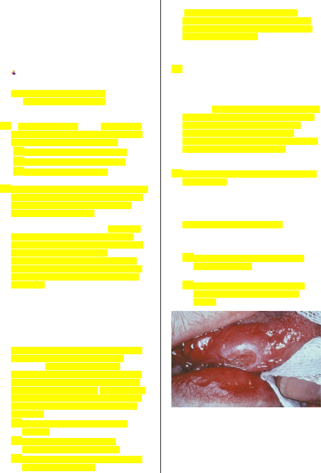 Infecções bacterianas Patologia oral – aula 5 25/03/2022 · Tuberculose. · é uma doença infecciosa crônica, causada por Mycobacterium tuberculosis (agente etiológico). · A tuberculose primária ocorre em indivíduos não expostos previamente ao microrganismo, envolvendo quase sempre o pulmão. · Quase sempre envolve os pulmões. · Nódulo localizado fibrocalcificado. · Normalmente assintomático. · A maioria das infecções ocorre como resultado da disseminação direta de pessoa para pessoa por meio de gotículas respiratórias de um paciente com a doença ativa. Inicialmente, o microrganismo evoca uma resposta inflamatória crônica inespecífica. Na maioria dos indivíduos, a infecção primária resulta apenas na formação de um nódulo localizado fibrocalcificado no sítio inicial do envolvimento. No entanto, microrganismos vivos podem estar presentes nestes nódulos e permanecer latentes por vários anos ou pela vida inteira. · Apenas cerca de 5% a 10% dos pacientes com TB progridem de infecção para a doença ativa, e um estado de imunossupressão coexistente frequentemente é responsável. · Em raras situações, a TB ativa pode decorrer diretamente de uma infecção primária. Entretanto, a doença ativa costuma se desenvolver em uma fase mais tardia da vida, com a reativação do microrganismo em uma pessoa previamente infectada. Tal reativação é associada ao comprometimento da defesa do hospedeiro, sendo chamada de tuberculose secundária. · Doença ativa, quando desenvolve os sintomas. · A doença ativa é rara de ocorrer diretamente da infecção primaria. · Pode se disseminar (tuberculose miliar) = tuberculose disseminada. · tuberculose secundária está associada a medicamentos imunossupressores, diabetes, idade avançada, pobreza e condições de vida superpovoadas. A AIDS representa um dos fatores de risco mais fortemente associados à progressão da infecção para a doença. · as lesões da tuberculose secundária estão localizadas no ápice pulmonar, porém elas podem propagar-se para muitos sítios diferentes através de material infectado expectorado ou através de vasos sanguíneos ou linfáticos. Os pacientes apresentam febre baixa, mal-estar, anorexia, perda de peso e sudorese noturna. Com a progressão pulmonar da doença, desenvolve-se tosse produtiva, usualmente acompanhada de hemoptise (saída de sangue na tosse) ou dor torácica. · Tuberculose extrapulomar pode atingir outros órgãos, tecidos. · Sistema linfático, pele, SNC, rins e trato intestinal. (sempre junto com a lesão pulmonar). · Lesões orais de TB são incomuns. As apresentações mais comuns de envolvimento oral são ulcerações crônicas e aumentos de volume. · Normalmente representam quadro de infecção secundaria. · Adultos de meia idade, + comum. · Disseminação hematopatogenica (pela corrente sanguínea) ou exposição ao escarro. OBS da imagem: Tuberculose. Ulceração mucosa crônica da superfície ventral da língua no lado direito. OBS da imagem: Tuberculose. Área de granulação e ulceração do rebordo alveolar inferior e soalho bucal. OBS da imagem: Lençóis de histiócitos misturados com células gigantes multinucleadas e áreas de necrose. Formação de granulomas e células gigantes (de Langherans), muitos macrófagos e linfócitos. OBS da imagem: tuberculose. Exibindo organismos micobacterianos dispersos na forma de pequenos bastões vermelhos. · O diagnóstico da doença ativa deve ser confirmado pelas colorações especiais para o microrganismo e pela cultura de tecido infectado ou do escarro. Mesmo se detectada por colorações especiais, a identificação do microrganismo em cultura é apropriada. · Teste cutâneo (PPD). · Não diferencia infecção de doença ativa. · Possibilidade de falso negativo. · Cultura. · Biopsia com a utilização de coloração especial (coloração de ziehl-neelsen). · M. tuberculosis pode sofrer mutações e se tornar resistente a terapias com um único agente medicamentoso. Para enfrentar essa habilidade, a terapia com múltiplos agentes é o tratamento de escolha para uma infecção ativa e o tratamento geralmente envolve duas ou mais drogas ativas por vários meses ou anos. · Sífilis. · = lues. · A sífilis é uma infecção crônica mundial causada pelo Treponema pallidum. · O organismo é muito vulnerável ao meio seco; portanto, as principais vias de transmissão são o contato sexual e da mãe para o feto (congênita). · Em pacientes com sífilis, a infecção sofre uma evolução característica que se desenvolve classicamente em três estágios. Um paciente acometido pela sífilis é altamente infeccioso apenas durante os dois primeiros estágios, porém as gestantes também podem transmitir a infecção para o feto durante o estágio de latência. · Sífilis primaria: · A sífilis primária é caracterizada pelo cancro duro (lesão inespecífica), que se desenvolve na área de inoculação, tornando-se clinicamente evidente de 3 a 90 dias após a exposição inicial. · As lesões orais são vistas mais nos lábios, mas outras áreas incluem a língua, palato, gengiva e amígdalas. · Neste momento, o microrganismo se dissemina sistemicamente através dos vasos linfáticos, preparando o palco para a futura progressão. Caso não seja tratada, a lesão inicial cicatriza dentro de três a oito semanas. · Cancro ocorre na região que foi infectada. Então, em caso de sexo, na genitália e sexo oral, na boca. Ocorre no local de contato (inoculação). · FERIDA. CANCRO DURO. OBS da imagem: Cancro da Sífilis Primária. Massa eritematosa e ulcerada na mucosa jugal anterior direita. · Sífilis secundaria (disseminada): · sendo identificada clinicamente de quatro a dez semanas após a infecção inicial. · As lesões da sífilis secundária podem surgir antes da resolução completa da lesão primária. Durante a sífilis secundária, os sintomas sistêmicos em geral surgem. Os mais com