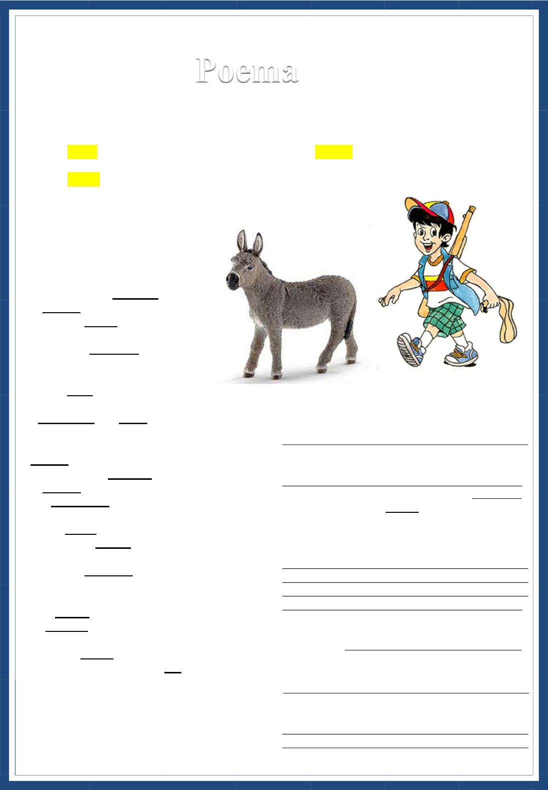 Poema A palavra "poema" deriva do verbo grego "poein" que significa "fazer, criar, compor". Poema é uma obra literária que pertence ao gênero da poesia, e cuja apresentação é dividido em estrofes e versos. Cada estrofe é constituída por versos (não tendo um número exato), com a finalidade de manifestar sentimento e emoção. Verso é cada linha do poema. Estrofe é um conjunto de versos. Rimas são sons semelhantes no final ou no interior dos versos. E são responsáveis pela melodia nos poemas O Menino Azul Cecília Meireles O menino quer um burrinho para passear. Um burrinho manso, que não corra nem pule, mas que saiba conversar. O menino quer um burrinho que saiba dizer o nome dos rios, das montanhas, das flores, – de tudo o que aparecer. O menino quer um burrinho que saiba inventar histórias bonitas com pessoas e bichos e com barquinhos no mar. E os dois sairão pelo mundo que é como um jardim apenas mais largo e talvez mais comprido e que não tenha fim. (Quem souber de um burrinho desses, pode escrever para a Ruas das Casas, Número das Portas, ao Menino Azul que não sabe ler.) Análise e entendimento 1. Qual é o título do poema? 2. Quem é a autora desse poema? 3. Quantos versos tem este poema? E quantas estrofes? 4. Retire do texto os versos que revelam como o menino acha que é o mundo. 5. De acordo com o poema qual é o nome do menino? 6. Qual é o endereço do menino citado no poema? 7. Quem são os personagens? 8. De acorde com o poema, o Menino Azul: a) Sabe ler e escrever b) Só sabe ler c) Não sabe ler d) Só sabe desenhar 2. Esse tipo de texto é: a) Uma fábula b) Uma notícia 9. Descreva: c) Um poema d) Uma propaganda a) Verso b) Estrofe c) Rima 10. Do que fala o poema? 11. Releia o poema com atenção e copie palavras que revelam como o menino queria que fosse o burrinho. 12. Retire os pares de rimas presentes no texto. 13. Releia a 2ª e 3ª estrofes. Em seguida transcreva as palavras que dão nomes aos seres (substantivos). Depois as separe em dois grupos: MASCULINO FEMININO 14. Passe para o plural as palavras a seguir jardim manso burrinho azul número nome tenha um 15. Encontre no diagrama as palavras destacadas no poema e pinte-as. B M A N S O J M Y Q V A C U S U T M E N I N O H P L S O Y A R F C O N V E R S A R D M P B R L P A S S E A R M T K P O E I O M O N T A N H A S F R R R N R J D I Z E R T M P L I T L H E T H I S T Ó R I A S D A E O S P E S S O A S Q V Z O S R Q W B A R Q U I N H O S W Q W P S A I R Ã O P T V M X D H V J A R D I M P E S C R E V E R A leitura é o alicerce da escrita. Quem muito lê, tem mais habilidade na escrita.