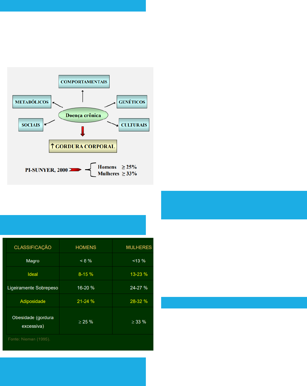 Obesidade COMO É DEFINIDA A OBESIDADE? ▶Doença crônica e multifatorial (OMS) ▶Doença crônica que surge e se desenvolve ao longo do tempo ▶Tratamento longo (crônico) e multifatorial , ▶Diagnostico é feito pelo % de gordura – mas não é consenso QUAL PERCENTUAL DE GORDURA CORPORAL IDEAL? COM BASE NA FORMAÇÃO DAS RESERVAS DE GORDURA DO ORGANISMO, COMO PODE SE DESENVOLVER A OBESIDADE? ▶Individuo com obesidade = excesso de triglicerol = gordura armazenada ▶Adipócito pode ter até 95% de gordura em seu interior = triacilglicerol ▶Obesidade hipertrófica: aumento de tamanho da célula (adipócito) ➞ mais difícil de tratar ▶Obesidade hiperplásica: aumento da quantidade da célula (adipócito) ➞pode ter a ver com genética • 1 período: 3 trimestre da gravidez ➞ genética • 2 período: 3 anos de idade • 3 período: puberdade • Nesses momentos, ocorre ápice de plasia da célula(formaçã0) ➞ mas, ocorre durante toda fase de crescimento ➞ depois que se encerra o crescimento, se o indivíduo tiver estímulos vai ter hiperplasia➞ não cessa com crescimento vObesidade hipertrófica-hiperplásica: aumento do volume e da quantidade de adipócitos ▶OBS: obesidade hiperplásica geralmente o paciente tem excesso de peso desde a infância ▶OBS: não tem como saber exatamente qual é o tipo de obesidade➞ sabe-se pela anamnese qual é a predominante COM BASE NA FORMAÇÃO DAS RESERVAS DE GORDURA DO ORGANISMO, COMO PODE SE DESENVOLVER A OBESIDADE? ▶Androide-ginoide (ovoide) ▶Androide: mais central/abdominal ➞ mais comum em homens ➞ gordura visceral ▶Ginoide: mais comum em mulheres ➞ periférica➞ gordura no quadril, nadegas, coxas➞ mais difícil de tratar➞ gordura no tecido adiposo subcutâneo COMO É DIAGNOSTICADA A OBESIDADE? ▶No contexto epidemiológico ➞ IMC indica gordura corporal ▶No contexto clinico ➞ existem outras questões (composição corporal) ▶Quanto mais gordura = mias chances de desenvolver doenças crônicas associadas ▶Quanto maior o IMC= mais gordura ▶Quanto maior o IMC= mais risco de doenças associadas ▶Quanto maior o IMC= maior a taxa de mortalidade precoce ONDE ESTÃO LOCALIZADAS AS RESERVAS DE GORDURA CORPORAL E QUAL A LOCALIZAÇÃO MAIS RELACIONADA COM RISCOS À SAÚDE? ▶Tecido subcutâneo e visceral ▶Visceral é pior ➞ a gordura fica fora do adipócito ➞ pode parar em órgãos e vísceras ➞ é facilmente mobilizada➞ principalmente quando o individuo tem redução da glicemia ➞ responsiva ➞ no jejum, mobiliza primeiro a visceral. ▶Na circunferência da cintura tem tanto a gordura subcutânea como a visceral ▶IMC é indicador de risco de mortalidade ➞circunferência da cintura também é um indicador ▶Limitação: quando passa o IMC 35 ➞ o risco para a ser o mesmo em termos de classificação A QUE SE ATRIBUI O AUMENTO DA PREVALÊNCIA DA OBESIDADE? ▶Aumento do sedentarismo ▶Consumo de alimentos densamente calóricos EXISTEM PESQUISAS QUE VERIFICARAM A PREVALÊNCIA DA OBESIDADE NO BRASIL? QUEM DEVE PERDER PESO? EXISTE ALGUM CRITÉRIO? INDIVÍDUOS ADULTOS INDICADOS A PERDA DE PESO (2013): ▶1 - Indivíduos obesos ▶2 - Indivíduos com sobrepeso: → > 1 fator de risco para DCV (Ex: DM, hipertensão, dislipidemia, CC elevada) → ou outras comorbidades associadas a obesidade (Ex: osteoartrite, doenças da vesícula biliar e apneia do sono) INDIVÍDUOS ADULTOS QUE DEVEM EVITAR GANHO DE PESO: ▶1 - IMC < 25 ▶2 - Sobrepeso → sem fatores de risco para DCV ou comorbidades. CRIANÇAS E ADOLESCENTES: ▶controle de ganho de peso e das comorbidades ▶Tratamento convencional: → Corrigir a ingestão calórica elevada; → gasto energético; → Modificação comportamental (Envolvimento familiar); ▶ IMC com o crescimento. ▶Morbidades graves → Perda rápida de peso. TRATAMENTO DA OBESIDADE TRATAMENTO CONVENCIONAL: ▶ Dieta (restrição calórica)* ▶ Exercício Físico* ▶Mudança Comportamental → Resulta em pequena perda de peso (isolada). → Reforça os efeitos da dietoterapia e do exercício físico. ▶Influxo de energia < Gasto de energia → Peso ▶Gasto de energia maior que o influxo de energia = perda de peso ▶É importante a restrição calórica e o exercício físico → RC = 10,7 Kg (15,6 semanas) → EF = 2,9 Kg (15,6 semanas) ▶Ex: → Programar as compras no supermercado; → Estimular a atividade física (Ex. evitar carro); → Evitar atividades previamente associadas ao comer em excesso (Ex. televisão e cinema); → Evitar ser o responsável pela alimentação de outros ▶CHO e Gorduras = energia armazenada que pode ser mobilizada ▶Proteína não é reserva de energia- é apenas funcional ▶ATP= Forma de armazenar energia rápida TRATAMENTO FARMACOLÓGICO: INDICAÇÃO ▶Femproporex, Mazindol, Anfepramona (anorexígenos) → Proibidos pela ANVISA (2011) ▶ Orlistate (inibe a ação da lipase pancreática). ▶Sibutramina (inibe a recaptação da serotonina e norepinefrina). ▶ Liraglutida (análogo do peptídeo semelhante a glucagon-1). ▶Ex: Insônia, náuseas, cefaleia, irritabilidade e esteatorreia e PA. TRATAMENTO CIRÚRGICO: INDICAÇÃO. ORGANIZAÇÃO MUSCULAR ▶Epimísio: tecido conjuntivo externo que envolve o músculo como um todo. ▶Fascículos: feixes de fibras musculares. ▶Perimísio: tecido conjuntivo que circunda cada fascículo. ▶Endomísio tecido conjuntivo que circunda cada fibra muscular. ▶Célula muscular = miocito = gordura fica dentro do miocito = boa = gordura intracelular ▶Indivíduo que faz exercício físico intenso tem mais glicogênio muscular e gordura intracelular ▶Gordura que fica entre os feixes musculares → ruim → intercelular → sobrepeso e obesidade →sedentarismo EXERCÍCIO FÍSICO X PERDA DE PESO ▶Exercício físico redução de peso (0,08 kg/semana) ▶Exercício físico adaptações no músculo → hipertrofia de fibras musculares oxidativas; → conteúdo de mitocôndria; 