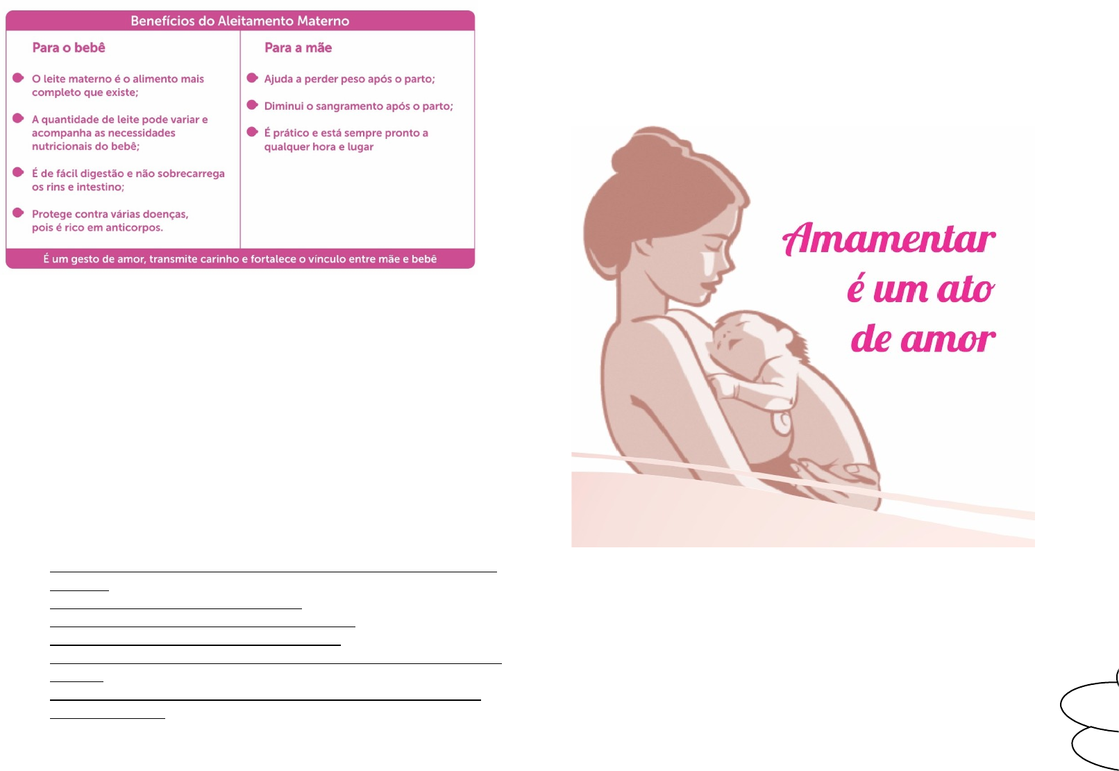 PROGRAMA TIRA DÚVIDAS DE MÃES SOBRE AMAMENTAÇÃO Procure o Proama Local: Unidade de Saúde Mãe Curitibana, Rua Jaime Reis, 331, Alto São Francisco Atendimento presencial: 7h às 17h Telefones para atendimento das 7h às 18 horas: (41) 3225-6407; (41) 3321-3229 Telefone para atendimento 24 horas: (41) 9951-3987 REFERENCIAS · https://livrozilla.com/doc/26853/clique-aqui-e-confira-a-pesquisa-realizada-pela-professora · https://bvsms.saude.gov.br/bvs/publicacoes/saude_crianca_nutricao_aleitamento_alimentacao.pdf · https://www.unicef.org/brazil/aleitamento-materno · https://www.sbp.com.br/especiais/pediatria-para-familias/nutricao/aleitamento-materno/ · https://www.curitiba.pr.gov.br/noticias/programa-tira-duvidas-de-maes-sobre-amamentacao/30205 ALEITAMENTO MATERNO Universidade Santa Cruz Aluna: Milena Alves da Cruz Schauer Curso: Enfermagem O QUE VOCE PRECISA SABER · O leite materno é o alimento mais completo para o seu bebê. Ele não vai necessitar de outro alimento até os seis de idade. Depois deste período, a alimentação complementar deve ser introduzida, porém a amamentação é recomendada até os dois anos de idade ou mais. · O momento de amamentar é um dos momentos mais ricos e importantes na sua relação com seu bebê. O bebê que mama tem melhor desenvolvimento físico, motor e emocional. · Ao mamar, seu bebê estará desenvolvendo sua estrutura oral, como língua, lábios, bochechas, ossos e músculos da face. Isto será muito importante para a mastigação e a fala dele no futuro. · Olhar nos olhos de seu filho, conversar suavemente com ele e tocá-lo com carinho quando o estiver amamentando reforçará o vínculo e a confiança entre vocês. · Quando estiver amamentando, procure um local tranquilo, confortável e calmo. · Você pode encontrar problemas durante o período de amamentação como dor, pouco leite, bico invertido, falta de informação e preparo, falta de apoio e críticas. LEMBRE-SE: Não existe leite fraco. O seu leite é o melhor alimento para o bebê e contém todos os nutrientes necessários para o seu completo crescimento e desenvolvimento. O leite materno protege a criança de obesidade, catarros, diarreias e infecção. Funciona como uma vacina. DICAS: · Você deve ingerir líquidos em grande quantidade, especialmente água (pelo menos 1 litro por dia) · O primeiro leite que desce é o colostro, mais consistente, importantíssimo para imunidade, agindo como uma vacina no organismo do bebê. · Quanto mais seu bebê sugar, mais leite você produzirá. · Faça sempre a higiene das mamas com água e sabão neutro, evite uso de cremes. · Deixe escorrer água morna nas mamas apara ajudar o leite em excesso a sair. · Use seu próprio leite para passar nas rachaduras, ele é cicatrizante. · Se você sentir muita dor, calor e vermelhidão nas mamas, procure orientação médica.