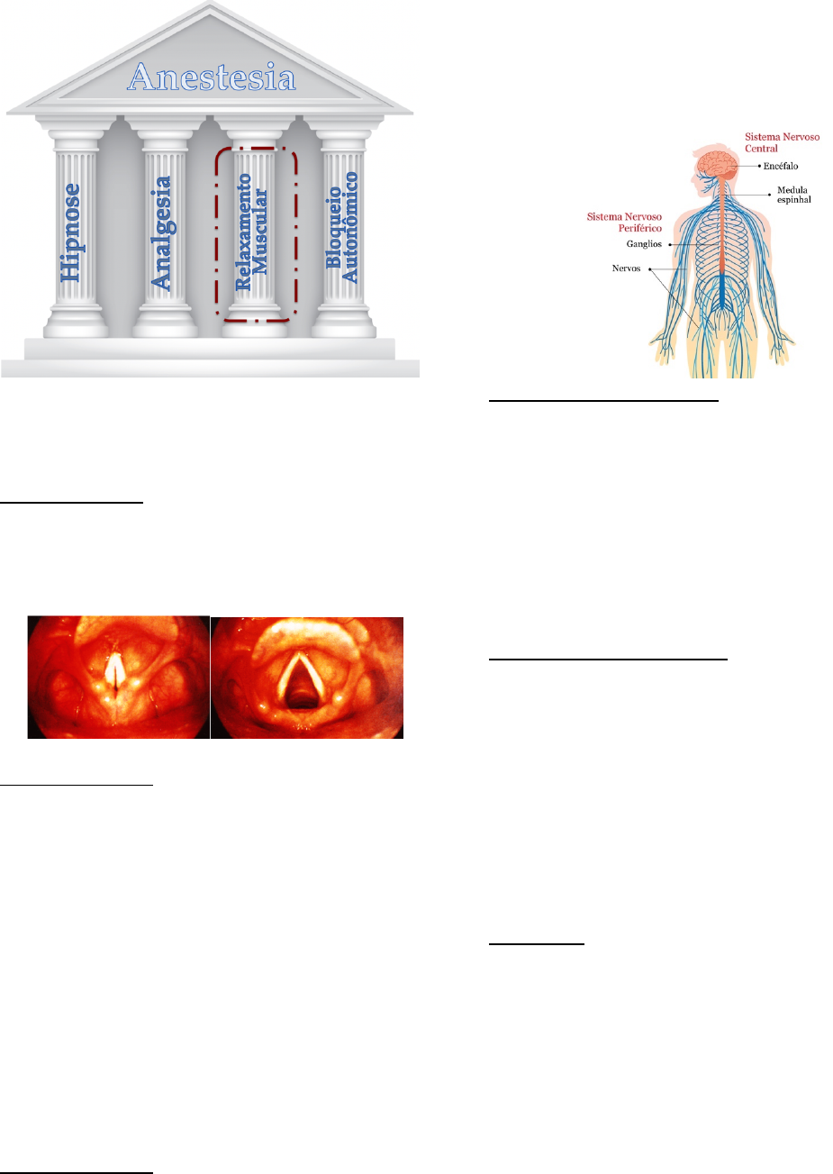 Geovana Sanches, TTXIV BLOQUEADORES NEUROMUSCULARES INTRODUÇÃO Os quatro pilares da anestesia geral Por que usar o BNM? 1. Evitar complicações 2. Propiciar adequadas condições cirúrgicas 3. Fornecer melhor qualidade na assistência Antes da cirurgia Antes da cirurgia, o BNM é útil para facilitar a intubação orotraqueal. Sem ele, o posicionamento não é adequado e pode lesionar o paciente (lesão de glote, por exemplo). Sem BNM Com BNM Durante a cirurgia • Videolaraposcopia o Para acesso à cavidade abdominal, faz-se necessário relaxamento muscular • Neurocirurgia o Para clipagem de um aneurisma, por exemplo, o paciente deve estar 100% imóvel – utiliza-se o fixador de Manfield para tal, mas caso o paciente se move, há fratura de mandíbula • Cirurgia com tórax aberto o Caso o paciente faça movimentos para respirar, há fratura de costelas Depois da cirurgia • BNM promove redução de pressão de pneumoperitônio • Quanto menor a pressão de pneumoperitônio, menor a lesão isquemia-reperfusão. Assim, há menos inflamação e menos dor pós cirurgia FISIOLOGIA DA JUNÇÃO NEURO-MUSCULAR Sistema nervoso Sistema Nervoso Periférico • Eferente o Autônomo: responsável pela atividade involuntária § Simpático: luta e fuga § Parassimpático: descansar e digerir o Somático: responsável pela atividade voluntária • Aferente Sistema Nervoso Autônomo O sistema nervoso autônomo, tanto simpático, quanto parassimpático, são compostos por dois neurônios. • Simpático o Neurônio pré-ganglionar curto o Neurônio pós-ganglionar longo • Parassimpático o Neurônio pré-ganglionar longo o Neurônio pós-ganglionar próximo ao órgão efetor Receptores • Toda primeira sinapse que ocorre fora do SNC ocorre através de um receptor colinérgico do tipo nicotínico • A segunda sinapse, por sua vez, dependerá do sistema em questão o Simpático: receptores alfa e beta § Adrenalina § Noradrenalina o Parassimpático: receptores colinérgicos muscarínicos § Acetilcolina Geovana Sanches, TTXIV Sistema Nervoso Somático O sistema nervoso somático é composto por uma única fibra neuronal que faz sinapse com a musculatura esquelética. A junção dessas estruturas recebe o nome de junção neuromuscular, sendo este o sítio de ação dos bloqueadores neuromusculares. Mecanismo de ação dos BNM Através do neurônio periférico, as fibras Aα (responsáveis pelo sistema motor) transmitem um estímulo elétrico que chega até a fenda sináptica. A partir disso, aumenta-se a quantidade de cálcio local e libera-se acetilcolina. A acetilcolina, por sua vez, age sobre os receptores nicotínicos e ativa a bomba Na/K, levando a despolarização das células e contração da musculatura. Artificialmente, é possível injetar uma droga que, estando na corrente sanguínea, passa por osmose ou difusão até a fenda sináptica e se liga ao receptor nicotínico. Diante desse receptor, há duas possíveis ações: • (1) despolarização do receptor e permanência nele, impedindo que outra molécula se ligue • (2) conexão ao receptor sem nenhuma ação subsequente, apenas impedindo que outra molécula se ligue A partir desse mecanismo de ação, classificamos os BNM em dois grandes grupos: • Despolarizante o Succinilcolina: composta por duas moléculas unidas de acetilcolina o Metabolização ocorre em cerca de 15 minutos, tempo no qual o paciente ficará bloqueado • Adespolarizante o Todos os demais bloqueadores o “ônio”: Rocurônio, pancurônio, vecurônio o “úrio”: atracúrio, cisatracúrio SUCCINILCOLINA A succinilcolina apresenta uma série de contra-indicações, as quais serão discutidas a seguir. Apesar disso, ainda é muito utilizada na sequência rápida, tendo em vista que o tempo de latência é muito curto (40 segundos). Atualmente, esse é seu único uso, sendo necessário a substituição para um adespolarizante a seguir. Vale lembrar que o rocurônio, quando em dose dobrada, também pode ser usado na sequência rápida, de forma que a succinilcolina tem cada vez menos utilidade. Aumento da pressão intracraniana A succinilcolina, inicialmente, provoca fasciculações no paciente, as quais se assemelham a um quadro convulsivo. Elas são autolimitas, durando cerca de 40 segundos. Esse período inicial deve ser respeitado e, apenas com o seu fim, pode-se prosseguir com as demais condutas. Essa fasciculação aumenta o retorno venoso e, consequentemente, o sangue que chega ao neuro-eixo. Há, assim, aumento do volume de sangue no cérebro e, tendo em vista que a calota craniana não expande, há aumento da PIC. O mesmo raciocínio é válido para pacientes com glaucoma, sendo a succinilcolina contra-indicada nesses casos. Outra condição são os pacientes com TCE prévio e hipertensão craniana. Nesses casos, a bomba venosa recruta sangue para a circulação central (neuro-eixo) e aumenta ainda mais a PIC. Dessa forma, o paciente pode evoluir com herniação. Hipercalemia Quando provoca a despolarização das células, ativa a bomba Na/K e provoca a liberação de grandes quantidades de potássio. Isso pode Geovana Sanches, TTXIV provocar o aumento de potássio plasmático de até 0,5 a 1 mEq. Para pacientes previamente hígidos, esse aumento não causa problemas. Todavia, devemos ter muito cuidado com pacientes portadores de hipercalemia prévia, como os que sofreram trauma ou renais crônicos. Pacientes acamados ou paraplégicos também não devem utilizar a succinilcolina. Isso pois, como não há utilização dos receptores nesses casos, há up regulation e aumento na quantidade de receptores, os quais podem inclusive evadir a área da junção neuromuscular. Assim, quando ocorre a despolarização, é possível que haja aumentos do potássio em até 4,5 mEq, fazendo com que o paciente evolua com parada cardiorrespiratória. ADESPOLARIZANTES Ao injetarmos os BNM adespolarizantes, a contração muscular cai rapidamente. Após um certo 