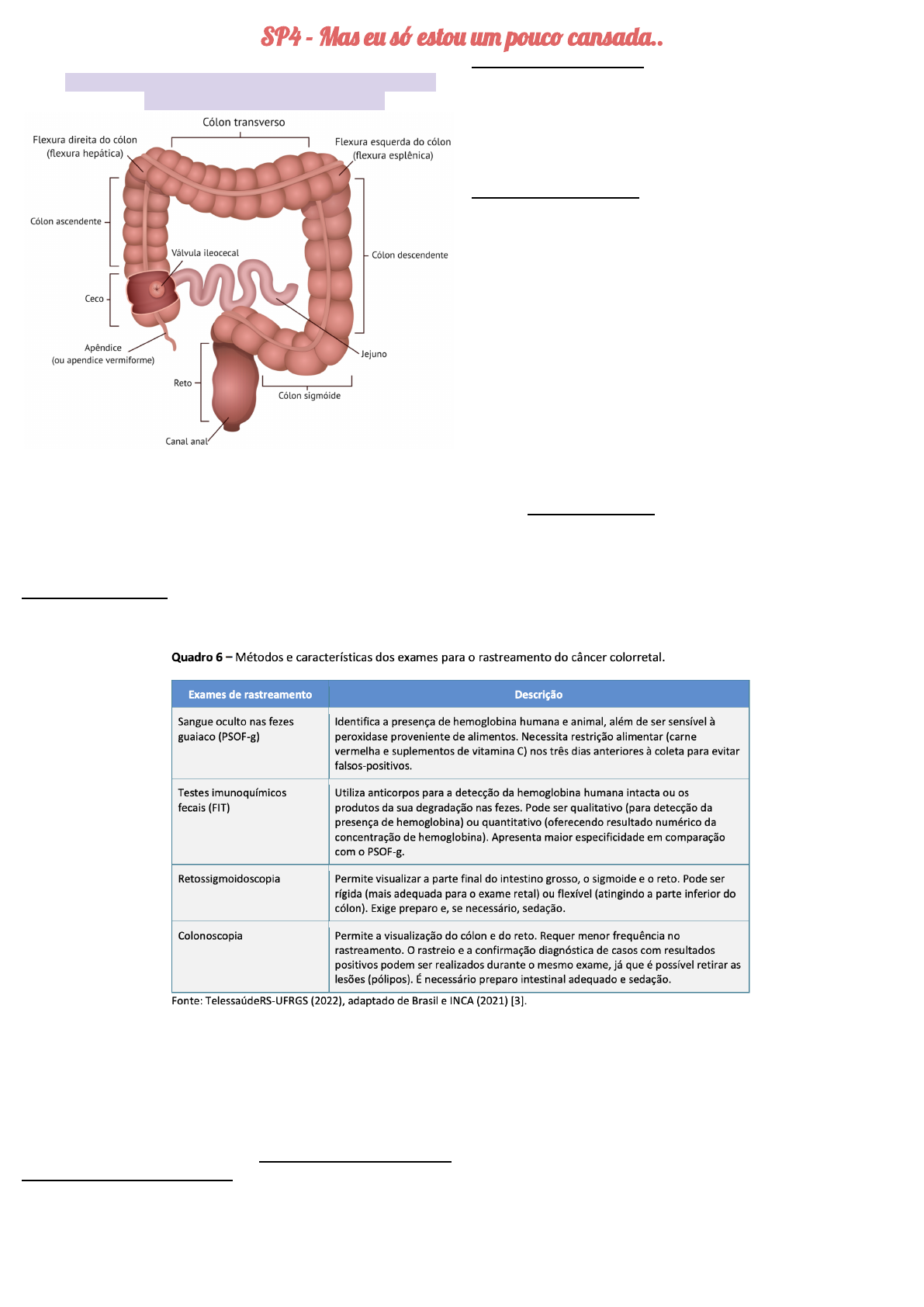 SP4 - Ma� e� s� esto� u� pouc� cansad�.. 1. Descrever a fisiopatologia, diagnóstico, prognóstico e tratamento das poliposes colorretais. Fisiopatologia - Pólipos são massas de tecido que se projetam para a luz intestinal. O pólipo intestinal é uma alteração causada pelo um crescimento anormal da mucosa do intestino grosso (cólon e reto). A maioria dos pólipos do cólon e do reto (90%) não é neoplásica e é classificada como pólipos hiperplásicos, hamartomatosos e inflamatórios. Pólipos hiperplásicos: hiperproliferação das células normais da mucosa, resultante das alterações na divisão celular no interior da cripta de Lieberkühn. Pólipos hamartomatosos: Juvenis - Lesões que contêm uma mistura de vários tecidos normais que compõem a lâmina própria do cólon. A formação está diretamente ligada à inflamação e ulceração da mucosa do cólon. Isso oblitera (faz desaparecer pouco a pouco) pequenas glândulas, que se dilatam e proliferam, formando inúmeros cistos de conteúdo mucinoso, fazendo a protrusão da luz intestinal. Pólipos inflamatórios: Lesões resultantes de uma reação inflamatória da mucosa cólica, manifestando-se como tecido de granulação em regeneração. Ocorre como resultado da ulceração que compromete todo o epitélio intestinal Diagnóstico - - Anamnese (incluindo a história familiar) - O exame físico pode evidenciar hepatomegalia dolorosa, ou massas abdominais. - O toque retal permite diagnosticar o câncer de reto distal. - O laboratório pode confirmar anemia ferropriva ou revelar alterações das enzimas hepáticas, sugerindo metástase. - O diagnóstico de câncer de cólon é estabelecido pelo exame histopatológico de espécime tumoral obtido através da colonoscopia ou do exame de peça cirúrgica. - A colonoscopia é o método preferencial de diagnóstico por permitir o exame de todo o intestino grosso e a remoção ou biópsia de pólipos que possam estar localizados fora da área de ressecção da lesão principal, oferecendo vantagem sobre a colonografia por tomografia. Prognóstico - Os fatores determinantes para maior risco de malignização para o pólipo adenomatoso são: O tamanho: quanto maior a dimensão maior é o risco O grau e a extensão da displasia presente no pólipo Seu padrão histológico: os pólipos vilosos são os de maior risco enquanto que os tubulares são os de menor risco de malignização. Maior risco quanto maior o número de pólipos adenomatosos diagnosticados. Sua forma, sendo as lesões planas e/ou sésseis as commaior risco de malignização. Pólipomaligno e bomprognóstico: - Células carcinomatosas bem ou moderadamente diferenciadas - Invasão até a camada muscular da mucosa ou inferior a 1mm na submucosa - Margens de ressecção endoscópica livres de tumor em, pelo menos, 2mm (laterais e profundas) - Sem invasão intravascular - Sem invasão dos vasos linfáticos - Ausência de brotamento (presença de grupos de células neoplásicas malignas- de 5 a 10 células na submucosa, próximos ao câncer) Pólipomaligno emau prognóstico: - Células carcinomatosas indiferenciadas - Invasão da camada submucosa maior a 1mm (medida a partir da muscular da mucosa) - Margens de ressecção endoscópica inadequadas, menor que 2 mm (laterais e profundas) - Presença de invasão tumoral linfonodal - Presença de embolia vascular Tratamento - Por apresentarem uma predisposição importante para a transformação maligna (precursores do CA colorretal), quando diagnosticados, os pólipos devem ser, em princípio, ressecados. Polipectomia endoscópica: Todo pólipo ressecado deverá ser encaminhado para exame histopatológico, para especificar o tipo do pólipo e se tem alteração displásica. Ressecção cirúrgica: As biópsias realizadas nos pólipos adenomatosos não têm valor para avaliar a presença ou o grau de displasia, nem a possibilidade de sua malignização. Por isso, todos os adenomas impossibilitados de ressecção endoscópica deverão ser retirados por cirurgia. Pode ser por laparoscopia ou, para os pólipos retais, ressecção transanal. ACOMPANHAMENTO Todos os pacientes que já tiveram ressecado um ou mais pólipos adenomatosos colorretais devem ser acompanhados pela colonoscopia, por causa da possibilidade de poderem desenvolver novos adenomas, de 1 a 5 anos após a polipectomia. Pólipos são massas de tecido que se projetam para a luz intestinal. As lesões podem ser: - Quanto à base de implantação: sésseis (base ampla) ou pediculadas (base estreita); - Quanto ao número: isoladas (esporádicas) ou múltiplas (síndromes hereditárias); - Quanto à origem: neoplásicas (adenomas - adenocarcinoma) ou não neoplásicas. Tamanho: pode variar de 1mm a mais de 10cm, classificados como: gigante (> 40 mm), grande (20 a 40 mm), médio (5 a 20 mm) e pequeno (> 5 mm). FISIOPATOLOGIA O pólipo intestinal é uma alteração causada pelo um crescimento anormal da mucosa do intestino grosso (cólon e reto). A parede intestinal é composta de mucosa, submucosa, muscular própria e serosa, essas lesões podem originar-se em qualquer uma delas. Presume-se que começam como lesões pequenas e sésseis e, em muitos casos, devido a uma tração exercida sobre a superfície, pode criar uma haste, constituindo assim um pólipo pediculado. A maioria das neoplasias colorretais, independentemente de sua etiologia, surge de pólipos adenomatosos. Apenas os adenomas são claramente pré-malignos e apenas a menor parte dos pólipos adenomatosos evolui para o câncer. Classificação: Pólipos não neoplásicos: A maioria dos pólipos do cólon e do reto (90%) não é neoplásica e é classificada como pólipos hiperplásicos, hamartomatosos e inflamatórios. Pólipos hiperplásicos: - São os mais frequentes, - geralmente pequenos (0,1 a 1,0 cm), - sésseis e múltiplos; - sua frequência aumenta com a idade (mais comum na sexta década de vida) - mais comuns no retossigmoide. - N