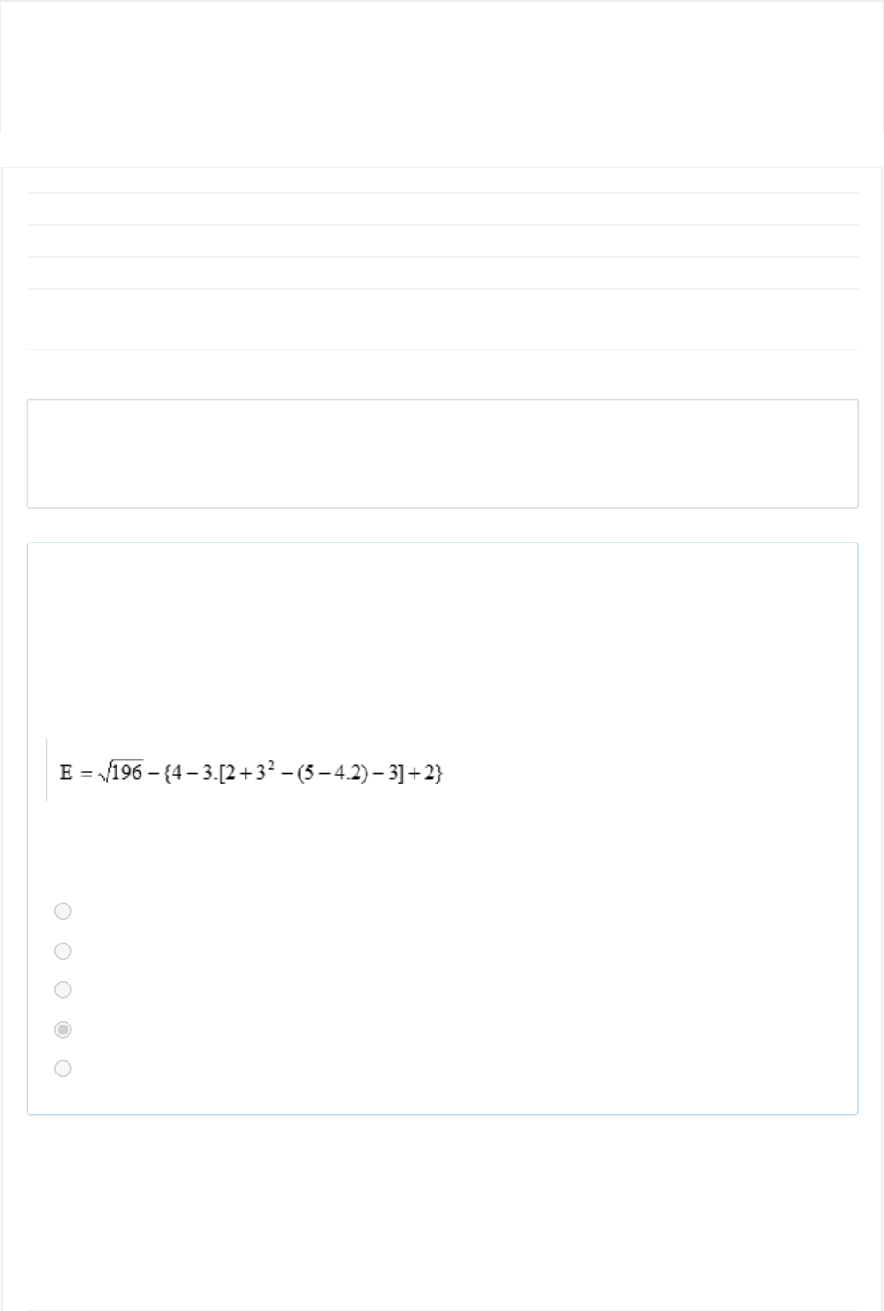 20/07/2023 17:02 ATIVIDADE ONLINE 1 - AV12023/3 https://moodle.ead.unifcv.edu.br/mod/quiz/review.php?attempt=2788774 1/7 Painel / Meus cursos / MQMADM / 📝 AVALIAÇÕES 2023/3 / ATIVIDADE ONLINE 1 - AV12023/3 Iniciado em quinta, 20 jul 2023, 16:38 Estado Finalizada Concluída em quinta, 20 jul 2023, 17:02 Tempo empregado 23 minutos 47 segundos Avaliar 1,80 de um máximo de 2,00(90%) Questão 1 Correto Atingiu 0,20 de 0,20 Para encontrar o valor de uma expressão numérica, usamos regras que definem a ordem que as operações serão feitas. Respeitando essas regras, assinale a alternativa que indica o valor da expressão Escolha uma opção: a. 52 b. 50 c. 43 d. 41 e. 51 https://moodle.ead.unifcv.edu.br/my/ https://moodle.ead.unifcv.edu.br/course/view.php?id=1744 https://moodle.ead.unifcv.edu.br/course/view.php?id=1744#section-5 https://moodle.ead.unifcv.edu.br/mod/quiz/view.php?id=119920 20/07/2023 17:02 ATIVIDADE ONLINE 1 - AV12023/3 https://moodle.ead.unifcv.edu.br/mod/quiz/review.php?attempt=2788774 2/7 Questão 2 Correto Atingiu 0,20 de 0,20 No dia 6 de outubro de 1831 em Braunschweig, Alemanha nascia Richard Dedekind. Seu pai era professor e sua mãe filha de professor. Ele nunca se casou e viveu a maior parte de sua vida com uma irmã solteira. Aos 7 anos de idade, entrou para o colégio Martino-Catharineum onde estudou Ciências, Física e Química. Despertou seu interesse pela Matemática ao estudar Física. Ele via a Física como uma ciência de estrutura lógica imprecisa. Em 1872, Dedekind fez entrar na Aritmética, em termos rigorosos, os números irracionais, que a geometria sugerira há mais de vinte séculos. Com base nos conceitos de classificação de números, analise cada um dos seguintes itens. I. O produto de dois números irracionais distintos é um número irracional. II. A diferença entre um número racional e um número irracional é um número irracional. III. A soma de um número racional com um número irracional é um número racional. IV. O produto entre um número irracional e um número racional por ser racional. Podemos afirmar que estão corretos Escolha uma opção: a. apenas I e III b. apenas I e II. c. apenas II e IV d. apenas I e IV e. apenas II e III 20/07/2023 17:02 ATIVIDADE ONLINE 1 - AV12023/3 https://moodle.ead.unifcv.edu.br/mod/quiz/review.php?attempt=2788774 3/7 Questão 3 Correto Atingiu 0,20 de 0,20 Uma equação do primeiro grau é aquela que pode ser resumida ao formato ax + b = 0 com coeficientes reais a e b. Se a for diferente de zero temos uma equação com solução única. O conjunto dos valores de x que verificam essa igualdade é chamado de conjunto solução da equação. Desta forma, determine o conjunto solução da equação: 2x – 3 = x + 4. Escolha uma opção: a. S = {3}. b. S = {6}. c. S = {7}. d. S = {5}. e. S = {4}. Questão 4 Correto Atingiu 0,20 de 0,20 As sequências de duas ou mais operações que envolvem números que devem ser realizadas respeitando determinada ordem é chamada de expressão numérica. Das alternativas abaixo, assinale a que representa o valor de E = 4 – {3 + (24 – 23) – [6 + (–1 + 5)] +6} + 10. Escolha uma opção: a. 11 b. 10 c. 13 d. 15 e. 14 20/07/2023 17:02 ATIVIDADE ONLINE 1 - AV12023/3 https://moodle.ead.unifcv.edu.br/mod/quiz/review.php?attempt=2788774 4/7 Questão 5 Incorreto Atingiu 0,00 de 0,20 Quando o conjunto domínio de função não é indicado de forma explicita, estaremos chamando de domínio real de uma função o maior conjunto dos números reais para os quais a sentença que determinar a regra está definida. Desta forma, assinale a alternativa que indica o domínio real da função abaixo: Escolha uma opção: a. Dom(f) = {xÎR/ x ≥ 4} b. Dom(f) = {xÎR/ x < 4} c. Dom(f) = {xÎR/ x ≤ 4} d. Dom(f) = {xÎR/ x ≠ 4} e. Dom(f) = {xÎR/ x > 4} Questão 6 Correto Atingiu 0,20 de 0,20 Em uma fábrica, 10 operários trabalhando 8 horas por dia conseguem fazer 1000 caixas de papelão. Quantas caixas serão feitas por 15 operários se trabalharem 10 horas por dia? Escolha uma opção: a. 1925 b. 1975 c. 1950 d. 1875 e. 1900 20/07/2023 17:02 ATIVIDADE ONLINE 1 - AV12023/3 https://moodle.ead.unifcv.edu.br/mod/quiz/review.php?attempt=2788774 5/7 Questão 7 Correto Atingiu 0,20 de 0,20 Seja f uma função real definida por f(x) = ax + b com a, bÎ R e a diferente de zero, chamamos essa função de função polinomial do primeiro grau. O gráfico dessa função é uma reta. Seja uma função o primeiro grau tal que f(2) = 5 e f(5) = 11. Desta forma, assinale a alternativa que indica o valor de f(10). Escolha uma opção: a. 24 b. 20 c. 21 d. 22 e. 23 Questão 8 Correto Atingiu 0,20 de 0,20 Um subconjunto de A x A pode ser chamado simplesmente de relação binária em A. Suponha que R é uma relação de A para B. Então R é um conjunto de pares ordenados onde cada primeiro elemento pertence a A e cada segundo elemento pertence a B. Isto é, para cada par (a,b), a ∈ A e b ∈ B. Sejam A = {1, 4, 9} e B = {–2, 2, 3}. A representação por extensão da relação R = {(x, y) Î A x B / y² = x}. Escolha uma opção: a. {(–2, 2), (1, 2), (3, 9)}. b. {(4, –2), (4, 2), (9, 3)}. c. {(–2, 1), (1, 2), (3, 9)}. d. {( –2, 4), (2, 4), (9, 3)}. e. {(1, –2), (4, 2), (9, 3)}. 2 20/07/2023 17:02 ATIVIDADE ONLINE 1 - AV12023/3 https://moodle.ead.unifcv.edu.br/mod/quiz/review.php?attempt=2788774 6/7 Questão 9 Correto Atingiu 0,20 de 0,20 Antonny fez um concurso que era constituído por uma prova de múltipla escolha com 40 questões. Ele obteve 146 pontos. O critério de correção era o seguinte: Para cada questão certa é atribuído 5 pontos, para questão errada ou deixada em branco é descontado 1 ponto. Desta forma, assinale a alternativa que indica a diferença entre o número de questões que ele acertou e que ele errou. Escolha uma opção: a. 25 b. 22 c. 23 d. 19 e. 26 Questão 10 Correto Atingiu 0,20 de 0,20 José estava vendendo um carro por R$ 54.000,00. Uma pessoa 