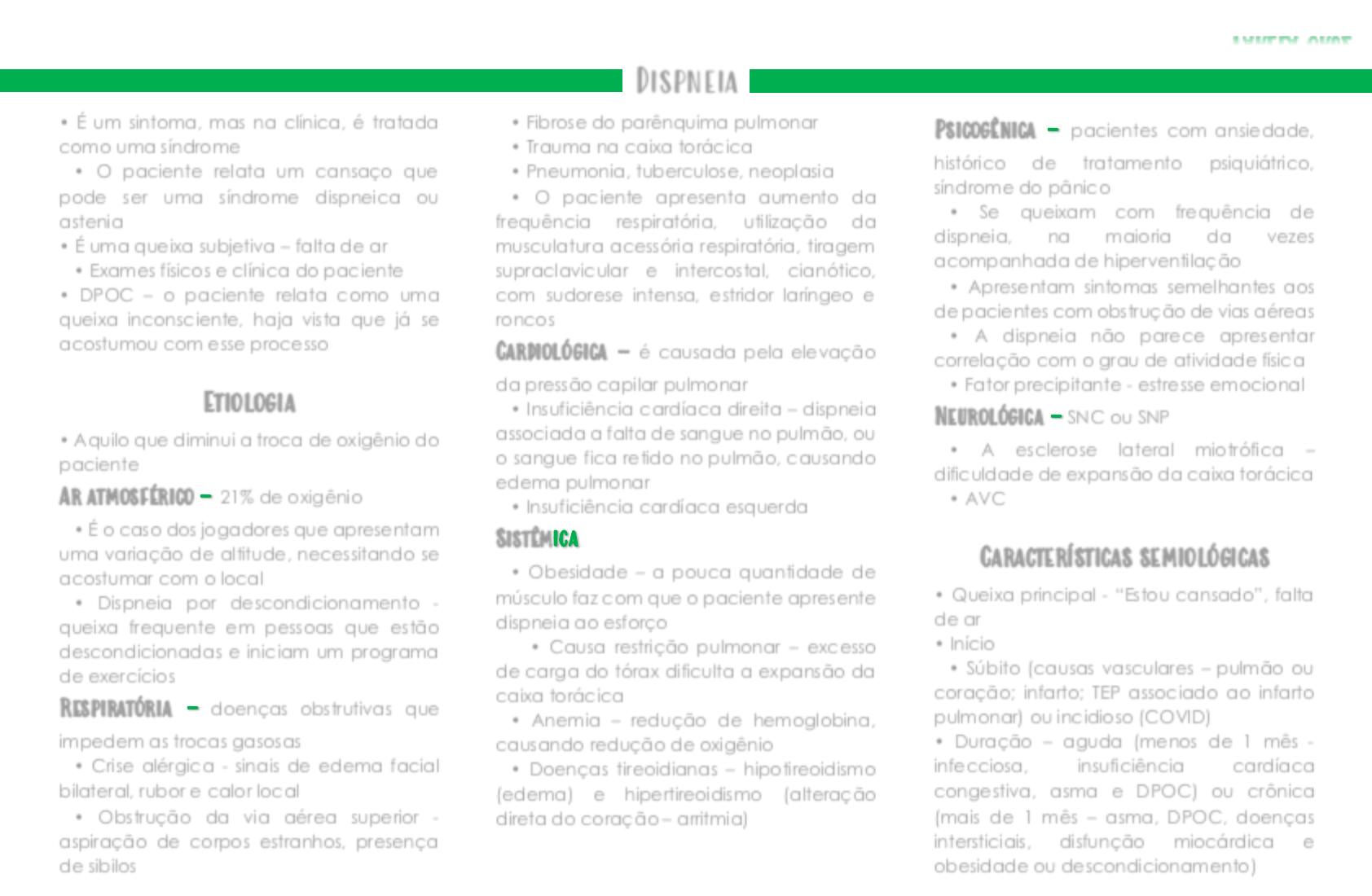 22 Dispneia • É um sintoma, mas na clínica, é tratada como uma síndrome • O paciente relata um cansaço que pode ser uma síndrome dispneica ou astenia • É uma queixa subjetiva – falta de ar • Exames físicos e clínica do paciente • DPOC – o paciente relata como uma queixa inconsciente, haja vista que já se acostumou com esse processo Etiologia • Aquilo que diminui a troca de oxigênio do paciente Ar atmosférico – 21% de oxigênio • É o caso dos jogadores que apresentam uma variação de altitude, necessitando se acostumar com o local • Dispneia por descondicionamento - queixa frequente em pessoas que estão descondicionadas e iniciam um programa de exercícios Respiratória – doenças obstrutivas que impedem as trocas gasosas • Crise alérgica - sinais de edema facial bilateral, rubor e calor local • Obstrução da via aérea superior - aspiração de corpos estranhos, presença de sibilos • Fibrose do parênquima pulmonar • Trauma na caixa torácica • Pneumonia, tuberculose, neoplasia • O paciente apresenta aumento da frequência respiratória, utilização da musculatura acessória respiratória, tiragem supraclavicular e intercostal, cianótico, com sudorese intensa, estridor laríngeo e roncos Cardiológica – é causada pela elevação da pressão capilar pulmonar • Insuficiência cardíaca direita – dispneia associada a falta de sangue no pulmão, ou o sangue fica retido no pulmão, causando edema pulmonar • Insuficiência cardíaca esquerda Sistêmica • Obesidade – a pouca quantidade de músculo faz com que o paciente apresente dispneia ao esforço • Causa restrição pulmonar – excesso de carga do tórax dificulta a expansão da caixa torácica • Anemia – redução de hemoglobina, causando redução de oxigênio • Doenças tireoidianas – hipotireoidismo (edema) e hipertireoidismo (alteração direta do coração – arritmia) Psicogênica – pacientes com ansiedade, histórico de tratamento psiquiátrico, síndrome do pânico • Se queixam com frequência de dispneia, na maioria da vezes acompanhada de hiperventilação • Apresentam sintomas semelhantes aos de pacientes com obstrução de vias aéreas • A dispneia não parece apresentar correlação com o grau de atividade física • Fator precipitante - estresse emocional Neurológica – SNC ou SNP • A esclerose lateral miotrófica – dificuldade de expansão da caixa torácica • AVC Características semiológicas • Queixa principal - “Estou cansado”, falta de ar • Início • Súbito (causas vasculares – pulmão ou coração; infarto; TEP associado ao infarto pulmonar) ou incidioso (COVID) • Duração – aguda (menos de 1 mês - infecciosa, insuficiência cardíaca congestiva, asma e DPOC) ou crônica (mais de 1 mês – asma, DPOC, doenças intersticiais, disfunção miocárdica e obesidade ou descondicionamento) Yarlla Cruz 23 • Intensidade – mais intensa (emergência) • Leve • Moderada • Grave • Escala de Borg modificada – usada para avaliar o esforço e a partir desse padrão, é avaliado o grau do paciente • Fatores agravantes – ao sentar, ao deitar, crise alérgica • Fatores atenuantes • Evolução Tipos de dispneia Ortopneia - é a dispneia que piora com a posição deitada • Na insuficiência cardíaca congestiva (ICC), por redistribuição de fluxo sanguíneo na posição deitada, aumenta a pressão capilar pulmonar, gerando dispneia • O paciente dorme sentado e de rede - o padrão de distribuição melhora ao sentar • ICC, pericardite, DPOC, disfunção de musculatura respiratória, obesidade, gestantes, ascite, tumores de mediastino anterior e traqueomalácia Trepopneia - ao decúbito lateral o paciente tem incômodo na região contralateral em que está acometido • Doença parenquimatosa pulmonar unilateral, no derrame pleural unilateral, na obstrução brônquica intrínseca ou extrínseca unilateral, na DPOC e no pneumotórax Platipneia - dispneia ao assumir a posicão sentada e que melhora ao deitar-se • Quando o paciente assume a posição sentada, o desvio de fluxo sanguíneo para as bases contribui para o aumento no distúrbio ventilação-perfusão e consequente hipóxia Dispnéia paroxística noturna - é um padrão de ortopneia noturno ao decorrer do sono • Está relacionado a problemas cardíacos, edema pulmonar • Fazem o paciente se levantar para obter melhora do quadro • Dispneia ao esforço – pequeno esforço (insuficiência cardíaca ou respiratória), médio esforço, grande esforço • Dispneia ao repouso Sintomas associados • Tosse, expectoração • Sintomas cardíacos – síncope e lipotimia (sensação pré-desmaio, sintomas antes da síncope, sudorese, escurecimento da visão) • Sibilância • Dor torácica/precordialgia • Dor nos ápices pulmonares - pneumotórax espontâneo • Dor ao inspirar/ventilatório-dependente – doenças na pleura, pneumonias, TEP, trauma • Edema – inchaço de membros inferiores ou no corpo inteiro (anasarca) • Períodos longos de imobilização, hospitalização ou viagens longas podem predispor a estase em membros inferiores e consequente tromboembolismo pulmonar • Pode ser a causa da falta de ar • Excesso de líquido que dificulta a troca gasosa Exame físico geral • Paciente hipocorado, cianose central (cardiopatias congênitas, doenças pulmonares crônicas), rosto edemaciado • Fácie renal – dificuldade ao urinar; edema palpebral • Edemas assimétricos – problemas vasculares, como a trombose venosa profunda Yarlla Cruz 24 Exame físico respiratório 1 - Inspeção do tórax do paciente • Presença de tiragens Taquipneia - respiração rápida e superficial • Intoxicação por salicilato, doença pulmonar restritiva, dor torácica pleurítica e diafragma elevado Bradipneia (respiração lenta) – menor que 12 respirações por minuto Apneia – falta de respiração; sem incursões Hiperpneia - 