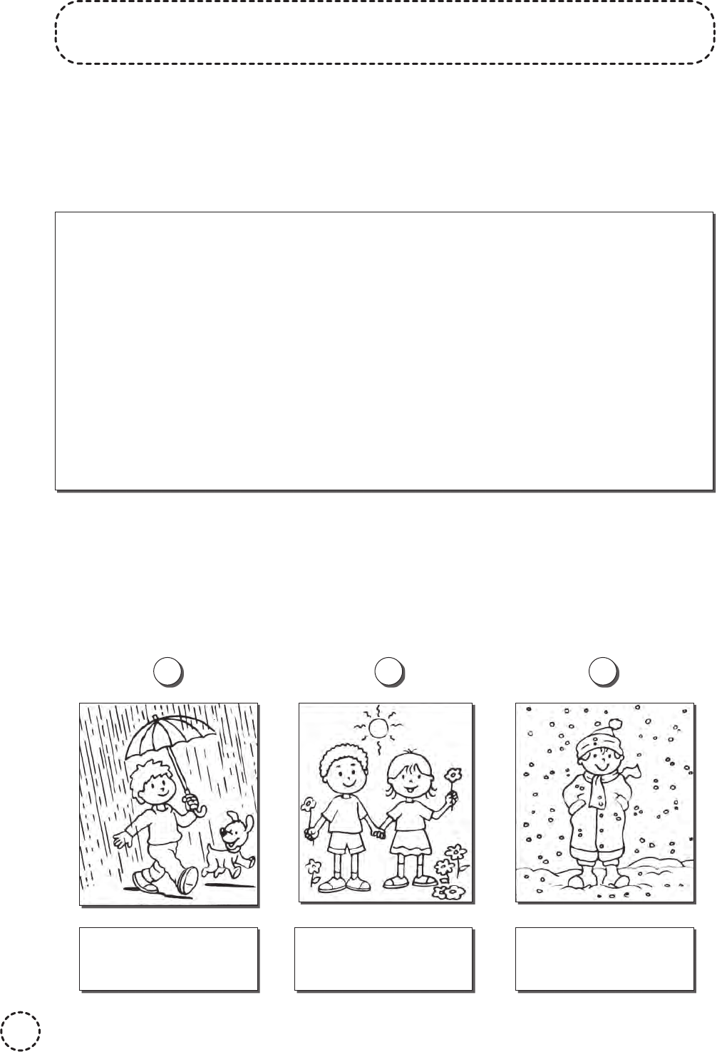 Nome: ________________________________________ Data: ____ /____ /____ 50 TEMPO ATMOSFÉRICO 1. Localize e circule neste diagrama seis palavras relacionadas ao tempo atmosférico. Depois, anote-as. A primeira letra já foi posta. C J H G R Z E C H U V A Z Q F R A R Z C V D M R M L T R T C R P L I Q R T S I G O P M L I M I V O K C L C O S E C A B Z X F O K R L Z J P K T X E C P H G J H P D U X Z Q S M T Z Q W S E R T W T E M P E R A T U R A H Y C B A Q X Z E S R L P V C Z Q W Y U M M S B V E N T O A P L X A C V B ___________________ ___________________ ___________________ ___________________ ___________________ ___________________ 2. Como está o tempo atmosférico nestas cenas? A B C C F T C S V ATIV_4oANO_GEOGRAFIA.indd 50ATIV_4oANO_GEOGRAFIA.indd 50 27/03/20 11:2827/03/20 11:28