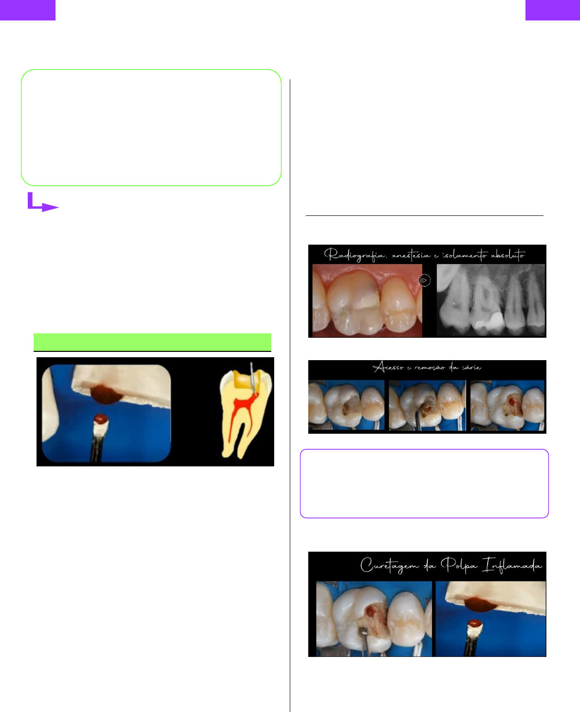 1 Capeamento pulpar direto- imediato ➜Diferença para o Mediato é que você restaura definitivo na 1° sessão e depois de 45 a 60 dias você avalia: Aspectos radiográficos Verifica a ausência de sintomas Vitalidade pulpar- testes O mediato = diante da lesão/exposição acidental. Tem todo um risco de exposição iminente. Faz toda a curetagem/limpeza da cavidade, e quando expõe, a gente preserva, avalia e após, restaura. O imediato = quando já se tem uma exposição direta. Restaura definitivo e avalia após 45 a 60 dias. Curetagem pulpar ➜ Remoção parcial da polpa coronária inflamada exposta e proteção da polpa remanescente não inflamada. (remoção APENAS da porção exposta/inflamada) Indicacoes: •Casos de exposição pulpar recente; •Exposição pulpar acidental durante o preparo; •Procedimento planejado durante a remoção do tecido cariado; •Fratura coronária envolvendo tecido pulpar. Contra indicacoes ➜Historia de dor espontânea e contínua (todo o processo inflamatório já se deu ao longo da polpa); ➜Evidência radiográfica de degeneração pulpar; ➜Exsudato purulento ou seroso vindo da exposição; ➜Não haver sangramento. ↪Lesão de cárie secundária (o dente já havia sido restaurado e teve uma área de desadaptação entre o material restaurador e o dente, e foi necessária a remoção do material, para ter acesso à lesão de cárie e poder removê-la). 2 A remoção da polpa inflamada pode ser feita com uma carbide lisa, a maior que couber na cavidade, exatamente na região da exposição, ou então com uma cureta, também lisa (não pode ser a mesma cureta que foi usada pra remover o tecido cariado). ➜LAVAR A CAVIDADE COM SOLUÇÃO DE HIDRÓXIDO DE CÁLCIO (PA) →Lavagem com seringa descartável ou → Embeber um algodão com essa solução e deixar na cavidade por um tempo. (a cavidade fica esbranquiçada por conta do cálcio) ➜PÓ DE HIDRÓXIDO DE CÁLCIO →Colocar exatamente me cima da área de exposição pulpar (a polpa, por estar hidratada, vai acabar “abraçando” esse pó) ➜CIMENTO DE HIDRÓXIDO DE CÁLCIO →Vai formar uma película protetora em cima do pó (vai estar forrando o pó). ➜CIMENTO DE IONÔMERO DE VIDRO ▶ACOMPANHAMENTO (2° SESSÃO) ·45 a 60 dias; ·Verificar ausência de sintomas; · Restauração definitiva. ↷ ➜RESTAURAÇÃO DEFINITIVA E ACOMPANHAMENTO RADIOGRÁFICO PULPOTOMIA (não é a remoção total) •Indicação: →Polpa exposta em um dente com ápice incompleto; ↪Removo todo o material, até chegar onde eu expus a polpa. Feito isso, eu venho com o cimento de hidróxido de cálcio (o pó já não vai ser mais usado porque não tem polpa exposta). O cimento de hidróxido de cálcio vai por cima da área de risco de exposição pulpar (já fiz toda a proteção, já formei dentina terciária reacional), então eu coloco o cimento de hidróx. de cálcio, e depois, a porção de base (que vai ser o ionômero de vidro - para diminuir a profundidade da cavidade, para auxiliar durante o procedimento restaurador) ↪O ionômero de vidro não pode estar à margem da restauração, para garantir a adesão do material restaurador. 3 →Exposição pulpar acidental ampla; →Exposição pulpar recente. •Vantagem: →Permite a complementação da rizogênese •Desvantagem: →Calcificação do canal (não dá pra ver a luz do canal na radiografia) que dificulta o tratamento endodôntico futuro (não realiza a pulpotomia porque vai remover uma parte da polpa, que quase já não tinha, e dificulta o tratamento endodôntico futuro- se necessário) ↪Quando vemos na radiografia que a polpa está mais atrésica, que a luz do canal já está muito mais fina, não lançamos mão da pulpotomia. ➜Pulpotomia •Remoção total da polpa inflamada exposta e proteção da polpa remanescente não inflamada. 1- remoção do tecido cariado 2- lavagem com solução de hidróxido de cálcio 3- aplicação de hidróxido de cálcio PA 4- cimento de hidróxido de cálcio ▶Contra indicacoes ➜Historia de dor espontânea e contínua ➜Evidência radiográfica de degeneração pulpar; ➜Exsudato purulento ou seroso vindo da exposição; ➜Não haver sangramento. ▶ACOMPANHAMENTO (2° SESSÃO) ·75 a 90 dias (para o ápice estar completamente formado); ·Verificar ausência de sintomas; · Restauração definitiva. (pode ser com resina composta ou ionômero de vidro) ▶Recomendacoes ☑Não mastigar e evitar alimentos muito frios ou muito quentes sobre o dente tratado (pode favorecer a inflamação da polpa); ☑Pode-se receitar um analgésico; ☑Explicar sobre as reações dos dentes; ☑Retorno em caso de dor. 1 2 3 4 Uma polpa saudável, viva, é aquela que sangra. Uma polpa mais rósea, mais alaranjada, é uma polpa inflamada (parece uma gelatina) 4 ▶Sucesso da tecnica ☑Ausência de dor; ☑Reposta favorável do teste de vitalidade pulpar e percussão; ☑ Formação de ponte dentinária e ausência de lesão periapica l- RX; ☑ Formação de dentina terciária na câmara pulpar. Indicacoes da pulpotomia Resumo das protecoes pulpares Protecao das cavidades • Rasa e média: Hibridização / sistema adesivo • Profunda: CIV e hibridização / adesivo • Bastante profunda: Pó ou pasta de Hidróxido de cálcio, cimento de hidróxido de cálcio, ionômero de vidro e adesivo. Expôs: Solução, pó, pasta, cimento, CIV e adesivo. Não expôs: cimento, ionômero e adesivo.