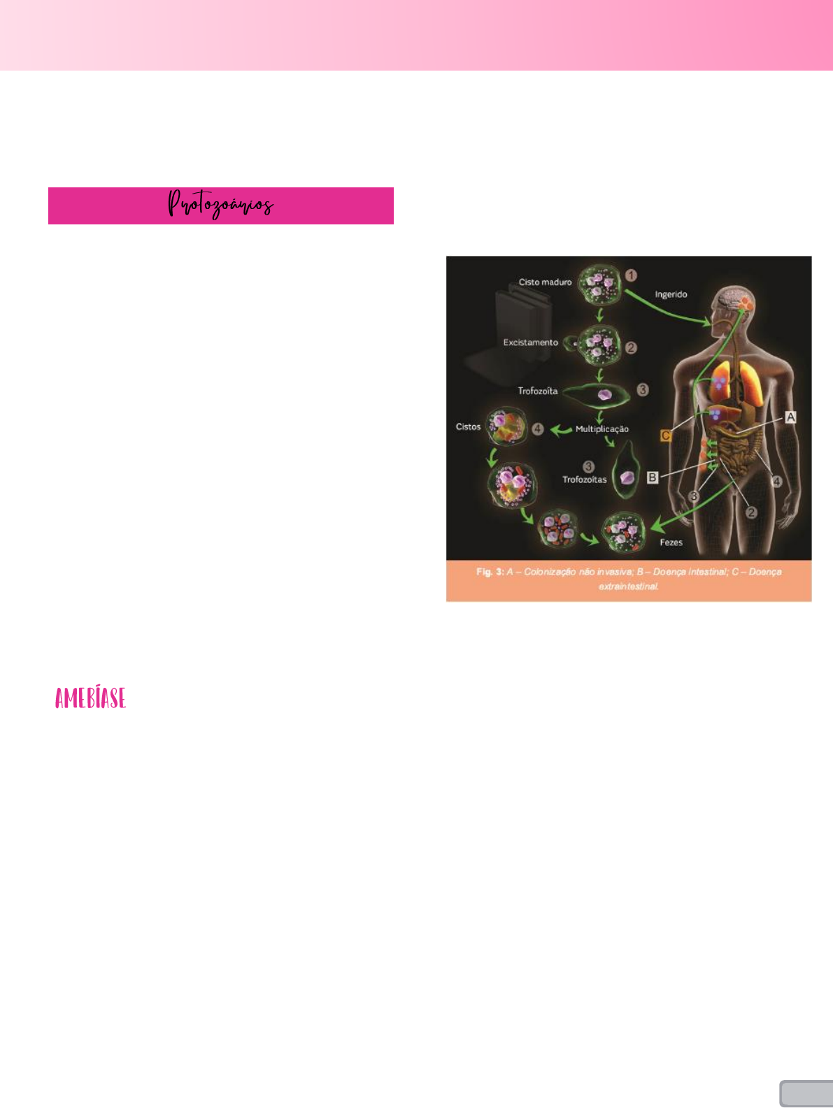 Sandy Vanessa Medicina o8 – UFPE CAA 1 Dois principais agentes = protozoários – entamoeba hystolitica e giadia lamblia – helmintos – nemtalmintos (ascaris, ancilostomídeo/estrongiloides trichus/ enterobius) e platelmintos (schistosoma/taenia). Características • Unicelulares • Não causam eosinofilia • Maioria assintomática, mesmo assim deve ser tratado • Transmissão fecal-oral = comum em regiões subdesenvolvidas, sem saneamento/rede de esgoto Ciclo/diagnóstico • Forma parasitária = trofozoíto, que divide por divisão binária simples = acaba sendo pouco resistente, por isso encista • O cisto que vai poder ser encontrado nas fezes e é ele que é ingerido Tratamento • Nidazois = metro, sec, ti • Nitazoxamida = Annita = poliparasitário Entamoeba histolytica. Hábitat = Cólon = capacidade de invasão Possui dois estágios evolutivos: cisto (arredondado, tetranucleado) e trofozoíta (pseudópodes, mononucleado, pode conter hemácias fagocitadas em seu interior). Os cistos representam a forma infectante, sendo adquiridos por meio da ingestão de água ou alimentos contaminados por fezes. A aquisição pela via sexual raramente acontece, através do contato oral-anal. Os cistos sobrevivem no meio ambiente e resistem à acidez gástrica, eclodindo no intestino delgado onde liberam trofozoítas que amadurecerão no cólon. O homem é o principal reservatório. Os trofozoítas podem viver como comensais ou podem invadir a parede do cólon (causando colite amebiana). Eventualmente atingem a corrente circulatória, disseminando-se à distância (ex.: abscessos amebianos em fígado, pulmão ou cérebro). Portadores assintomáticos de E. histolytica são grandes disseminadores da infecção, eliminando cistos infectantes em suas fezes durante meses ou anos. Os trofozoítas também pode ser encontrados nas fezes, porém são destruídos pelo O2 ambiente, sendo incapazes de causar infecção. Incubação de 2-6 semanas após a ingestão dos cistos. Quadro clínico intestinal • Clínica = diarreia aguda (disenteria) e crônica = diarreia mucossanguinolenta, com 10-12 dejeções/dia, acompanhada de náuseas, vômitos, cefaleia, fevre, além de tenesmo e cólicas abdominais intensas. • Ameboma = massa palpável, dilatação de alças intestinais = diagnóstico parecido com câncer colo- retal • Quadros mais graves (colite amebiana fulminante) podem cursar com febre alta, leucocitose e perfuração intestinal Quadro clínico extra-intestinal • Abscesso hepático amebiano = dor QSD, febre, sinal de Torres-Homem (dor à percussão no gradil costal direito), hepatomegalia, febre, sudorese noturna. Leucocitose neutrofilica e aumento moderado das enzimas hepáticas. • Pode formar abscessos pulmonares e cerebral tb. {Parasitoses Intestinais} Sandy Vanessa Medicina o8 – UFPE CAA 2 • Diagnóstico = imagem, sorologia (ELISA) • Não precisa drenar Entamoeba coli/ Ioda,oeba butschlii/ Endolimax nana = comensais = não precisa tratar Diagnóstico • Tradicionalmente, o diagnóstico de amebíase intestinal é feito por meio da pesquisa de trofozoítos ou cistos nas fezes (pelos métodos de Faust, Richtie ou MIF, analisando-se três amostras consecutivas). • O encontro de trofozoítos contendo hemácias fagocitadas no exame de fezes a fresco é considerado patognomônico • A pesquisa de antígeno fecal é mais sensível do que o exame de parasitológico de fezes • PCR = meio mais acurado = caro. • Pacientes com forte suspeita clínica que apresentam exames de fezes negativos podem ser submetidos à colonoscopia com escovado e/ou biópsia da mucosa; desse modo, os trofozoítas podem ser diretamente evidenciados, além de se permitir o diagnóstico diferencial com outras condições. • O diagnóstico de abscesso amebiano é feito pela combinação de métodos de imagem (USG ou TC) com sorologia antiameba. Tratamento • Imidazólicos – secnidazol, metronidazol e tinidazol + drogas de ação antiameba intraluminal. • Formas intestinais não graves: • Intertinais graves ou extraintestinais • A drenagem do abscesso hepático por via percutânea estará indicada somente se houver necessidade de excluir abscesso piogênico, ausência de resposta clínica após quatro dias, ameaça de ruptura iminente (ex.: crescimento progressivo, localização no lobo esquerdo do fígado, risco de ruptura para a cavidade pericárdica). A drenagem cirúrgica aberta não é recomendada, exceto em casos graves, quando o abscesso é inacessível à aspiração percutânea. O tratamento de suporte também deve ser instituído, com hidratação e correção do equilíbrio hidroeletrolítico. Giardia lamblia, Hábitat = delgado = capacidade de atapetar e inflamar = forma barreira mecânica Assim como a ameba, ele existe sob duas formas: cisto (infectante) e trofozoíta (não infectante). Ciclo • O trofozoíta tem a propriedade parasitária, e se reproduz assexuadamente, por divisão binária. O encistamento ocorre sempre que há mudanças no pH ou na concentração de sais biliares do meio. • O cisto é eliminado nas fezes, e sobrevive por semanas a meses em água fresca gelada. A cloração da água não mata os cistos (somente a filtração e a fervura conseguem eliminá-los). • O homem é infectado ao ingerir água não filtrada ou alimentos não cozidos contaminados. A eliminação fecal dos cistos pode ser contínua ou intermitente. • Como eles já são infectantes imediatamente após serem eliminados, a transmissão interpessoal (anal- oral) é comum dentro de instituições como creches, e também pode ocorrer pela via sexual. Sandy Vanessa Medicina o8 – UFPE CAA 3 Quadro clínico • Maioria assintomática • Diarreia alta não-invasiva aguda ou crônica. • Incubação de 7-10 dias • Dor abdominal do tipo cólica. • Má-absorção/atrofia de vilosidades = intolerância à lactose. • Este quadro pode ser de natureza crônica, recidivante, caracterizado po
