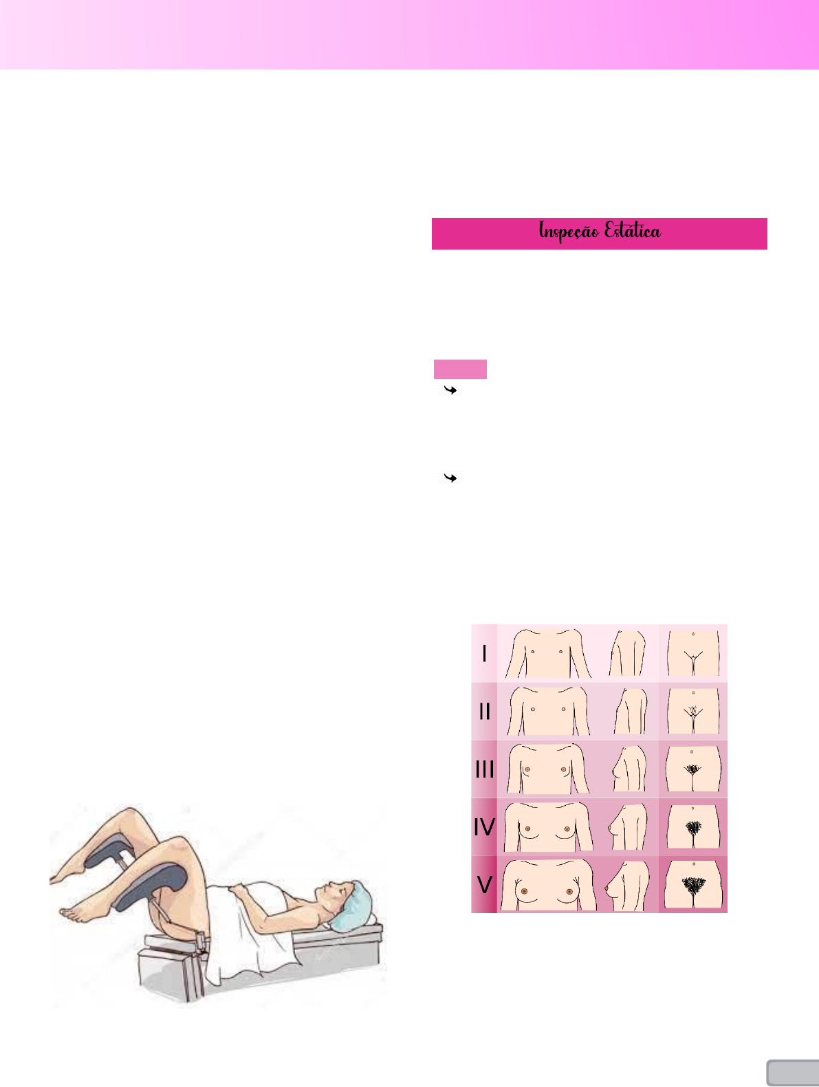 Sandy Vanessa Medicina o8 – UFPE CAA 1 Constitui para muitas mulheres o promeiro contato com um profissional de saúde, o que envolve ansiedade e nervosismi, sendo necessária uma relação médico-paciente mais cuidadosa. Objetiva a avaliação da pelve feminina, incluindo a inspeção estática e dinâmica, toque vaginal simples ou bimanual e exame especular, além do teste de Schiller e do ácido acético. O primeiro exame pode ser feito desde o nascimento, na avaliação de anomalias congênitas, como genitália ambígua, hímen e ânus imperfurados, e em qualquer fase da vida da mulher. Na criança, o exame é realizado para avaliar vulvovaginites, presença de corpos estranhos, sangramento e violência sexual. Na adolescência, o exame deve ser focado no início da atividade sexual, a partir do rastreamento e orientação sobre ISTs, contracepção e prevenção do câncer, além de avaliar as alterações mentruais. Na mulher adulta e em pós-menopausa, o exame tem como alvo a prevenção e o diagnóstico de diferentes afecções.. O exame é realizado na posição ginecológica, com a paciente deitada e com a face voltada para cima, flexão de 90 º dos quadris e joelhos, expondo o períneo. → Posição litotômica ou talha. O examinador posiciona- se entre as pernas da paciente. Além do exame ginecológico apurado e benfeito, o ginecologista dispõe de vários exames complementares, incluindo colposcopia, histeroscopia, ecografia, tomografia, ressonância, biopsias, culturas de secreções, entre outros. Deve-se lembrar, porém, que a indicação desses exames está diretamente vinculada à qualidade do exame clínico. Inicia-se com a avaliação da pilificação, principalmente do monte de vênus, da região perineal, da raiz das coxas e da região anorretal. Busca-se: Rarefação ou ausência de pelos – pacientes pós- menopausa ou com síndromes associadas à insensibilidade aos androgênios, como a síndrome de Morris. Aumento dos pelos – hirsutismo, que pode ser decorrente de distúrbios dos ovários ou das suprarrenais Observa-se a morfologia e trofismo dos grandes e pequenos lábios, bem como o seu desenvolvimento (relacionado à idade) → Escala de Tanner As glândulas de Bartholin não são palpáveis quando normais, mas podem constituir tumorações quando inflamadas. {Exame Físico Ginecológico} Sandy Vanessa Medicina o8 – UFPE CAA 2 Na avaliação do hímen, observam-se integridade e morfologia. Na avaliação do períneo deve-se observar a presença de rupturas advindas de partos, lesões da pele e de processos infecciosos ou inflamatórios. Solicita-se à paciente que realize movimentos que aumentem a pressão abdominal, tornando evidentes as distopias genitais. A manobra de Valsava consiste em solicitar que a paciente tussa para avaliar se ocorre procidência do útero, abaulamento das paredes vaginais ou perda de urina. As distopias são reflexo do enfraquecimento das estruturas que formam o assoalho pélvico. Quando ocorre a procidência da parede vaginal anterior denomina-se cistocele, já posterior retocele. Quando indicado, o teste de Collins, que é a embrocação da vulva com o azul de toluidina. As lesões coradas de azul são consideradas suspeitas, sendo necessária a realização de biópsia. O ácido acético também pode ser utilizado, resultando em lesões coradas de branco, chamadas de acetobrancas. Utiliza-se o espéculo de Collins, articulado e disponível em 3 tamanhos. O espéculo deve ser introduzido com uma angulação de 45° para se desviar do meato uretral. Posteriormente, é colocado de tal forma que as paredes anterior e posterior sejam deslocadas. Inicia-se com a inspeção das paredes vaginais, observando seu trofismo, que reflete a ação do estrogênio sobre este tecido. Nas pacientes na menacme, as paredes vaginais encontram-se rugosas e úmidas, e na pós-menopausa, lisas e secas. A presença de secreções vaginais e seu aspecto também devem ser relatados. Uma secreção clara, cristalina e límpida é considerada fisiológica. Representa a produção normal das glândulas da endocérvice e do vestíbulo vulvar. Se secreção anormal for identificada, deve ser avaliada quanto a volume, cor, consistência e odor. O pH da secreção normal é inferior a 4,5 e um pH elevado pode ser atribuído a infecção ou substâncias exógenas. Quando esta secreção apresenta-se com colorações diferentes, como esverdeado, amarelado, acinzentado e branco, provavelmente está presente algum patógeno. Deve-se conferir atenção à avaliação dos fundos de saco vaginais, principalmente se houver abaulamentos, que podem indicar a presença de tumoração pélvica, ou coleção intraabdominal, como sangue ou pus. Na avaliação do colo do útero é importante relatar a localização, a morfologia, o tamanho e o aspecto do orifício do colo do útero. Esses dados guiam para a realização de diagnósticos diferenciais. O colo do útero, por exemplo, pode estar desviado para um dos lados, em razão da presença de um tumor ovariano ou Sandy Vanessa Medicina o8 – UFPE CAA 3 mesmo de um grande mioma. Seu tamanho é um relato importante, principalmente na obstetrícia, na qual o colo passa por processos plásticos, durante um trabalho de parto, perdendo espessura e aumentando a dilatação do seu canal, para possibilitar a passagem do feto. O colo do útero também pode ser acometido pelo câncer. Com o objetivo de prevenir essa doença, no momento do exame especular, faz-se a coleta de material para o exame de Papanicolaou, conhecido como citologia oncoparasitária. Realizam-se também os testes do ácido acético e de Schiller (lugol). O exame de Papanicolaou está indicado em todas as pacientes de 25 a 60 anos, ou que já tiverem iniciado a vida sexual antes desta faixa de idade, uma vez por ano, e após dois exames anuais normais consecutivos negativos, a cada 3 anos. Cuidados antes do exame: Não deve utilizar ducha durante 48 h Ev