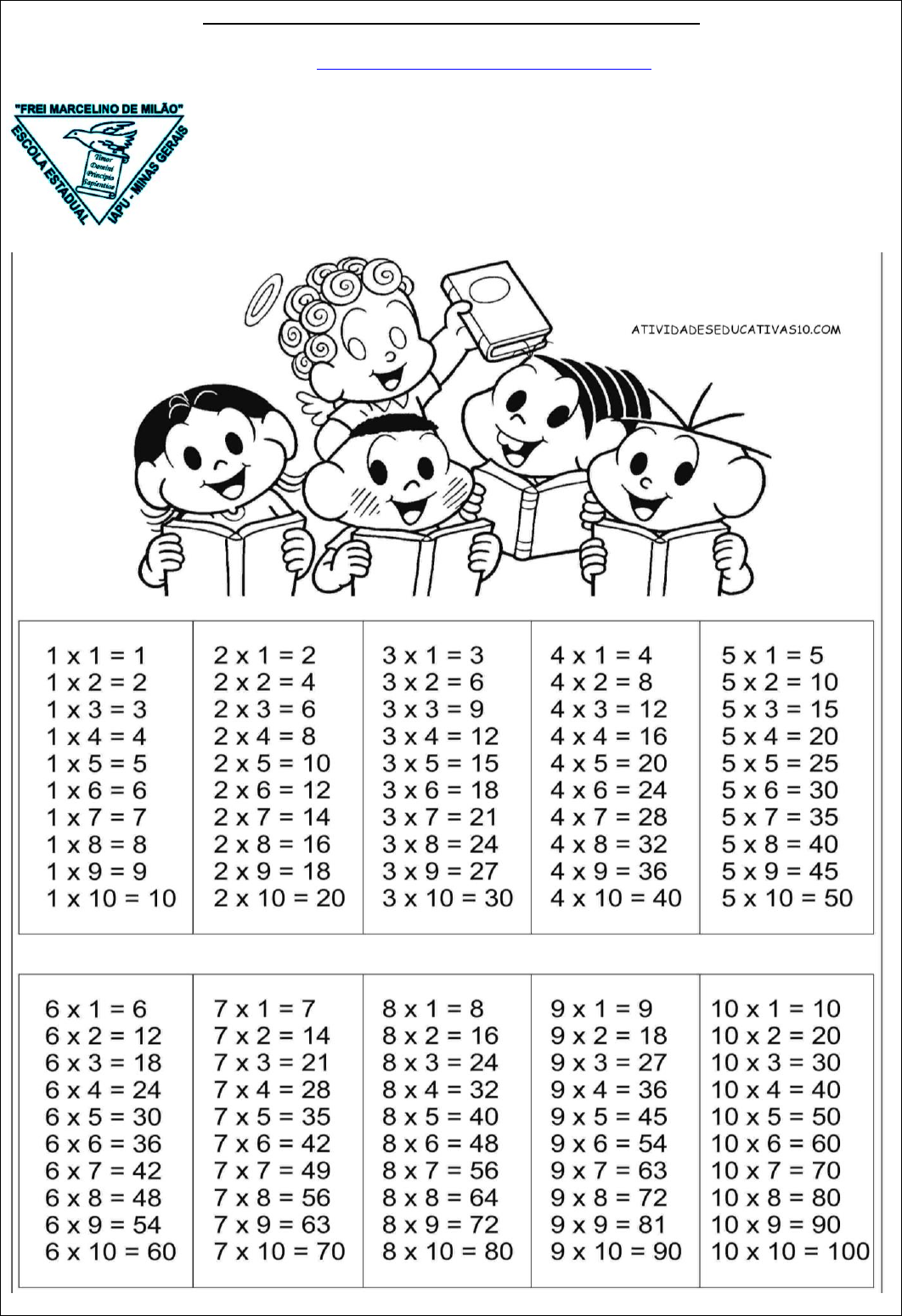 Escola Estadual “Frei Marcelino de Milão” P.0.4.5.C.3 Rua: Farmacêutico Jaime Mafra, n° 170 – Centro - CEP:35190-000 Email: escola.20354@educacao.mg.gov.br Iapu – MG – tel.: (33) 33551140 Disciplina: Matemática Conteúdo: Tabuada de multiplicação Série: 6° Ano Turma: ____ Professora: __________ Data: ___ / ___ / ___ Aluno (a): ______________________ _________________________________________________________________________ mailto:escola.20354@educacao.mg.gov.br Pinte o mosaico de acordo com a legenda abaixo: 4 – amarelo 6 – vermelho 8 – verde claro 10 – verde escuro 12 – azul claro 14 – azul escuro 16 – rosa 18 – preto 20 – branco