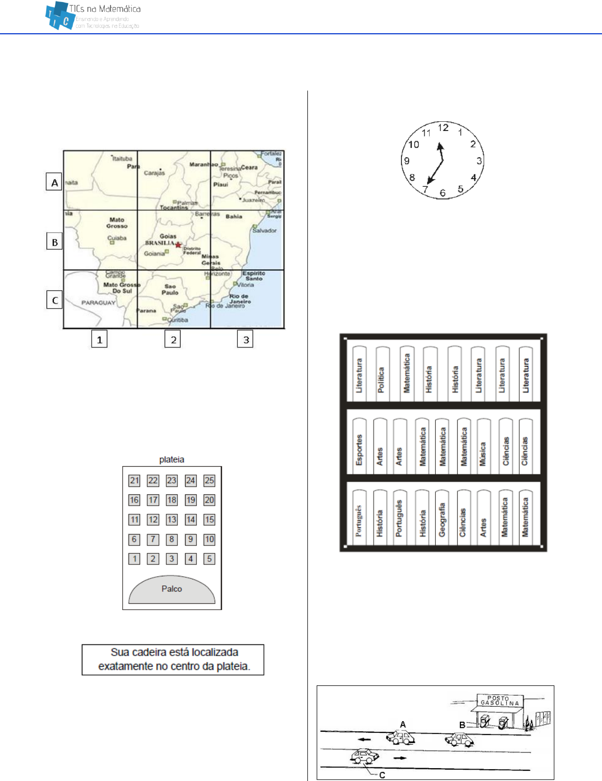 Questões referentes ao descritor 01 de Matemática do 5º ano 1 D1 – Identificar a localização e movimentação de objeto em mapas, croquis e outras representações gráficas A figura abaixo é um fragmento do mapa do Brasil. Nela, a localização do estado de Goiás é indicada por B2. Desta forma, a identificação do estado de Ceará é: (A) A3 (B) C1 (C) C3 (D) B2 ________________________________________________________ A figura abaixo mostra um teatro onde as cadeiras da plateia são numeradas de 1 a 25. Mara recebeu um ingresso de presente que dizia o seguinte: Qual é a cadeira de Mara? (A) 12 (B) 13 (C) 22 (D) 23 ________________________________________________________ Maria colocou um bolo para assar na hora indicada no relógio da figura seguinte. O bolo ficou pronto em 30 minutos. Que horário o relógio indicava quando o bolo ficou pronto? (A) 11 horas 50 minutos. (B) 12 horas 5 minutos. (C) 12 horas 50 minutos. (D) 13 horas 10 minutos. ________________________________________________________ O desenho a seguir mostra uma estante onde são guardados diversos livros. Um aluno está de frente para essa estante. Nessa posição, o livro de Música é o terceiro a partir de sua: (A) esquerda, na prateleira do meio. (B) direita, na prateleira de cima. (C) esquerda, na prateleira de cima. (D) direita, na prateleira do meio. ________________________________________________________ Três carros movimentam-se numa rodovia. Questões referentes ao descritor 01 de Matemática do 5º ano 2 Depois de algum tempo, podemos afirmar que: (A) O carro A vai cruzar com os carros B e C. (B) O carro B e C estão rodando em direção opostas. (C) O carro A está se aproximando do posto de gasolina. (D) O carro C está rodando na mesma direção que o carro A. ________________________________________________________ Observe o parque de diversões representado abaixo: Assinale a alternativa que mostra a localização do carrossel. (A) N3. (B) P3. (C) N2. (D) P2. ________________________________________________________ Ana fez o desenho de algumas ruas de seu bairro, próximas à sua casa. Localizou sua casa e marcou- a com seu nome. Localizou também a casa de quatro amigas e marcou-as com o nome de cada uma. Veja abaixo o que ela fez. A casa que fica mais próxima à casa de Ana é a de sua amiga: (A) Carla (B) Laura. (C) Lúcia. (D) Maria. Veja abaixo o tabuleiro de um jogo. ________________________________________________________ O brinquedo preferido de João está no seu lado esquerdo. Qual é o brinquedo preferido de João? (A) Peteca (B) Pipa (C) Bola (D) Bicicleta ________________________________________________________ Observe na figura abaixo, o caminho percorrido por Tiago. Ele saiu do ponto A e chegou ao ponto B. Como ele fez para chegar ao ponto B? (A) Avançou 6, girou para a esquerda, avançou 4. (B) Avançou 5, girou para a direita, avançou 3. (C) Avançou 5, girou para a esquerda, avançou 3. Questões referentes ao descritor 01 de Matemática do 5º ano 3 (D) Avançou 4, girou para a direita, avançou 2. ________________________________________________________ A figura a seguir representa um trecho do mapa de um bairro. Se a praça central tem a forma de um retângulo, então a rua T é paralela à rua (A) P (B) Q (C) R (D) S ________________________________________________________ Marcelo fez a seguinte planta da sua sala de aula: Das crianças que se sentam perto da janela, a que senta mais longe da professora é (A) o Marcelo. (B) a Luiza. (C) o Rafael. (D) a Tânia. ________________________________________________________ Maria está olhando pela janela. O que ela vê à direita da estrada? (A) Um barco e uma casa. (B) Um cachorro e uma casa. (C) Uma árvore e um guarda-sol. (D) Um surfista e um barco. ________________________________________________________ O painel dos botões com os números dos andares no elevador de um edifício está organizado em 2 colunas e 14 linhas, conforme a figura abaixo. Quantos botões têm neste painel? (A) 28 (B) 18 (C) 16 (D) 14 ________________________________________________________ Observe a figura abaixo. Em qual posição está a roda da frente do carro? (A) C1 (B) D3 (C) C3 (D) D2 ________________________________________________________ O barco na figura ao lado está localizado na posição X. Que posição é esta? (A) D4 (B) D5 Questões referentes ao descritor 01 de Matemática do 5º ano 4 (C) E4 (D) E5 ________________________________________________________ Ivone precisa programar o relógio para tocar o alarme às 6 horas e 10 minutos. Observe as figuras que mostram relógios em diferentes horários. Assinale a alternativa que mostra o número da figura do relógio indicando esse horário. (A) 1 (B) 2 (C) 3 (D) 4 ________________________________________________________ No diagrama abaixo, a localização de cada objeto é identificada por uma letra e um número. Por exemplo, a casa está localizada em B,2. De acordo com a figura, o carro está localizado em (A) C, 4 (B) C, 1 (C) B, 4 (D) A, 4 ________________________________________________________ Veja o desenho abaixo. O gatinho, para alcançar seu mingau, seguiu o caminho que está assinalado. Para encontrar seu mingau, o gatinho andou: (A) seis quadradinhos para frente e cinco quadradinhos para sua direita. (B) cinco quadradinhos para cima e quatro quadradinhos para o lado. (C) seis quadradinhos para frente e cinco quadradinhos para seu lado esquerdo. (D) cinco quadradinhos para cima e quatro quadradinhos para sua direita. ________________________________________________________ Observe a figura a seguir: Em relação à vaca a bola está: (A) à esquerda. (B) à direita. (C) atrás. (D) na frente. ________________________________________________________ Lucas e André adoram brincar de caça ao tesouro. Eles querem descobrir a localização do tesouro marcado neste mapa com um X. Marque a única Questões referentes ao descritor 01 de Matemática do 5º ano 5 opção q