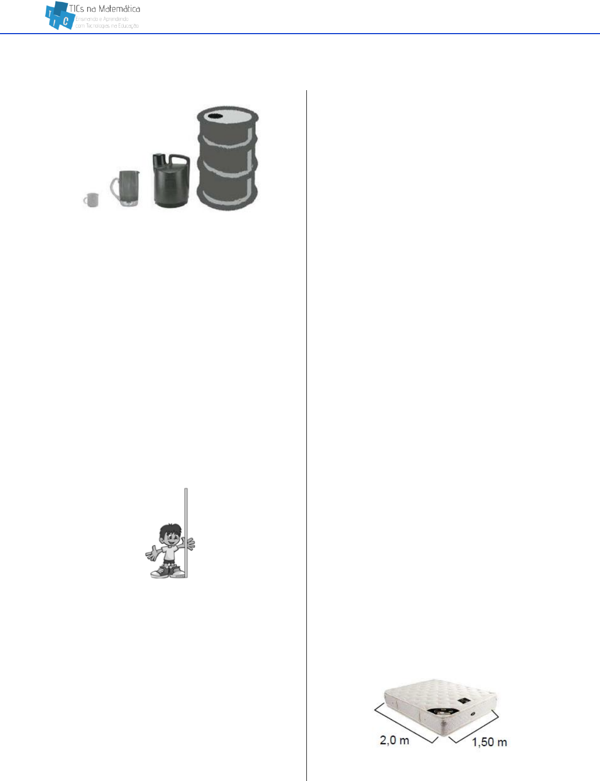 Questões referentes ao descritor 06 de Matemática do 5º ano 1 D6 – Estimar a medida de grandezas utilizando unidades de medida convencionais ou não Todos os objetos estão cheios de água. Qual deles pode conter exatamente 1 litro de água? (A) A caneca (B) A jarra (C) O garrafão (D) O tambor ________________________________________________________ Ao usar uma régua de 20 cm para medir uma mesa, Henrique observou que ela cabia 27 vezes no comprimento da mesa. Ele multiplicou esses valores e encontrou 540 cm. Em metros, o comprimento da mesa é de (A) 0,54. (B) 5,4. (C) 54. (D) 540. ________________________________________________________ Carlos segura um bastão de 2 metros de comprimento, como mostra a figura abaixo. A altura aproximada de Carlos é: (A) menor que 80 centímetros. (B) entre 51 e 130 centímetros. (C) entre 131 e 180 centímetros. (D) maior que 180 centímetros. ________________________________________________________ Pedro e Lauro mediram a largura de uma mesma janela em palmos. Para Pedro, deu 15 palmos, para Lauro de 13 palmos. Podemos concluir, então, que (A) Pedro tem o palmo mais curto. (B) Lauro tem o palmo mais curto. (C) o palmo de Pedro é igual ao palmo de Lauro. (D) o palmo de Pedro é maior que o palmo de Lauro. ________________________________________________________ O peso de Carla é 57,2kg e o de Márcia é 56,25kg. Luís pesa 57 kg e Rui pesa 56,5kg. Se todos têm a mesma altura, a pessoa mais magrinha é (A) Carla. (B) Luís. (C) Márcia. (D) Rui. ________________________________________________________ Lucas quer encher 10 copos de 100ml com refrigerante. Ele vai precisar de (A) 10 litros de refrigerante. (B) 2 litros de refrigerante. (C) 1 litro de refrigerante. (D) 500 ml de refrigerante. ________________________________________________________ O comprimento de uma mesa é de 1m. Quantos palmos aproximadamente mede a mesa se, em média, um palmo tem 22 cm? (A) 4 palmos (B) 4 palmos e meio (C) 5 palmos (D) 5 palmos e meio ________________________________________________________ A altura de uma lousa mede um metro e meio. Qual é a altura da lousa em centímetros? (A) 250 cm (B) 200 cm (C) 190 cm (D) 150 cm ________________________________________________________ Uma mamadeira contém 250 ml de leite. Com 1 litro de leite, quantas mamadeiras podem ser preparadas? (A) 8 (B) 6 (C) 5 (D) 4 ________________________________________________________ Maria quer comprar um lençol para sua cama. Observe a figura: Qual a medida ideal de lençol para o seu colchão? (A) 1,60 m X 2,50 m Questões referentes ao descritor 06 de Matemática do 5º ano 2 (B) 0,88m X 1,88 m (C) 1,40 m X 1,95 m (D) 1,58 m X 1,98 m ________________________________________________________ Vítor tem 10 anos. Qual deve ser o seu peso corporal, levando em consideração a figura abaixo? (A) 100 kg (B) 40 kg (C) 10 kg (D) 5 kg ________________________________________________________ Observe estes alimentos. Qual deles tem aproximadamente 1 quilograma? (A) maçã (B) frango assado (C) ovo frito (D) fatia de pizza ________________________________________________________ Raiane mediu o comprimento de um lápis com uma borracha. Observe: Quantas borrachas, em média, mede o lápis de Raiane? (A) Entre 2 e 3 (B) Entre 4 e 5 (C) Entre 6 e 8 (D) Mais de 8 ________________________________________________________ Leia esta notícia: Quantos metros de extensão tem a montanha russa? (A) 1000 m (B) 100 m (C) 10 m (D) 43 m ________________________________________________________ João Pedro montou uma barraca de sucos na festa da escola, vendeu 50 copos de 200ml. Sabendo-se que ele havia feito 12 litros de suco. Quantos litros sobraram? (A) 1litro (B) 2 litros (C) 5 litros (D) 10 litros ________________________________________________________ Paula foi ao mercado comprar 1 litro de desinfetante. Ela encontrou os dois tipos de embalagem abaixo. Se Paula escolhesse o desinfetante Limpa Tudo ela teria que comprar (A) uma embalagem. (B) duas embalagens. (C) quatro embalagens. (D) cinco embalagens. ________________________________________________________ Observe as figuras Gabriela é mais alta que Júnior. Ela tem 142 centímetros. Quantos centímetros aproximadamente Júnior deve ter? (A) 50 cm (B) 81 cm (C) 136 cm (D) 144 cm ________________________________________________________ João quer medir uma tábua e, para isso, está usando seu palmo, que mede 21 cm. Questões referentes ao descritor 06 de Matemática do 5º ano 3 Assim sendo, essa tábua deve conter (A) mais de 4 palmos e menos de 5 palmos. (B) exatamente 5 palmos. (C) mais de 5 palmos e menos de 6 palmos. (D) exatamente 6 palmos. ________________________________________________________ A diferença entre a altura de Clarice e a altura de Carlos pode ser observada na figura. Simone tem a mesma altura de Carlos e Renata é mais alta que Clarice. Quem é Maior? (A) Carlos (B) Clarice (C) Renata (D) Simone ________________________________________________________ Bruno colocou em um pote 5 pacotes de biscoitos iguais ao representado na figura abaixo. Qual é a quantidade de biscoito que ele colocou nesse pote? (A) Menos de meio quilo. (B) Meio quilo. (C) 1 quilo. (D) Mais de 1 quilo. ________________________________________________________ (SPAECE). Para fazer uma receita, Regina precisa de 1 kg de carne. Ao tirar o pacote de carne da geladeira, vê que ele tem apenas 625 gramas. De quantos gramas de carne ela ainda precisa para fazer a receita? (A) 375 gramas. (B) 325 gramas. (C) 425 gramas. (D) 485 gramas.