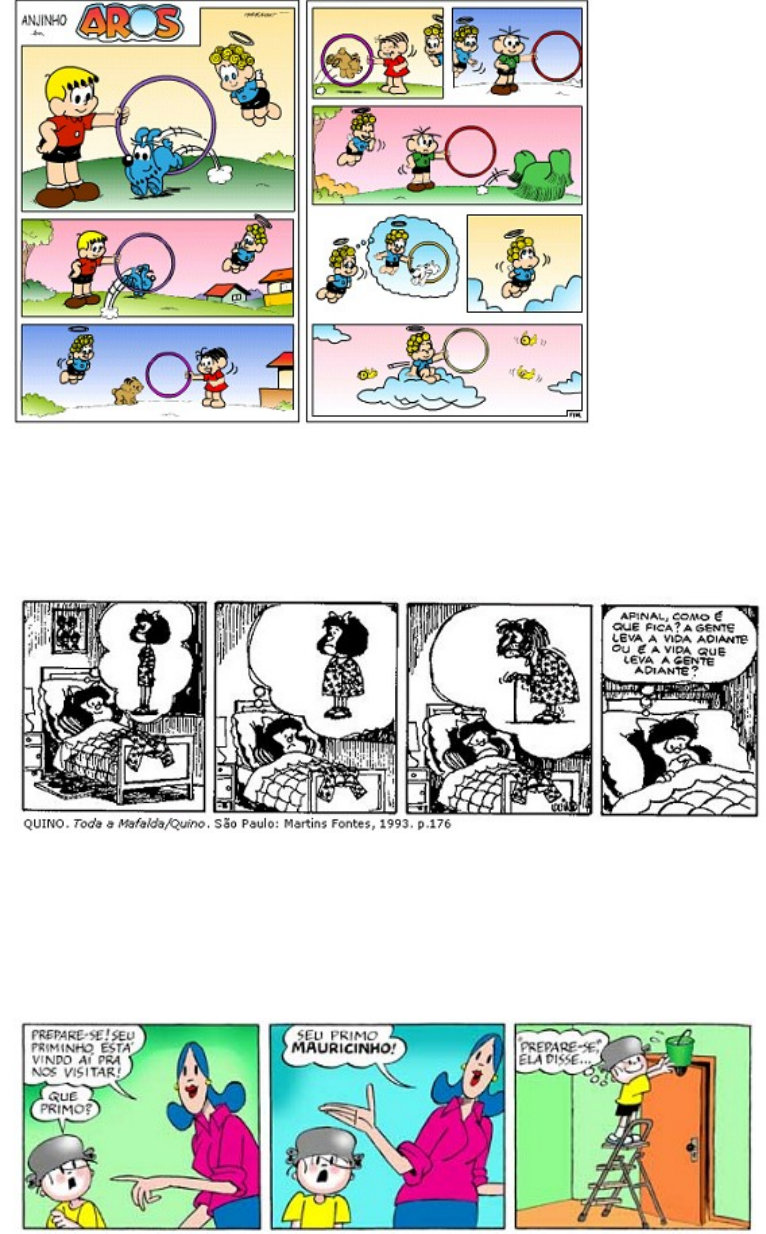 Reforço de português 2ª parte NOME DO ALUNO ____________________________________________________________________________ Leia a história em quadrinhos: No sétimo quadrinho, o personagem Anjinho está: ( ) A -falando; ( ) B -dormindo e sonhando; ( ) C -pensando; ( ) D -lembrando de quando era humano. Questão 2 - Leia a tirinha: A expressão do rosto de Mafalda vai se modificando ao mesmo tempo em que muda o seu pensamento. Analisando essas imagens, podemos afirmar que a menina vai ficando cada vez mais: ( ) A -alegre; ( ) B -triste; ( ) C -sonolenta; ( ) D -brava. Questão 3 - Leia a seguinte tira: De acordo com a historinha, o Maluquinho: ( ) A -não gosta muito do seu primo Mauricinho; ( ) B -está ajudando a sua mãe a arrumar a casa para receber uma visita; ( ) C -adora o seu primo Mauricinho; ( ) D -está lavando a porta de entrada para receber o seu primo. Questão 4 - Leia a tirinha: As palavras destacadas nas falas do Maluquinho: ( ) A -mostram o interesse que ele tem pela culinária; ( ) B -indicam os momentos em que ele está falando mais alto; ( ) C -são usadas pelo personagem para comparar sua cabeça com algum tipo de comida; ( ) D -estão relacionadas à culinária e também descrevem a personalidade do menino. Questão 5 -Leia a tirinha: A expressão "BANG!", que aparece no segundo quadrinho, representa o som: ( ) A -da cabeça do monstro batendo no chão; ( ) B -do grito que Mafalda deu; ( ) C -do disparo da arma do pai da Mafalda; ( ) D -de uma porta batendo no quarto da menina. Questão 6 - Leia a tirinha: No último quadrinho, o Maluquinho está: ( ) A -roendo as unhas; ( ) B -tossindo muito; ( ) C -chorando; ( ) D -dando muitas gargalhadas. Questão 7 - Leia a tirinha: A fala do personagem no terceiro quadrinho está sem pontuação. Que sinal podemos usar para pontuar corretamente a frase? ( ) A -! ( ) B -. ( ) C -? ( ) D -, Questão 8 - Leia a história em quadrinhos: A imagem da lâmpada, que aparece no terceiro quadrinho, indica que a menina: ( ) A -está pensando em acender a luz porque está anoitecendo; ( ) B -lembrou que deveria ter pedido a sua mãe para comprar uma lâmpada no mercado; ( ) C -teve uma idéia; ( ) D -consegue ter muitos pensamentos ao mesmo tempo. Questão 9 - Leia a tirinha: A situação mostrada nessa historinha é engraçada porque: ( ) A -podemos ver que Junim vai ficar feliz e agradecido por ter recebido o recado dado pela mãe; ( ) B -justamente o amigo que traz o recado é que vai fazer o Junim chegar em casa mais uma vez com a roupa suja; ( ) C -com certeza, Bocão vai levar uma bronca da mãe por ter pisado na poça de lama; ( ) D -Junim se assustou com a gritaria de Bocão. Questão 10 - Leia a tirinha: Cada um dos três quadrinhos traz um tipo diferente de balão. Na ordem em que aparecem na história, encontramos: ( ) A -Balão de pensamento, balão de fala e balão que mostra o que está escrito no bilhete. ( ) B -Balão de fala, balão de pensamento e outro balão de pensamento. ( ) C -Balão de pensamento, outro balão de pensamento e balão de fala. ( ) D -Balão de fala, balão de pensamento e balão que mostra o que está escrito no bilhete. Questão 11 - Leia a tirinha: Marque a única alternativa errada: ( ) A -Para o Maluquinho, ser uma pessoa bem comportada é dizer "com licença" e "obrigado". ( ) B -A expressão "ARRÔT!" mostra que o Maluquinho arrotou. ( ) C -Dona Alice achou muita graça na atitude do Menino Maluquinho. ( ) D -O primeiro balão mostra o pensamento do menino. Avaliações - efeito de sentido decorrente do uso da pontuação e de outras notações Questão 12 - Leia a tirinha e responda: As palavras destacadas nas falas do Maluquinho: ( ) A -descrevem o interesse que ele tem pela culinária; ( ) B -indicam o momento em que ele está falando mais alto; ( ) C -comparam a cabeça dele com algum tipo de comida; ( ) D -são relacionadas à culinária e também descrevem a personalidade do menino. Questão 13 - Leia a tirinha e responda: As reticências (...) presentes nos três últimos quadrinhos indicam que: ( ) A -faltam palavras na fala do Menino Maluquinho; ( ) B -o texto que se iniciou em um balão de fala irá continuar no outro; ( ) C -o menino está fazendo muitas perguntas ao leitor; ( ) D -o texto de cada um dos quadrinhos terminou e, no próximo, começará um texto novo. Questão 14 - Leia o poema: Para mostrar a diminuição da luz, o autor do poema: ( ) A -deixou a palavra diminuindo cada vez mais clara, até que ela sumisse por completo; ( ) B -escreveu apenas uma letra da palavra diminuindo e foi acrescentando mais letras, até que a palavra aparecesse por completo; ( ) C -foi reduzindo a palavra diminuindo até que suas letras ficassem todas grudadas; ( ) D -começou escrevendo a palavra diminuindo completa e foi retirando letra por letra, até que restasse apenas a primeira letra da palavra. Questão 15 - Leia a história em quadrinhos: No primeiro quadrinho, se trocássemos o ponto de interrogação pelo de exclamação, o que mudaria no texto? ( ) A -A menina não estaria mais fazendo um pedido à mãe, estaria mandando ela fazer o doce. ( ) B -A menina estaria pedindo à mãe que se fizesse brigadeiro. ( ) C -A filha estaria dizendo para a mãe que ela mesma vai fazer o brigadeiro. ( ) D -Nada mudaria no texto, ele continuaria igual. Questão 16 - Leia o trecho da entrevista com o humorista Diogo Portugal: Você gosta da sua profissão? Você se sente realizado com ela? Sim, sinto-me extremamente realizado por conseguir trabalhar com humor. Como você se sente por fazer as pessoas sorrirem? É a melhor forma de pagamento que existe depois do dinheiro. Ser humorista significa estar sempre feliz? Não é bem isso, mas é um modo de ver as coisas. Ver tudo com humor me traz satisfação, e isso me deixa feliz. Nessa entrevista, se substituíssemos todos os pontos de interrogação por outros sinais de pontuação, estaríamos alterando o sentido das frases? ( ) A -Não. Poderíamos