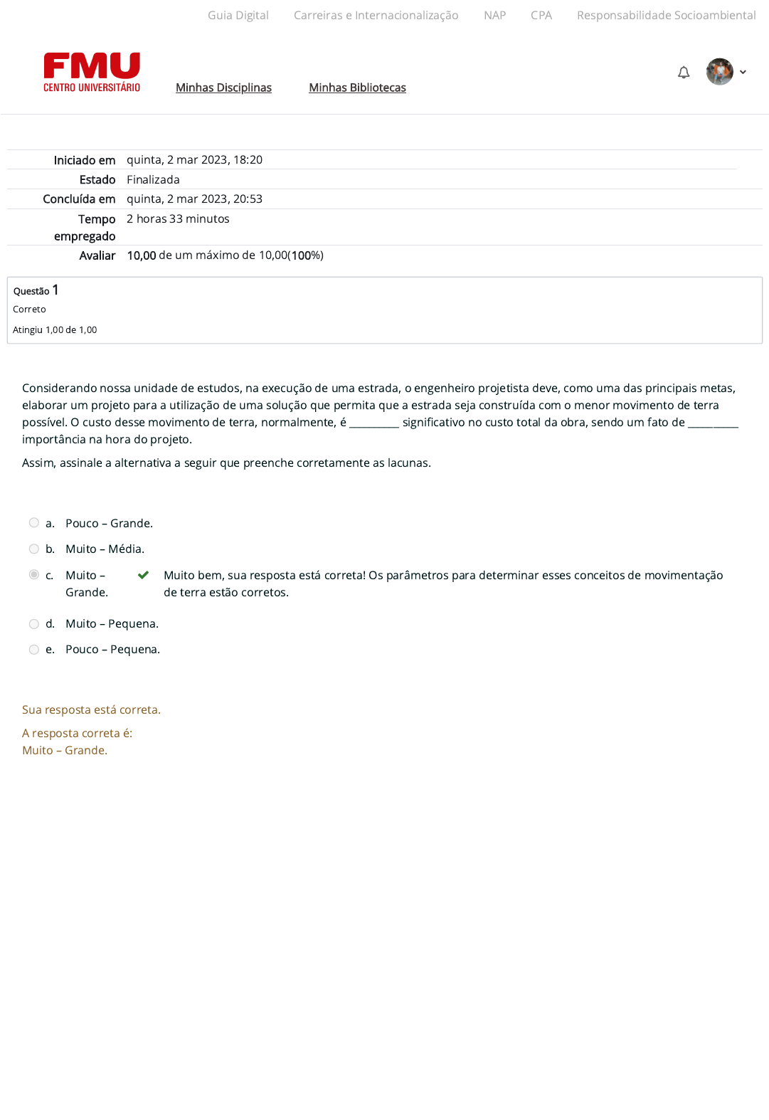 24/07/2023, 17:34 Atividade 3 (A3): Revisão da tentativa https://ambienteacademico.com.br/mod/quiz/review.php?attempt=1792301&cmid=770028 1/8 Iniciado em quinta, 2 mar 2023, 18:20 Estado Finalizada Concluída em quinta, 2 mar 2023, 20:53 Tempo empregado 2 horas 33 minutos Avaliar 10,00 de um máximo de 10,00(100%) Questão 1 Correto Atingiu 1,00 de 1,00 Considerando nossa unidade de estudos, na execução de uma estrada, o engenheiro projetista deve, como uma das principais metas, elaborar um projeto para a utilização de uma solução que permita que a estrada seja construída com o menor movimento de terra possível. O custo desse movimento de terra, normalmente, é __________ signi�cativo no custo total da obra, sendo um fato de __________ importância na hora do projeto. Assim, assinale a alternativa a seguir que preenche corretamente as lacunas. a. Pouco – Grande. b. Muito – Média. c. Muito – Grande. Muito bem, sua resposta está correta! Os parâmetros para determinar esses conceitos de movimentação de terra estão corretos. d. Muito – Pequena. e. Pouco – Pequena. Sua resposta está correta. A resposta correta é: Muito – Grande. Guia Digital Carreiras e Internacionalização NAP CPA Responsabilidade Socioambiental Minhas Disciplinas Minhas Bibliotecas https://codely-fmu-content.s3.amazonaws.com/Moodle/GuiaDigital/Guia+digital/index.html https://carreiras.fmu.br/ https://codely-fmu-content.s3.amazonaws.com/Moodle/NAP/inicial/nap/fmu/index.html https://codely-fmu-content.s3.amazonaws.com/Moodle/CPA/landing_CPA/index.html https://portal.fmu.br/sustentabilidade https://ambienteacademico.com.br/ https://ambienteacademico.com.br/ https://ambienteacademico.com.br/course/view.php?id=236 24/07/2023, 17:34 Atividade 3 (A3): Revisão da tentativa https://ambienteacademico.com.br/mod/quiz/review.php?attempt=1792301&cmid=770028 2/8 Questão 2 Correto Atingiu 1,00 de 1,00 Questão 3 Correto Atingiu 1,00 de 1,00 Para uma correta drenagem de rodovia, são necessários alguns dispositivos implementados na rodovia, a exemplo da sarjeta de banqueta. Esta é tida como uma plataforma em forma de __________, construída __________ nos taludes de grande altura, com a �nalidade de __________ o efeito das águas de precipitação ou deslizamentos de terra. Assim, assinale a alternativa que preenche as lacunas anteriores corretamente. a. Degraus – Longitudinalmente – Maximizar. b. Degraus – Transversal – Minimizar. c. Degraus – Longitudinalmente – Minimizar. Muito bem, sua resposta está correta! Você compreendeu corretamente os conteúdos. Por conceito, sarjeta de banqueta é um dispositivo importantíssimo para a drenagem da rodovia. d. Circular – Longitudinalmente – Minimizar. e. Retangular – Longitudinalmente – Minimizar. Sua resposta está correta. A resposta correta é: Degraus – Longitudinalmente – Minimizar. Para �ns da concepção de um projeto geométrico e de terraplenagem, são executados cálculos das seções transversais das estacas inteiras de pontos fundamentais e de locação das curvas verticais (PCV, PIV e PTV). As seções transversais de uma rodovia são representadas por uma “�gura” geométrica no plano vertical, de elementos dispostos transversalmente ao eixo da estrada, sendo este denominado “plataforma de terraplenagem”. Assim, com base em nossos estudos a respeito da temática, assinale a alternativa na sequência que corresponde corretamente aos três diferentes tipos de seções transversal de uma rodovia. a. De corte, reta e mista. b. Circular, aterro e perpendicular. c. De corte, aterro e mista. Isso mesmo, sua resposta está de acordo com nosso conteúdo! Como sabemos, existem três tipos de seções transversais da rodovia: de corte, aterro e mista. Elas são retratadas, geralmente, por �guras geométricas. d. Ondulada, aterro e mista. e. Ondulada, aterro e perpendicular. Sua resposta está correta. A resposta correta é: De corte, aterro e mista. Guia Digital Carreiras e Internacionalização NAP CPA Responsabilidade Socioambiental Minhas Disciplinas Minhas Bibliotecas https://codely-fmu-content.s3.amazonaws.com/Moodle/GuiaDigital/Guia+digital/index.html https://carreiras.fmu.br/ https://codely-fmu-content.s3.amazonaws.com/Moodle/NAP/inicial/nap/fmu/index.html https://codely-fmu-content.s3.amazonaws.com/Moodle/CPA/landing_CPA/index.html https://portal.fmu.br/sustentabilidade https://ambienteacademico.com.br/ https://ambienteacademico.com.br/ https://ambienteacademico.com.br/course/view.php?id=236 24/07/2023, 17:34 Atividade 3 (A3): Revisão da tentativa https://ambienteacademico.com.br/mod/quiz/review.php?attempt=1792301&cmid=770028 3/8 Questão 4 Correto Atingiu 1,00 de 1,00 Considerando nossos estudos, pudemos entender que o ato de escavar ou encher de terra uma área, deixar o terreno aplainado ou em platôs bem de�nidos, constitui a operação como sendo um conjunto de operações de escavação com transportes, espalhamento e compactação de terras. Sendo assim, com base nas informações destacadas no enunciado, estamos nos referindo a qual conceito? a. Mineração. b. Execução de fundação. c. Terraplenagem. Isso mesmo, sua resposta está correta! Você pensou de forma correta quanto ao conceito de terraplenagem, pois a função desta é fornecer ao terreno parâmetros para a realização do projeto da rodovia. d. Dimensionamento de drenagem. e. Execução de alvenaria. Sua resposta está correta. A resposta correta é: Terraplenagem. Guia Digital Carreiras e Internacionalização NAP CPA Responsabilidade Socioambiental Minhas Disciplinas Minhas Bibliotecas https://codely-fmu-content.s3.amazonaws.com/Moodle/GuiaDigital/Guia+digital/index.html https://carreiras.fmu.br/ https://codely-fmu-content.s3.amazonaws.com/Moodle/NAP/inicial/nap/fmu/index.html https://codely-fmu-content.s3.amazonaws.com/Moodle/CPA/landing_CPA/index.html https://portal.fmu.br/sustentabilidade https://ambienteacademico.com.br/ http