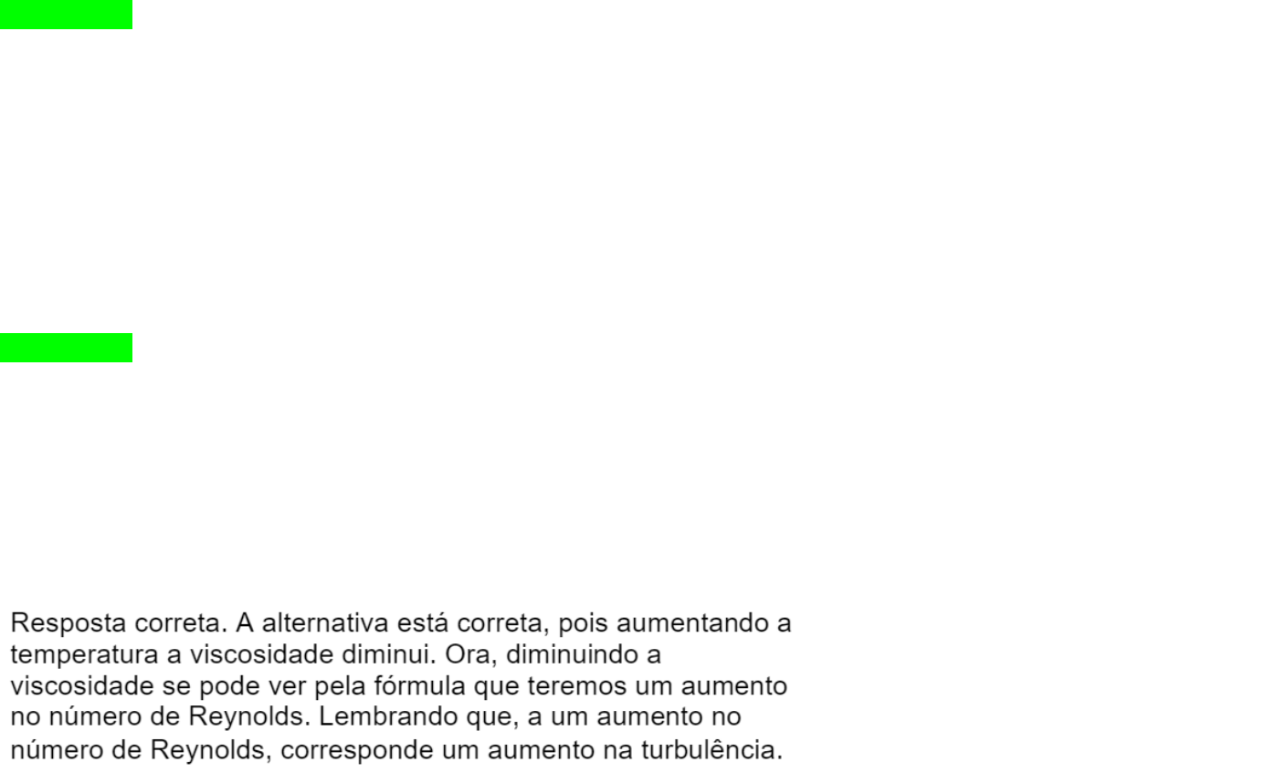PROVA – Hidraulica Aplicada Pergunta 1 As associações de tubulações podem se dar de forma em que os encanamentos se encontrem em sequência, de maneira que o fim de um tubo é o início de outro, o que se chama de associação em série. Também podemos ter combinações de tubos ligados em paralelo, que significa que temos uma divisão de determinado encanamento em dois ou mais ramos, os quais, logo adiante, irão voltar a ter um encaminhamento único. Sobre esses tipos de associação, assinale a alternativa correta, sobre a vazão equivalente. Resposta: Em série é igual em cada trecho, em paralelo é a soma de cada trecho Pergunta 2 Com sua experiência, Reynolds propôs a equação que leva seu nome, Re = V . D / ᶹ, onde V é a velocidade, em m/s, D é o diâmetro, em metros e ᶹ; é a viscosidade cinemática, em m2/s. Mantidas as demais variáveis, o que se pode afirmar sobre a temperatura e sua influência (ou não) no número de Reynolds? Assinale a alternativa que apresenta a resposta correta. Resposta: Aumentando a temperatura, diminui o número de Reynolds Pergunta 3 No projeto de determinado reservatório, de formato cilíndrico, deseja-se saber seu tempo de esvaziamento. Para tanto são conhecidas a altura do reservatório e o diâmetro do orifício, de 0,15 m. Considere um coeficiente de descarga corrigido de 0,62. O reservatório possui altura 5 m e área da base de 7,065 m2. Neste sentido, assinale a alternativa que calcule o tempo para esvaziar: Resposta: 640 s Pergunta 4 Dentro das atribuições dos engenheiros que executam tarefas na área de engenharia hidráulica, uma das requisições que lhes surge, frequentemente, está em dimensionar tubulações em função de determinados parâmetros. Dentro desse contexto, experimente resolver a seguinte situação. Numa tubulação de 1300 m de comprimento, com fator de atrito 0,01342, qual o diâmetro, em mm, a ser adotado, de modo a admitir uma velocidade de 1,5 m/s, com uma perda de carga de no máximo 4 m? Assinale a alternativa que apresente a resposta correta. Resposta: 500 mm Pergunta 5 Para medir-se a vazão de determinado curso d'água foi instalado no mesmo um vertedor retangular, de 3 m de largura e 1,5 m de altura, sem contrações laterais. Notou-se que, após a instalação do mesmo, a água elevou-se 1,75 m em relação ao leito, ficando uma altura de 0,25 m acima da soleira do vertedor (medida à 3 m à montante do vertedor). Neste sentido, assinale a alternativa que indique a vazão: Resposta: 0,69 m3/s Pergunta 6 Para determinar o ponto ótimo de instalação de um sistema de bombeamento é necessário obter o ponto de cruzamento entre a curva característica da bomba e a curva característica do sistema. Através da tabela que relaciona a altura manométrica da bomba e do sistema, especifique o ponto de funcionamento do sistema e, em seguida, assinale a alternativa correta. Q (m3/s) 0 1 2 3 4 5 6 7 8 9 10 11 Hm(m)B 105 104 102 99 94 89 82 75 66 56 45 33 Hm(m)S 26 22 21 21 23 26 31 38 46 56 68 82 Resposta: 9 L/s Pergunta 7 Um canal retangular irá ser construído utilizando tijolos de barro para conduzir água desde uma nascente até próximo de uma fazenda. A vazão esperada neste empreendimento é de 6 m3/s, pois já foram realizadas algumas medidas expeditas junto à nascente. A declividade desde o ponto de tomada até o final do canal é de 0,0003 m/m. Neste sentido, assinale a alternativa que indique a medida da largura do fundo deste canal, de modo a que tenha máximo rendimento: Resposta: 3,3 m Pergunta 8 Em certas ocasiões, necessitamos partir de um valor inicial para o diâmetro da tubulação, para então realizarmos os demais cálculos. Nesses casos se utiliza a fórmula de Bresse. Considerando o dimensionamento econômico pela fórmula de Bresse, calcule o diâmetro para uma tubulação que irá receber água com velocidade de 1,60 m/s, com uma vazão de 28 L/s. Resposta: 150mm Pergunta 9 Na prática da Hidráulica, o profissional é levado à necessidade de substituir tubulações, por idade ou problemas nas mesmas. Considere que em uma associação de duas tubulações em paralelo, a perda de carga em cada ramo é 12 m. Essas duas tubulações necessitam ser substituídas devido a problemas de vazamento. Com base nas informações apresentadas, assinale a alternativa que representa a perda de carga, em metros, prevista para a tubulação equivalente que substituirá estas duas: Resposta: 12 m Pergunta 10 A fórmula mais utilizada para dimensionamento hidráulico, na atualidade, é a equação de Hazen-Williams. Isto se justifica em função da utilização das calculadoras atuais e mesmo de programas de computador que facilitam bastante o cálculo. Nesse sentido, utilizando a equação de Hazen-Williams calcule a vazão de tráfego, em m3/s, em uma tubulação de PVC, nova, de 980 m de comprimento, de 300 mm de diâmetro, para uma perda de carga total de 105 m. Em seguida, assinale a alternativa que apresenta a resposta correta. Resposta: 1,88 m3/s