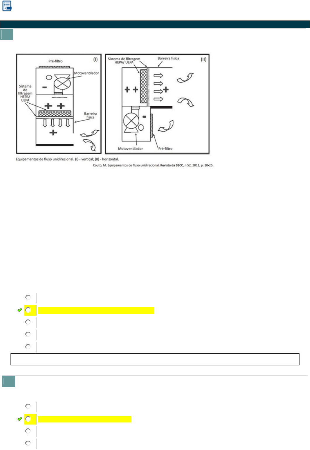 LABORATÓRIO CLÍNICO E CONTROLE DE QUALIDADE INTRODUÇÃO ÀS BOAS PRÁTICAS LABORATORIAIS 1. Os equipamentos de fluxo unidirecional são desenvolvidos com o propósito de propiciar a manipulação segura de materiais biológicos, conforme se observa nas figuras a seguir. Com relação à utilização correta desse tipo de equipamento e levando em consideração as figuras acima, avalie as asserções que se seguem e a relação proposta entre elas. I. Os equipamentos de fluxo unidirecional horizontal são câmaras que apresentam um fluxo de ar filtrado e laminar no sentido horizontal, oferecendo proteção ao material manipulado, ao operador e ao meio ambiente. PORQUE II. A direção do fluxo de ar que circula no interior das câmaras de fluxo unidirecional horizontal não permite que o ar do meio ambiente contamine o material e, também, que possíveis aerossóis formados a partir da manipulação entrem em contato com o operador. Acerca dessas asserções, assinale a opção correta: A asserção I é uma proposição verdadeira, e a II é uma proposição falsa. As asserções I e II são proposições falsas. A asserção I é uma proposição falsa, e a II é uma proposição verdadeira. As asserções I e II são proposições verdadeiras, e a II é uma justificativa correta da I. As asserções I e II são proposições verdadeiras, mas a II não é uma justificativa correta da I. Explicação: A resposta correta é: As asserções I e II são proposições falsas. 2. Dentro das boas práticas laboratoriais se encontra todo conhecimento sobre a estrutura ideal para laboratório, de acordo com a rotina especializada, assim como a forma de descontaminação e principalmente como se vestir e usar os equipamentos de proteção. Excluindo-se os equipamentos de proteção coletiva, são classificados como EPIs: câmara de exaustão; luvas; máscara; óculos. avental (jaleco); luvas; óculos; máscara. chuveiro; luvas; câmara de exaustão; máscara. avental (jaleco); sinalizações; luvas; chuveiro. https://simulado.estacio.br/bdq_simulados_exercicio_temas.asp https://simulado.estacio.br/bdq_simulados_exercicio_temas.asp avental (jaleco); óculos; chuveiro; máscara. Explicação: Equipamento de proteção individual é qualquer meio ou dispositivo destinado a ser utilizados por uma pessoa contra possíveis riscos ameaçadores da sua saúde ou segurança durante o exercício de uma determinada atividade. Chuveiro, Câmara de exaustão e sinalizações são EPC. 3. Dentro de um laboratório clínico é importante ter o conhecimento de métodos para promover a descontaminação microbiana, desinfecção e esterilização. Entre os métodos utilizados, pode-se citar o calor, pois é um dos mais utilizados no processo de esterilização. Alguns fatores devem ser levados em consideração para a sua utilização. Assinale a alternativa CORRETA a respeito do uso do calor no processo de esterilização: No processo de fervura é possível eliminar todos os tipos de bactérias. Pode-se utilizar o processo de incineração como método de esterilização de curativos contaminados, carcaça de animais, copos de papel etc. A tindalização é o único método que substitui a autoclavação sem perda de eficácia no processo de esterilização. A pasteurização consiste no processo de esterilização em que há um aquecimento controlado de forma precisa, juntamente com o aumento da pressão. A autoclave é o principal método utilizado na esterilização por meio de calor úmido. Nas condições de pressão e temperatura utilizados na autoclave, é possível matar esporos altamente resistentes de Cloristridium botulinum. Explicação: A resposta correta é: A autoclave é o principal método utilizado na esterilização por meio de calor úmido. Nas condições de pressão e temperatura utilizados na autoclave, é possível matar esporos altamente resistentes de Cloristridium botulinum. 4. A infraestrutura de um laboratório é planejada de acordo com as regulamentações e com nível de biossegurança. De acordo com o contexto analise as assertivas abaixo: Os níveis de Biossegurança são avaliados e regulamentados de acordo com o setor do laboratório e possui uma normativa diferentes das fiscalização de infraestrutura. PORQUE A legislação no Brasil é regulamenta pela RDC nº 50 de 21 de fevereiro de 2002, que dispõe somente dos projetos físicos de estabelecimentos assistenciais de saúde. A primeira assertiva está errada, mas a segunda está correta. As duas assertivas estão corretas, mas a segunda não é uma justificativa correta da primeira. As duas assertivas estão corretas, e a segunda é uma justificativa correta da primeira. Nenhuma das assertivas estão corretas. A primeira assertiva está correta, mas a segunda está errada. Explicação: Atualmente, no Brasil, a legislação que regulamenta esse setor é a RDC nº 50 de 21 de fevereiro de 2002, que dispõe sobre o regulamento técnico para planejamento, programação, elaboração e avaliação de projetos físicos de estabelecimentos assistenciais de saúde. O layout de um laboratório pode também ser considerado um tipo de contenção laboratorial conhecida como barreira secundária. 5. (VUNESP/2020- Adaptada) Uma das técnicas comumente utilizadas nas rotinas laboratoriais para produzir água purificada de consumo; funciona através da adsorção das impurezas pelas resinas de troca iônica. Essa técnica de purificação de água é chamada de: Adsorção orgânica. Foto oxidação. https://simulado.estacio.br/bdq_simulados_exercicio_temas.asp https://simulado.estacio.br/bdq_simulados_exercicio_temas.asp https://simulado.estacio.br/bdq_simulados_exercicio_temas.asp Deionização. Filtração através de carvão ativado Osmose reversa. Explicação: A técnica de deionização ou desmineralização é muito utilizada para a obtenção de água purificada para uso rotineiro no laboratório. Ela remove apenas sais inorg