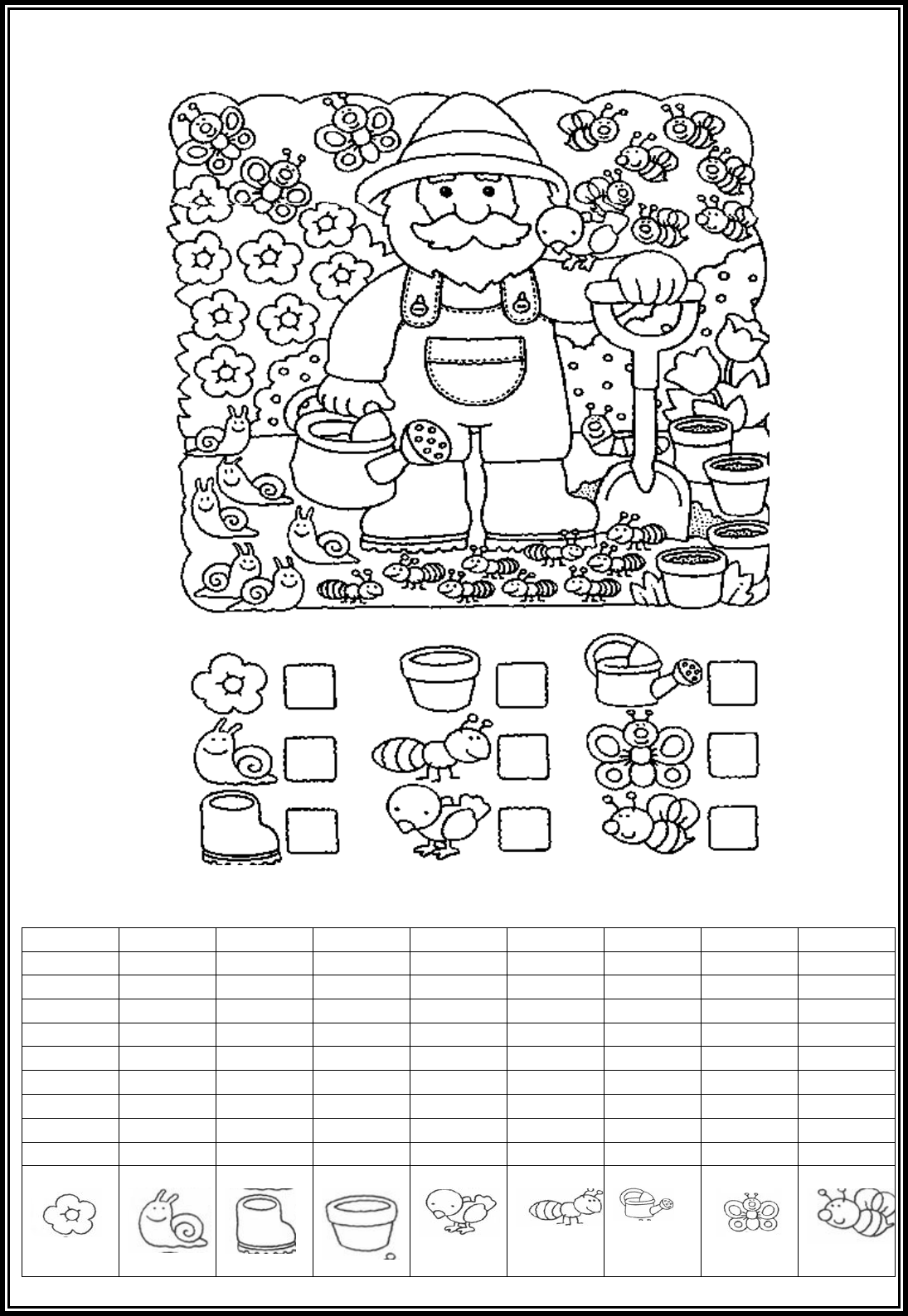 VAMOS AJUDAR O JARDINEIRO A CONTAR? E MONTAR UM GRÁFICO? PINTE NO GRÁFICO A QUANTIDADE DE CADA UMDOS DESENHOS