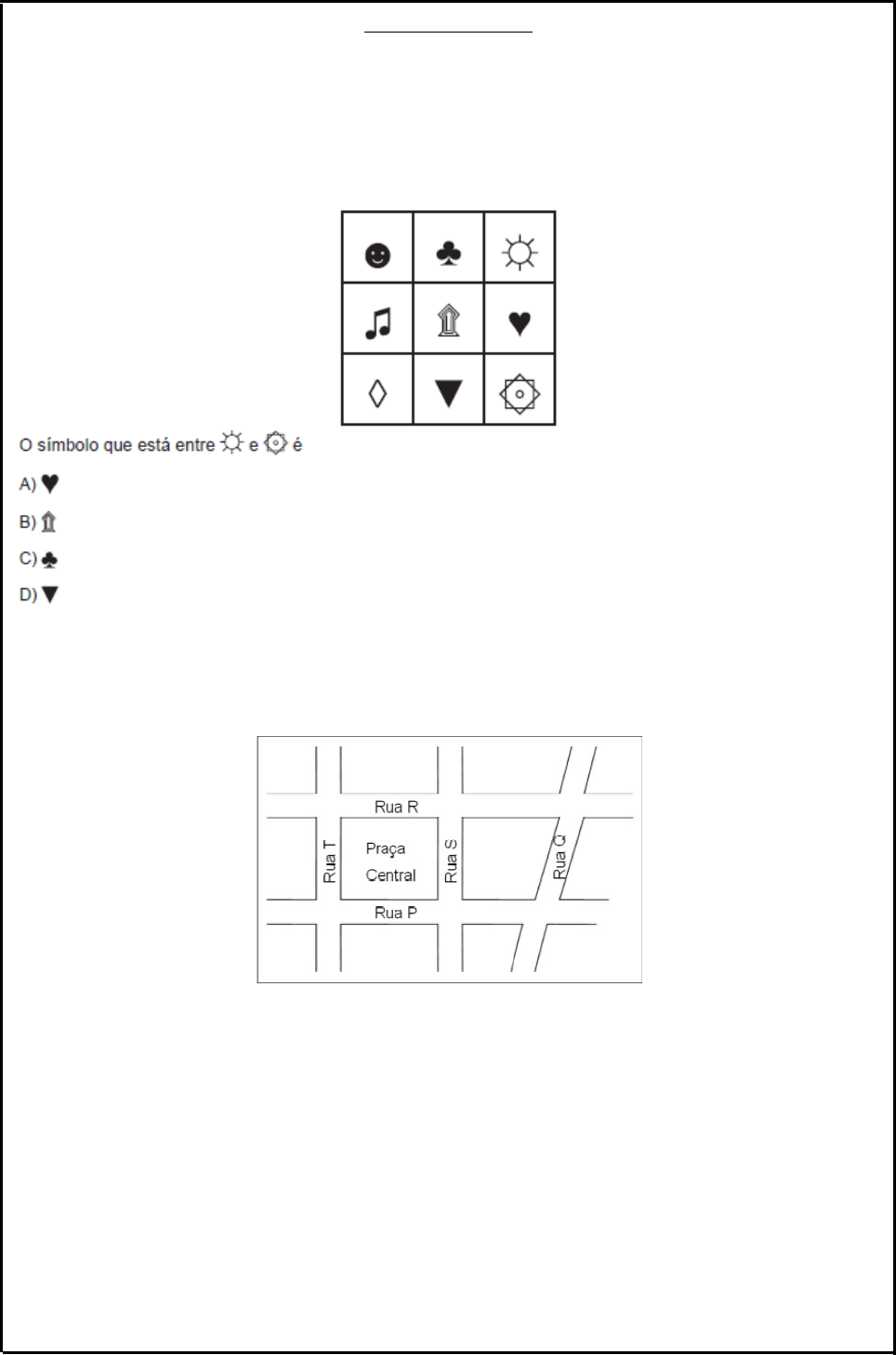 SIMULADO 7 Nome:________________________________________________________________________ QUESTÃO 1 D1 Veja abaixo o tabuleiro de um jogo. QUESTÃO 2 D2 A figura a seguir representa um trecho do mapa de um bairro. Se a praça central tem a forma de um retângulo, então a rua T é paralela à rua (A) P (B) Q (C) R (D) S QUESTÃO 3 D3 Juliana fez algumas figuras planas em papel cartão, como mostra abaixo. Ao juntar todas essas partes formam o sólido chamado (A) cone (B) prisma (C) pirâmide (D) cilindro QUESTÃO 4 D4 Clara colou em seu caderno diferentes figuras geométricas. Veja abaixo o que ela colou. Qual dessas figuras é um quadrilátero? A) I B) II C) III D) IV QUESTÃO 5 D5 A face superior das peças de um jogo de dominó tem formato de um quadrilátero. Observe um exemplo: Qual o quadrilátero que melhor caracteriza a face superior da peça de um jogo de dominó? (A) Trapézio. (B) Quadrado. (C) Retângulo. (D) Losango. QUESTÃO 6 D6 Raiane mediu o comprimento de um lápis com uma borracha. Observe: Quantas borrachas, em média, mede o lápis de Raiane? (A) Entre 2 e 3 (B) Entre 4 e 5 (C) Entre 6 e 8 (D) Mais de 8 QUESTÃO 7 D7 Claudia comprou 2 metros de tecido para fazer um vestido. Podemos afirmar que em 2 m há: (A) 2000 cm (B) 20 cm (C) 2 cm (D) 200 cm QUESTÃO 8 D8 Mariana ficou 72 horas com um livro da biblioteca. Quantos dias ela ficou com esse livro? A) 3 dias B) 5 dias C) 6 dias D) 9 dias QUESTÃO 9 D9 Observe o relógio da figura seguinte. Que horas marca o relógio? (A) 10:30 h (B) 11:30 h (C) 11:35 h (D) 12:35 h QUESTÃO 10 D10 A Escola Municipal Darcy Ribeiro começa suas aulas do 2º turno todos os dias às 13h e termina às 17h. Quantos minutos os alunos ficam na escola? (A) 240 (B) 30 (C) 400 (D) 40 SIMULADO 8 Nome:__________________________________________________________________ QUESTÃO 1 D11 Helena com algumas amigas vão colocar mudinhas de flores bem coloridas em volta dos dois canteiros que têm forma de triângulos equiláteros. O lado de cada canteiro mede 3m. A soma dos perímetros desses dois canteiros tem como medida (A) 18 m. (B) 16 m. (C) 12 m. (D) 9 m. QUESTÃO 2 D12 Observe estas figuras: Dessas figuras, a que tem MENOR área é a: (A) 1 (B) 2 (C) 3 (D) 4 QUESTÃO 3 D13 A professora pediu a três alunos que interpretassem o número abaixo. Veja o que eles fizeram. Quem acertou? A) Jane e Afonso. B) Jane e Mateus. C) Mateus e Afonso. D) Somente Jane. QUESTÃO 4 D14 A população de Corumbá, no Mato Grosso do Sul, é de 95.704 habitantes. O número de pessoas que moram em Corumbá escrito por extenso é: (A) Noventa e cinco mil setecentos e quatro habitantes. (B) Noventa e cinco mil e setenta e quatro habitantes. (C) Noventa e cinco mil, setecentos e quarenta habitantes. (D) Noventa e cinco mil e setenta e quarenta habitante. QUESTÃO 5 D15 Na reta numérica, abaixo, a distância entre os pontos E, F, G, H, I e J são as mesmas. Que ponto está representando o número 1990? A) F. B) G. C) H. D) I. QUESTÃO 6 D16 Flávia estava jogando baralho. Na primeira partida, Flávia fez 325 pontos. Na segunda, fez 785 pontos. Na terceira partida, perdeu 465 pontos. Quantos pontos Flávia fez ao final dessas três partidas? (A) 535 (B) 545 (C) 645 (D) 655 QUESTÃO 7 D17 Na escola de Gabriela, foi realizado um baile de Carnaval. Dos 754 alunos, faltaram 348. Foram ao baile (A) 404 alunos (B) 406 alunos (C) 414 alunos (D) 416 alunos QUESTÃO 8 D18 Em uma viagem, um caminhão transporta 2.250 tijolos. Quantos tijolos transportará em 35 viagens, levando sempre essa quantidade? (A) 76.550 (B) 77.750 (C) 78.750 (D) 78.785 QUESTÃO 9 D19 Uma merendeira preparou 558 pães que foram distribuídos igualmente em 18 cestas. Quantos pães foram colocados em cada cesta? (A) 31 (B) 310 (C) 554 (D) 783 QUESTÃO 10 D20 A professora do 5º Ano, corrigindo as avaliações da classe, viu que Pedro acertou das questões. De que outra forma a professora poderia representar essa fração? (A) 0,02 (B) 0,10 (C) 2,10 (D) 0,20 SIMULADO 9 Nome:__________________________________________________________________ QUESTÃO 1 D21 Os números decimais podem ser representados na reta numérica. Observe a reta abaixo. Qual é o símbolo que representa o valor 36,7? QUESTÃO 2 D 22 O dono da padaria trocou R$ 7,00 por moedas de R$ 0,25. Quantas moedas ele recebeu? (A) 14 (B) 21 (C) 35 (D) 28 QUESTÃO 3 D23 Mamãe foi à feira. Veja na tabela o dinheiro que ela tem. Quantidade de Notas Valor (R$) 4 10,00 5 5,00 6 1,00 Quais as notas que ela poderá usar para pagar uma compra de R$ 7,00, sem receber troco? (A) 1 nota de R$ 5,00 e 2 notas de R$ 1,00. (B) 2 notas de R$ 5,00. (C) 1 nota de R$ 10,00. (D) 1 nota de R$ 5,00 e 3 notas de R$ 1,00. QUESTÃO 4 D24 Em Belo Horizonte, a temperatura máxima de sábado foi de 28,3 graus e a de domingo foi de 26,7 graus. De quantos graus é a diferença entre as duas temperaturas? (A) 1,4 (B) 1,6 (C) 2,4 (D) 2,6 QUESTÃO 5 D25 Durante uma viagem para São Paulo Simone percorreu 256,7Km e parou num posto de gasolina. Soube então que ainda faltavam 136,8Km para chegar ao seu destino. Qual é a distância total que Simone terá percorrido ao final da viagem? (A) 393,5km (B) 119,9km (C) 392 km (D) 382,5km QUESTÃO 6 D26 Fabiana está com dengue, sua mãe mediu sua temperatura que está em 39,2ºC. Sabendo que a temperatura normal de um corpo é aproximadamente 36,5ºC. Quantos graus de temperatura Fabiana está acima do normal? (A) 3,3ºC (B) 3,0ºC (C) 1,8ºC (D) 2,7ºC QUESTÃO 7 D27 Pedro quer comprar um jogo de mini-game que custa R$ 18,99 e um jogo de xadrez que custa R$ 23,49. Ele já conseguiu juntar R$ 30,00. Quanto falta? (A) R$14,50 (B) R$41,00 (C) R$42,48 (D) R$12,48 QUESTÃO 8 D28 A turma do 5º ano que tem 22 alunos resolveram presentear a professora no final do ano. Compraram um presente no valor de R$ 246,84 e dividiram entre eles. Quanto cada um pagou? (A) 12,20 (B) 11,22 (C) 12,22 (D) 11,20 QUESTÃO 9 D29 Renata tinha R$ 300,00 para fazer uma fes