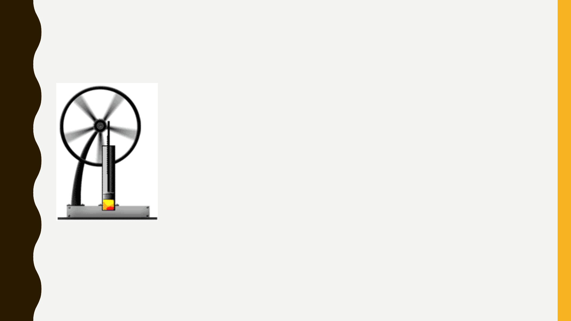 Termodinâmica é a ciência que trata ... • do calor e do trabalho; • das características dos sistemas; • das propriedades dos fluidos termodinâmicos Contexto histórico ... Historicamente, a Termodinâmica se desenvolveu pela necessidade de aumentar a eficiência das primeiras máquinas a vapor. A termodinâmica começa com Otto von Guericke (1650) ao projetar e construiu a primeira bomba de vácuo do mundo (o primeiro vácuo artificial do mundo). Tentou provar a invalidade da antiga percepção de que "a natureza tem horror ao vácuo" O físico e químico Irlandês Robert Boyle (1656) construiu uma bomba de ar. E percebeu a correlação entre pressão, temperatura e volume. Em tempo, a Lei de Boyle foi formulada, que estabelece que a pressão e o volume são inversamente proporcionais. Sadi Carnot é considerado o "pai da termodinâmica", em 1824 publicou "Reflexões sobre a Potência Motriz do Fogo", um discurso sobre o calor, potência e eficiência de máquina. O texto trouxe as relações energéticas básicas entre a Máquina de Carnot, o Ciclo de Carnot e a Potência Motriz. Isto marcou o início da Termodinâmica como ciência moderna.[ No final do século XVIII a Grã-Bretanha passa a utilizar as máquinas térmicas no desenvolvimento das indústrias de mineração. Sadi Carnot 1796 - 1832 James Joule 1818 - 1889 Rudolf Clausius 1822 - 1888 Wiliam Thomson Lord Kelvin 1824 - 1907 Emile Claupeyron 1799 - 1864 Alguns ilustres pesquisadores que construiram a termodinâmica Nasceu em Salford - Inglaterra James P. Joule (1818-1889) Contribuição de James Joule. 1839 Experimentos: trabalho mecânico, eletricidade e calor. 1840 Efeito Joule : Pot = RI2 1843 Equivalente mecânico do calor ( 1 cal = 4,18 J) 1852 Efeito Joule-Thomson : decrescimo da temperatura de um gás em função da expansão sem realização de trabalho externo. As contribuições de Joule e outros levaram ao surgimento de uma nova disciplina: a Termodinâmica Lei da Conservação de Energia 1a Lei da Termodinâmica Para entender melhor a 1a Lei de Termodinâmica é preciso compreender as características dos sistemas termodinâmicos e os caminhos “percorridos” pelo calor... Certa massa delimitada por uma fronteira. Vizinhança do sistema. O que fica fora da fronteira Sistema isolado Sistema que não troca energia nem massa com a sua vizinhança. Sistema fechado Sistema que não troca massa com a vizinhança, mas permite passagem de calor e trabalho por sua fronteira. Sistema Termodinâmico Transformações gasosas P1 V1 T1 U1 P2 V2 T2 U2 Estado 1 Estado 2Transformação Variáveis de estado Variáveis de estado τ “Caminho” descrito pelo sistema na transformação . Processos P1 V1 T1 U1 P2 V2 T2 U2 Processos Durante a transformação Isotérmico temperatura invariável Isobárico Pressão invariável Isovolumétrico volume constante Adiabático É nula a troca de calor com a vizinhança. Transformações 1a Lei da Termodinâmica ΔU = U2 – U1 Variação Energia Interna τ > 0 → energia que sai do sistema τ < 0 → energia que entra no sistema Q > 0 → calor que entra no sistema Q < 0 → calor que sai do sistema 1a Lei Q = τ + ΔU Sistema Fechado τ ∆U = Q - τ Gás Expansão nula τ = 0 Δ U = Q = (mc)gás ΔT Como (mc)gás = ctc ΔU depende apenas de ΔT. ΔT = 0 → ΔU = 0 ΔT > 0 → ΔU > 0 ΔT < 0 → ΔU < 0 Como U é uma variável de estado, ΔU não depende do processo. Variação da Energia Interna A energia interna de um gás é função apenas da temperatura absoluta T. O calor Q que passa pelas fronteiras do sistema depende do processo. ∆V = V2 -V1 ∆U = Q - τ τ depende de como a pressão e volume mudam no processo. τ = F.d F = P.A τ = P.A.d τ = P.ΔV O trabalho que atravessa a fronteira depende do processo? P1V1 = nRT1 Estado 1 no de moles Constante dos gases R = 8,31 J/mol.K = 2 cal/mol.K Diagramas P x V Gases ideais 1P1 V1 T1Como as variáveis de estado se relacionam? Equação de estado τ = Po [VB-VA] Transformação a pressão constante Transformação isobárica τ = P.ΔV = P (VA-VB) Numa expansão isobárica, o volume a temperatura aumentam, ocorrendo também aumento da energia interna do gás. U >0 U = Q - τ Q > τ Numa expansão isobárica, a quantidade de calor recebida é maior que o trabalho realizado. 1ª Lei da Termodinâmica τ = 0 Numa transformação isocórica, a variação da energia interna do gás é igual à quantidade de calor trocada com o meio exterior. ∆V = 0 Transformação de 1 → 2 Volume invariável Isovolumétrica Processo isovolumétrico Transformação a volume constante U = Q - τ O trabalho realizado é nulo, pois não há variação de volume (ΔV =0). Então: U = Q Êmbolo movimentado lentamente ∆U = 0 → ∆T=0 Transformação à temperatura constanteProcesso Isotérmico 0 = Q – τ Q = τ Numa transformação isotérmica, o calor trocado pelo gás com o exterior é igual ao trabalho realizado no mesmo processo. Movimento rápido do êmbolo. Q = 0 Primeira Lei da Termodinâmica ∆U = Q - τ Q = 0 → ∆U= - τ Compressão adiabática Trabalho transforma-se em calor Q = 0 O processo ocorre tão rapidamente que o sistema não troca calor com o exterior. τ Área sob o grafico Processo adiabático Transformação sem troca de calor 3.- Wciclo = W = área 12341 Wciclo > 0 → Qciclo 0 O sentido do ciclo no diagrama PV : horário. O sistema recebe Q e entrega W 1a Lei da Termodinâmica ∆Uciclo = Qciclo - Wciclo Qciclo = Wciclo 1.- ∆Uciclo = ∆U = 0 pois Tfinal = Tinicial 2.- Qciclo = Q Processos cíclicos “Trabalham” em ciclos. Máquinas Térmicas Fonte quente Fonte fria Trabalho Ciclo De onde a máquina retira calor QHot. Para onde a máquina rejeita calor QCold A máquina de Denis Papin 1647 - 1712 Transformações máquinas térmicas - Diagrama PV Ciclo de Otto Ciclo Diesel Em cada ciclo W = Q1-Q2 Eficiência = W/Q1= (Q1-Q2)/Q1 ε = [1 – Q2/Q1] ∆U = 0 Eficiência térmica: 1ªLei Refrigerador Bomba de calor