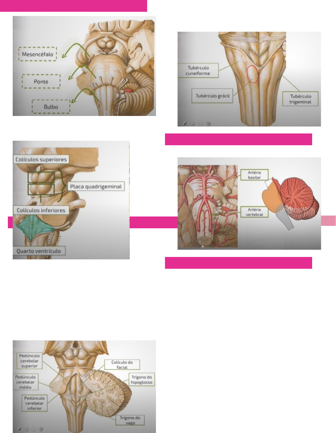 Neuroanatomia – Amanda Longo LouzadaAnatomia do tronco encefálico 2 anatomia externa: · Colículos superiores e inferiores compõem a placa quadrigeminal · Abaixo da placa tem o quarto ventrículo · Os pedúnculos cerebelares ligam o cerebelo com o tronco, sendo que o superior liga o cerebelo ao mesencéfalo, o médio a ponte e o inferior ao bulbo · Colículo do facial: é a projeção dos núcleos do nervo facial, · Trígono do Hipoglosso: projeção dos núcleos do nervo hipoglosso · Trígono do Vago: projeção dos núcleos do nervo vago · Tubérculo Grácil: projeção dos núcleos grácils · Tubérculo Cuneiforme: projeção dos núcleos cuneriformes · Tubérculo Trigeminal: é uma parte dos núcleos do nervo trigêmeo irrigação: · Artéria vertebrais e artéria basilar nervos cranianos: · Pirâmides Bulbares e Olivas: são marcos que ajudam a saber aonde emergem os nervos cranianos · Os nervos olfatórios e ópticos não emergem do tronco encefálico · Nervos Oculomotores: emergem entre a ponte e o mesencéfalo · Nervos Trocleares: único nervo que emerge na porção posterior do tronco · Nervos Trigêmios: emergem do meio da ponte · Nervos Abduscentes: · Nervos Faciais: Nervos Vestibulococleares · Nervos Glossofaríngeos · Nervos vagos · Nervos acessórios · Nervos hipoglossos