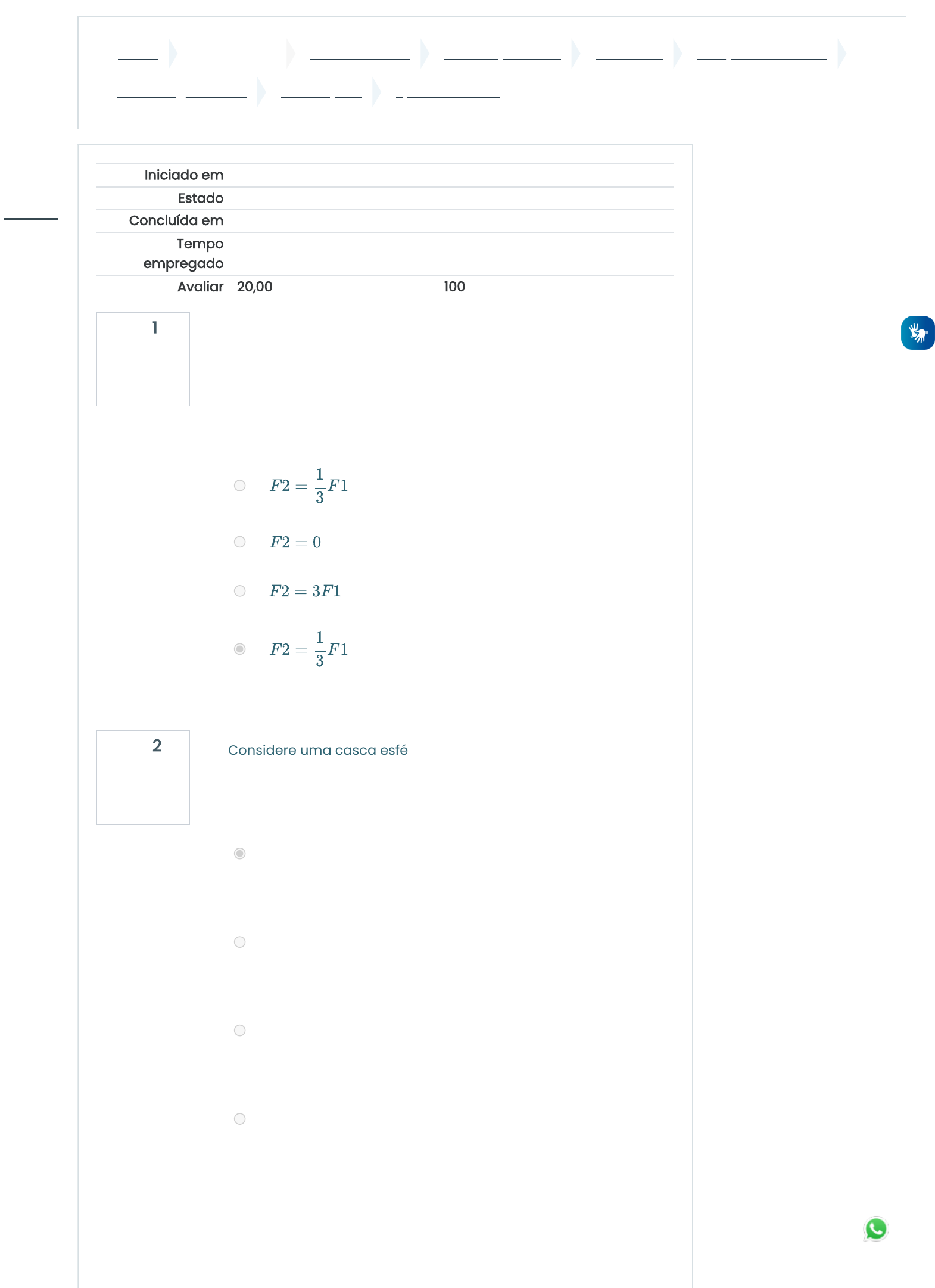 Painel Meus cursos CURSOS FUNEC Graduação - EAD Aluno EAD JUNÇÕES DE TURMA Eletromagnetismo I AVALIAÇÕES QUESTIONÁRIO 1 Questão 1 Completo Atingiu 2,00 de 2,00 Questão 2 Completo Atingiu 2,00 de 2,00 Iniciado em Wednesday, 7 Dec 2022, 18:55 Estado Finalizada Concluída em Wednesday, 7 Dec 2022, 21:03 Tempo empregado 2 horas 7 minutos Avaliar 20,00 de um máximo de 20,00(100%) Duas cargas puntiformes 6q e - 2q fixas em suas posições, quando separadas por uma distância d se atraem com uma força F1. Se por meio de um fio condutor houver o contato entre as duas esferas e depois removermos o fio. A nova força de interação entre as cargas em função de F1 será: Escolha uma opção: a. e será de atração b. , pois as duas esferas estarão neutras c. e será de atração d. e será de repulsão F2 = F1 1 3 F2 = 0 F2 = 3F1 F2 = F1 1 3 Considere uma casca esférica de raio R, onde foi depositada uma quantidade de carga Q. Sobre essa afirmação podemos dizer que: Escolha uma opção: a. A carga se distribui uniformemente sobre a superfície, criando um campo elétrico que cai com o quadrado da distância em r > R e um campo elétrico nulo para r < R, pois é um caso eletrostático. b. A carga se distribui uniformemente sobre a superfície, criando um campo elétrico que cai com o quadrado da distância em r < R e um campo elétrico nulo para r > R, pois é um caso eletrostático. c. A carga se distribui uniformemente sobre a superfície, criando um campo elétrico que cai com o quadrado da distância em r > R e um campo elétrico uniforme para r < R, pois é um caso eletrostático. d. A carga se distribui uniformemente sobre a superfície, criando um campo elétrico que cai com a distância em r > R e um campo nulo para r < R, pois a carga no interior é zero. https://ava.funec.br/my/ https://ava.funec.br/course/index.php?categoryid=10 https://ava.funec.br/course/index.php?categoryid=17 https://ava.funec.br/course/index.php?categoryid=19 https://ava.funec.br/course/index.php?categoryid=77 https://ava.funec.br/course/view.php?id=957 https://ava.funec.br/course/view.php?id=957#section-6 https://ava.funec.br/mod/quiz/view.php?id=16214 javascript:void(0); https://ava.funec.br/user/index.php?id=957 https://ava.funec.br/badges/view.php?type=2&id=957 https://ava.funec.br/admin/tool/lp/coursecompetencies.php?courseid=957 https://ava.funec.br/grade/report/index.php?id=957 https://ava.funec.br/my/ https://ava.funec.br/?redirect=0 https://ava.funec.br/calendar/view.php?view=month&course=957 javascript:void(0); https://ava.funec.br/user/files.php https://ava.funec.br/course/view.php?id=324 https://ava.funec.br/course/view.php?id=757 https://ava.funec.br/course/view.php?id=342 https://ava.funec.br/course/view.php?id=624 https://ava.funec.br/course/view.php?id=819 https://ava.funec.br/course/view.php?id=896 https://ava.funec.br/course/view.php?id=488 https://ava.funec.br/course/view.php?id=621 https://ava.funec.br/course/view.php?id=698 https://ava.funec.br/course/view.php?id=957 https://ava.funec.br/my/ Questão 3 Completo Atingiu 2,00 de 2,00 Questão 4 Completo Atingiu 2,00 de 2,00 Uma casca esférica de raio a possui densidade superficial de carga uniformemente distribuída sobre sua superfície. O campo elétrico, produzido por essa configuração de carga, dentro e fora da esfera é respectivamente: Escolha uma opção: a. b. c. d. = e = 0E ⃗ 1 4πϵ0 q r2 E ⃗ = 0 e =E ⃗ E ⃗ 1 4πϵ0 q r2 = 0 e =E ⃗ E ⃗ σ 4π sϵ0 constante e =E ⃗ 1 4πϵ0 q r2 Um cilindro metálico de raio a possui densidade de carga distribuída uniformemente sobre sua superfície. O campo elétrico no interior do cilindro é: Escolha uma opção: a. b. c. constante, por ser um caso eletrostático. d. , por ser um caso de eletrostática. λ =E ⃗ λ 4π sϵ0 =E ⃗ λ 2π sϵ0 = 0E ⃗ javascript:void(0); https://ava.funec.br/user/index.php?id=957 https://ava.funec.br/badges/view.php?type=2&id=957 https://ava.funec.br/admin/tool/lp/coursecompetencies.php?courseid=957 https://ava.funec.br/grade/report/index.php?id=957 https://ava.funec.br/my/ https://ava.funec.br/?redirect=0 https://ava.funec.br/calendar/view.php?view=month&course=957 javascript:void(0); https://ava.funec.br/user/files.php https://ava.funec.br/course/view.php?id=324 https://ava.funec.br/course/view.php?id=757 https://ava.funec.br/course/view.php?id=342 https://ava.funec.br/course/view.php?id=624 https://ava.funec.br/course/view.php?id=819 https://ava.funec.br/course/view.php?id=896 https://ava.funec.br/course/view.php?id=488 https://ava.funec.br/course/view.php?id=621 https://ava.funec.br/course/view.php?id=698 https://ava.funec.br/course/view.php?id=957 https://ava.funec.br/my/ Questão 5 Completo Atingiu 2,00 de 2,00 Questão 6 Completo Atingiu 2,00 de 2,00 Um eletroscópio de folhas, consiste de uma esfera metálica ligada, através de uma haste condutora, a duas folhas metálicas e delgadas. Esse conjunto encontra-se isolado por uma rolha de cortiça presa ao gargalo de uma garrafa de vidro transparente, como mostra a figura. Sobre esse dispositivo, afirma-se: I. A esfera e as lâminas estão eletrizadas com carga de mesmo sinal e a haste está neutra. II. O vidro que envolve as folhas delgadas funciona como uma blindagem eletrostática. III. As folhas movem-se quando um corpo neutro é aproximado da esfera sem tocá-la. IV. As folhas abrem-se ainda mais quando um objeto, de mesma carga do eletroscópio, aproxima-se da esfera sem tocá-la. Estão corretas apenas as afirmativas Escolha uma opção: a. I e IV. b. III e IV. c. II e III. d. I e II. Duas puntiformes cargas elétricas q = 6,0 × 10 C e q = - 4,0 × 10 C estão separadas no vácuo por uma distância de 3,0 × 10 m. Sendo k = 9,0 × 10 N.m²/C², a intensidade da força de interação entre elas, em newtons, é de Escolha uma opção: a. Atração de 2,4 × 10 N b. Repulsão de 2,0 × 10 N c. Repulsão de 2,4 × 10 N d. Atração de 1,2 × 10 N 1 -16 2 -16 -9 9 -4 -4 -4 -4