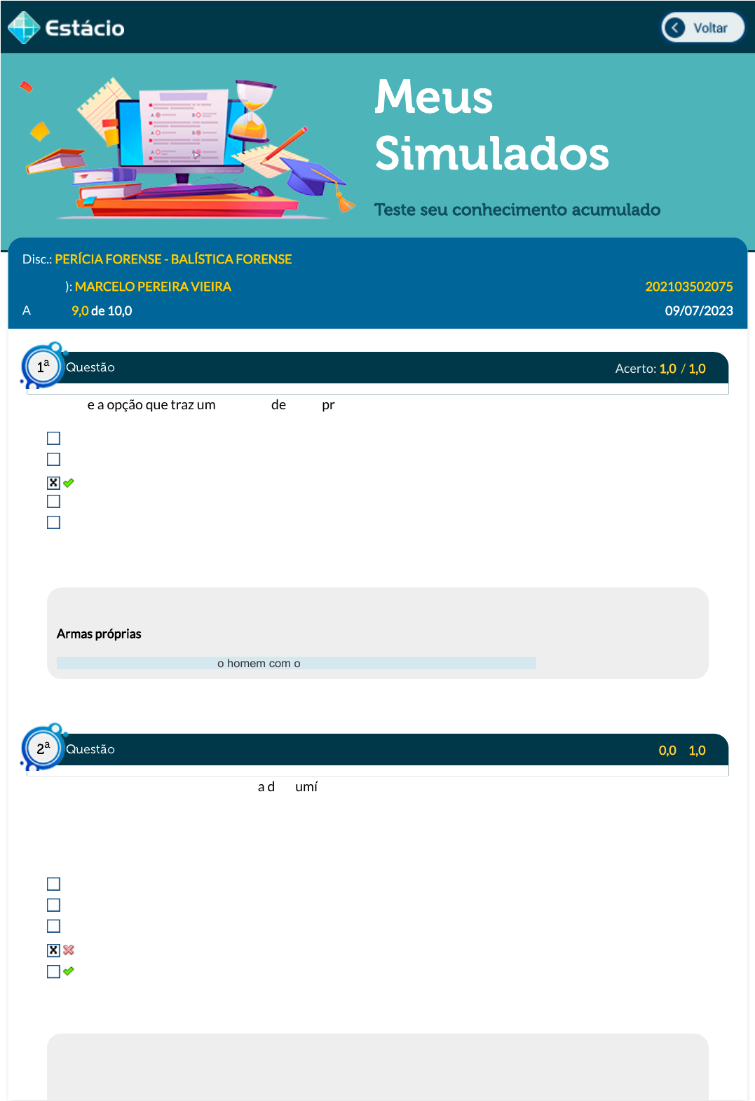 18/07/2023, 17:52 Estácio: Alunos https://simulado.estacio.br/bdq_simulados_avaliacao_parcial_resultado.asp?cod_hist_prova=313694441&cod_prova=6552590508&f_cod_disc= 1/5 Meus Simulados Teste seu conhecimento acumulado Disc.: PERÍCIA FORENSE - BALÍSTICA FORENSE Aluno(a): MARCELO PEREIRA VIEIRA 202103502075 Acertos: 9,0 de 10,0 09/07/2023 Acerto: 1,0 / 1,0 Marque a opção que traz um exemplo de arma própria: Saca-rolha. Espeto de churrasco. Pistola. Agulha de linha. Taco de beisebol. Respondido em 09/07/2023 17:11:43 Explicação: Armas próprias Objetos concebidos e feitos pelo homem com o fim específico de serem usados como armas. Acerto: 0,0 / 1,0 Confeccionada em aço, alumínio, liga de alumínio ou polímero, é a peça de maior dimensão e serve de suporte ou alojamento para as demais peças, em especial para o cano, ferrolho, na região superior, além de ser parte do mecanismo de disparo. De que peça de uma arma de fogo estamos falando? Suporte. Carregador. Gatilho. Ferrolho. Antecarga. Respondido em 09/07/2023 17:13:08 Explicação: Antecarga Questão1 a Questão2 a https://simulado.estacio.br/alunos/inicio.asp javascript:voltar(); 18/07/2023, 17:52 Estácio: Alunos https://simulado.estacio.br/bdq_simulados_avaliacao_parcial_resultado.asp?cod_hist_prova=313694441&cod_prova=6552590508&f_cod_disc= 2/5 Confeccionada em aço, alumínio, liga de alumínio ou polímero, é a peça de maior dimensão e serve de suporte ou alojamento para as demais peças, em especial para o cano, ferrolho, na região superior, além de ser parte do mecanismo de disparo. A parte por meio da qual a pistola é empenhada denomina-se coronha, que é oca e funciona como receptáculo ou cofre do carregador. Acerto: 1,0 / 1,0 Como classi�camos tecnicamente uma taser? Como uma arma de eletricidade exposta. Como uma arma de eletricidade assumida. Como uma arma de eletricidade conduzida. Como uma arma de eletricidade consumida. Como uma arma de eletricidade armazenada. Respondido em 09/07/2023 17:17:22 Explicação: A Taser é classi�cada tecnicamente como uma Conducted Electrical Weapon (CEW), ou seja, Arma de Eletricidade Conduzida. Acerto: 1,0 / 1,0 As armas de origem norte-americana usam letras para designar os tipos de choques. Assinale a alternativa que traz corretamente essa simbologia: IMC, IM, INTO, INCA, INEA. FMI, ONU, OEA, ORT, ORC. DEA, UNIS, DPAT, DPOU, DPAM. F, IM, M, IC, CL. F, G, H, I, J. Respondido em 09/07/2023 17:18:14 Explicação: Simbologia americana Feita com o emprego da(s) letra(s) inicial(is) do nome do respectivo choque (F, IM, M, IC e CL). Acerto: 1,0 / 1,0 Em armas semiautomáticas, qual(is) dos elementos abaixo produz(em) as deformações apresentadas na base do estojo ou na cápsula de sua espoleta? Gases no interior do cano. Extrator e ejetor. Irregularidades do cano e cão. Ação externa. Questão3 a Questão4 a Questão5 a 18/07/2023, 17:52 Estácio: Alunos https://simulado.estacio.br/bdq_simulados_avaliacao_parcial_resultado.asp?cod_hist_prova=313694441&cod_prova=6552590508&f_cod_disc= 3/5 Gatilho e empunhadura. Respondido em 09/07/2023 17:18:28 Explicação: As deformações apresentadas na base do estojo ou na cápsula de sua espoleta, são produzidas pelo percussor e pelas irregularidades da superfície da culatra. Nas armas semiautomáticas, as deformações e impressões também podem ocorrer em função da ação do extrator e do ejetor. Acerto: 1,0 / 1,0 Não constitui um tipo de espoleta: Chivan Berdan Bateria Nenhuma das respostas está correta. Boxer Respondido em 09/07/2023 17:18:48 Explicação: Chivan Acerto: 1,0 / 1,0 Fulano está no stand de tiro de sua unidade. Ele pratica com uma pistola taurus PT 99. Ao destravar a arma, ocorre um disparo. O projetil entra em uma caixa de areia. Podemos chamar esse fenômeno por qual termo? Tiro incidental. Tiro imprudente. Acidente de tiro. Tiro acidental. Incidente de tiro. Respondido em 09/07/2023 17:19:35 Explicação: Tiro acidental Tiro acidental é todo tiro que se produz em circunstâncias anormais, sem o acionamento regular do mecanismo de disparo, pela falta do mecanismo de segurança da arma. Exemplos: ¿ Por queda da arma, estando desengatilhada; ¿ Por queda da arma, estando engatilhada; ¿ Por ocasião do fechamento da culatra; ¿ Ao ser a arma destravada. Questão6 a Questão7 a 18/07/2023, 17:52 Estácio: Alunos https://simulado.estacio.br/bdq_simulados_avaliacao_parcial_resultado.asp?cod_hist_prova=313694441&cod_prova=6552590508&f_cod_disc= 4/5 Acerto: 1,0 / 1,0 O perito Fulano está realizando os procedimentos para a coleta de estojos-padrão de uma arma semiautomática. Ele realiza os disparos com o cano voltado para baixo. Podemos a�rmar que: O perito Fulano está errado. Deve-se coletar projeteis-padrão, não estojos-padrão. O perito Fulano está certo. Para armas semiautomáticas sempre se recomenda a obtenção de estojos- padrão por meio de disparos com o cano voltado para baixo. O perito Fulano está errado. Não há coleta de estojos-padrão para armas semiautomáticas. O perito Fulano está errado. Os disparos realizados com o cano voltado para baixo podem originar estojos-padrão inadequados, porque, pela ação da gravidade, os cartuchos tendem a se afastar mais da ponta do percutor e este produzirá marcas de percussão menos profundas. O perito Fulano está errado. Para armas semiautomáticas sempre se recomenda que os disparos sejam efetuados com o cano voltado para cima. Respondido em 09/07/2023 17:20:20 Explicação: Os disparos realizados com o cano voltado para baixo podem originar estojos-padrão inadequados, porque, pela ação da gravidade, os cartuchos tendem a se afastar mais da ponta do percutor e este produzirá marcas de percussão menos profundas. Acerto: 1,0 / 1,0 São realizados cinco tipos de exames em armas de fogo. Um deles é o exame para identi�cação direta de arma de fogo. Como este exame se caracteriza? Realizado quando alguém alega que a arma de fogo a