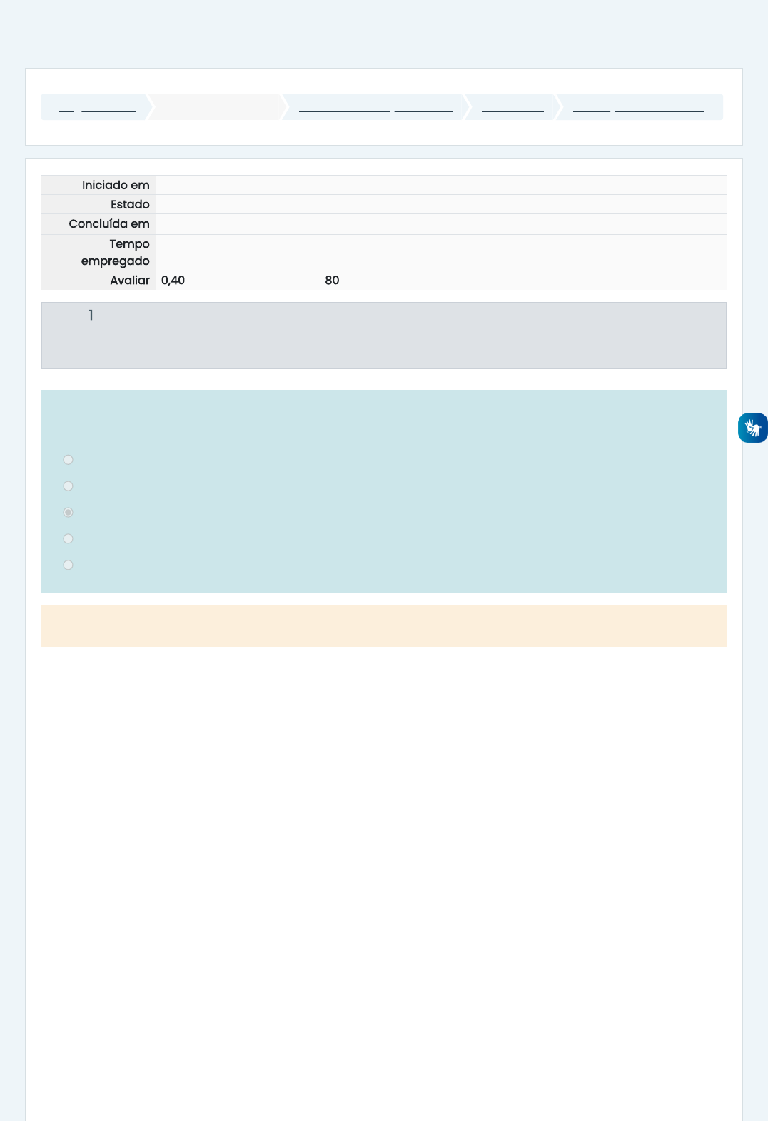 18/03/2023, 12:16 Avaliação - Unidade IV: Revisão da tentativa https://ambienteonline.uninga.br/mod/quiz/review.php?attempt=1958889&cmid=470086 1/7 Página inicial Minhas disciplinas 2023/1 - Recreação e Lazer UNIDADE IV Avaliação - Unidade IV Iniciado em sábado, 18 mar 2023, 12:05 Estado Finalizada Concluída em sábado, 18 mar 2023, 12:14 Tempo empregado 8 minutos 56 segundos Avaliar 0,40 de um máximo de 0,50(80%) Questão 1 Completo Atingiu 0,05 de 0,05 “Planejar é transformar a realidade numa direção escolhida”, “Planejar é organizar a própria ação”, “Planejar é dar clareza e precisão à própria ação”. Assinale a alternativa correta que aponta o autor que cita isso. a. Tardif (2004). b. AWAD (2012). c. Gandin (1986). d. Ribeiro (2014). e. Brustolin e Gontijo (2014). A resposta correta é: Gandin (1986). https://ambienteonline.uninga.br/ https://ambienteonline.uninga.br/course/view.php?id=16622 https://ambienteonline.uninga.br/course/view.php?id=16622§ion=7 https://ambienteonline.uninga.br/mod/quiz/view.php?id=470086 18/03/2023, 12:16 Avaliação - Unidade IV: Revisão da tentativa https://ambienteonline.uninga.br/mod/quiz/review.php?attempt=1958889&cmid=470086 2/7 Questão 2 Completo Atingiu 0,05 de 0,05 Questão 3 Completo Atingiu 0,05 de 0,05 Após o evento, é importante que o profissional do Lazer e da Recreação faça uma avaliação. Nesse sentido, a avaliação pode ocorrer em que sentido? a. A avaliação pode ocorrer no sentido de aprender na prática (o que deu certo ou não), como forma de atender melhor o público (o que é preciso melhorar) e de melhorar a gestão e organização do evento (se a organização do que foi planejado deu certo). b. A avaliação pode ocorrer no sentido de aprender na prática (o que deu certo ou não), como forma de atender melhor o público (o que é preciso melhorar) e como forma de aprovar a remuneração do profissional. c. A avaliação pode ocorrer no sentido de aprender na prática (o que deu certo ou não), como forma de atender melhor o público (o que é preciso melhorar) e como forma de aprovar a remuneração do profissional. d. A avaliação pode ocorrer no sentido de aprender na prática (o que deu certo ou não), como forma de recomendação por parte do contratante e de melhorar a gestão e organização do evento (se a organização do que foi planejado deu certo). e. A avaliação pode ocorrer no sentido de aprender na prática (somente com o que não deu certo), como forma de atender melhor o público (o que é preciso melhorar) e de melhorar a gestão e organização do evento (se a organização do que foi planejado deu certo). A resposta correta é: A avaliação pode ocorrer no sentido de aprender na prática (o que deu certo ou não), como forma de atender melhor o público (o que é preciso melhorar) e de melhorar a gestão e organização do evento (se a organização do que foi planejado deu certo). Cada time fica situado em um campo e um dos jogadores de cada equipe deve se posicionar atrás da linha de fundo do campo adversário. A partida do jogo é iniciada com o apito do recreador, assim, um jogador da equipe que foi sorteada para iniciar a partida arremessa a bola ao campo adversário com o objetivo de “queimar”, algum jogador adversário. Vence a equipe que queimar primeiro todos os jogadores da equipe adversária. Assinale a alternativa correta que representa a atividade descrita. a. Queima. b. Voleibol. c. Bandeirinha. d. Polo aquático. e. Biribol. A resposta correta é: Queima. 18/03/2023, 12:16 Avaliação - Unidade IV: Revisão da tentativa https://ambienteonline.uninga.br/mod/quiz/review.php?attempt=1958889&cmid=470086 3/7 Questão 4 Completo Atingiu 0,05 de 0,05 De acordo com Tardif (2004), o recreador usa de saberes que podem auxiliá-lo no planejamento do evento de Lazer e Recreação. Nesse sentido, leia as sentenças abaixo e em seguida assinale a alternativa correta: I. Um dos saberes é o saber da experiência pessoal; II. Saber tecnológico, também é apontado como um dos saberes do animador; III. Um dos saberes é o saber do conhecimento técnico e pedagógico; IV. Saber da experiência profissional, também é apontado como um dos saberes do animador. a. Somente as afirmativas I e II e III estão corretas. b. Somente as afirmativas I e III estão corretas. c. Todas as afirmativas estão corretas. d. Somente as afirmativas I, III e IV estão corretas. e. Somente a afirmativa IV está correta. A resposta correta é: Somente as afirmativas I, III e IV estão corretas. 18/03/2023, 12:16 Avaliação - Unidade IV: Revisão da tentativa https://ambienteonline.uninga.br/mod/quiz/review.php?attempt=1958889&cmid=470086 4/7 Questão 5 Completo Atingiu 0,05 de 0,05 Marque verdadeiro (V) ou falso (F) em relação a organização e planejamento de eventos de Lazer e Recreação e atividades práticas propostas na apostila de acordo com a idade e o espaço de atuação, e, em seguida, assinale a alternativa correta. ( ) O planejamento é fundamental para o sucesso do recreador, sem ele, sua prática fica aleatória, sem metas e objetivos. Isso pode levar até mesmo a uma situação constrangedora, já que o público pode entender que você é um profissional que não está preparado e comprometido com seu trabalho. ( ) Os participantes deverão ser divididos em duas equipes. O recreador deve espalhar pela piscina as garrafas pet com as perguntas ou provas. Após decidir a equipe que começa, o recreador dá um sinal e um dos membros deve ir até a piscina pegar uma garrafa aleatória e levar para a sua equipe. Se dentro tiver perguntas a equipe responde, se tiver prova a equipe cumpre. Se conseguirem cumprir um dos desafios a equipe marca ponto, caso contrário, passa a vez e o ponto vai para outra equipe. Essa é a descrição da gincana cultural molhada, recomendada para crianças de 8 a 12 anos. ( ) Para iniciar o planejamento é preciso informações como: equipe