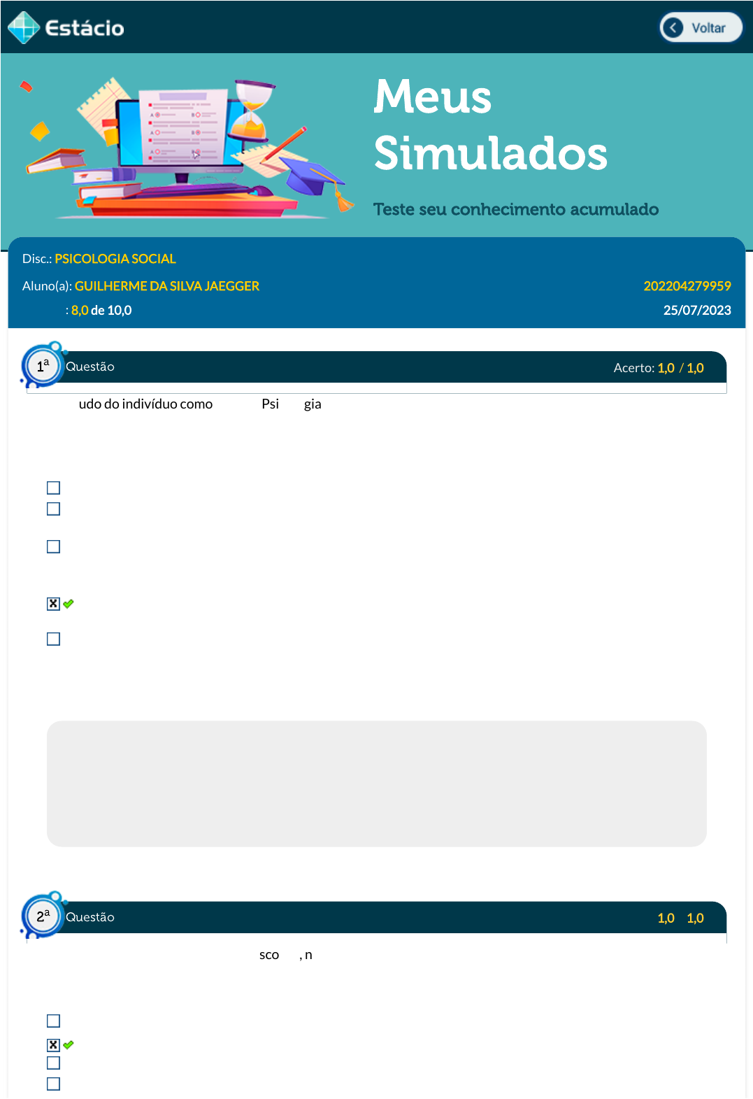 25/07/2023 17:25 Estácio: Alunos https://simulado.estacio.br/alunos/ 1/6 Meus Simulados Teste seu conhecimento acumulado Disc.: PSICOLOGIA SOCIAL Aluno(a): GUILHERME DA SILVA JAEGGER 202204279959 Acertos: 8,0 de 10,0 25/07/2023 Acerto: 1,0 / 1,0 O estudo do indivíduo como foco da Psicologia trouxe a necessidade de ''adequar'' esses estudos ao formato de modelo de ciência vigente, que era pautado nos parâmetros das ciências físicas e naturais e tinham métodos e procedimentos padrões para serem quali�cados como cientí�co. A partir dessa a�rmativa, assinale a alternativa correta: O modelo de ciência vigente exige a adequação da psicologia social. A psicologia social, pelo seu objeto de estudo, teve facilidade de adequação aos parâmetros das ciências físicas. O modelo matemático, de difícil aplicação aos fenômenos sociais, não deve ser utilizado em Psicologia Social pelas evidentes di�culdades que enfrentam os pro�ssionais de ciências humanas com esse referencial. A psicologia social americana, de base experimentalista, foi durante um período o grande modelo necessário para garantir o reconhecimento desta ciência perante as chamadas ciências naturais. A psicologia social sofre de um mal insuperável, de cunho epistemológico, e em função dele tende ao naturalismo. Respondido em 25/07/2023 16:36:13 Explicação: Justi�cativa: Até o �nal da década de 60, a Psicologia Social Psicológica Americana de base experimental trouxe os aspectos mais próximos das exigências das ciências naturais, o que auxiliou que a psicologia social fosse vista como ciência. A Psicologia Social Psicológica trouxe o foco para o indivíduo, não levando em consideração o impacto que o social causava a essa pessoa nem o seu contexto sócio-histórico. Com isso, era possível trazer para dentro do laboratório situações hipotéticas e testá-las, tentando entender quais impactos causam no sujeito. Acerto: 1,0 / 1,0 O psicólogo social francês Serge Moscovici, no século XX, desenvolveu teoria psicossocial. Sua teoria foi fortalecida por muitos pesquisadores que aderiram a essa nova forma de pensar a psicologia social, inclusive no Brasil. Qual é a teoria: Teoria das Relações Interpessoais Teoria da Representação Social Psicossociologia Teoria Sócio-Histórica Questão1 a Questão2 a https://simulado.estacio.br/alunos/inicio.asp javascript:voltar(); 25/07/2023 17:25 Estácio: Alunos https://simulado.estacio.br/alunos/ 2/6 Teoria da Dissonância Cognitiva Respondido em 25/07/2023 16:38:55 Explicação: Serge Moscovici tem uma contribuição fundamental para um dos pilares da psicologia social europeia. O conceito de representações sociais está relacionado ao sistema de valores, noções e práticas que oferecem aos sujeitos as ferramentas necessárias para eles se orientarem no contexto social e material, sendo modalidades de pensamento prático voltadas à comunicação, à compreensão e ao domínio do ambiente social, material e ideal. Acerto: 1,0 / 1,0 Martín-Baró é conhecido pelo desenvolvimento de uma proposta contra hegemônica de Psicologia que, inspirada na Teologia da Libertação, no Marxismo e nas aspirações dos movimentos populares da América Latina. Sobre as contribuições da teoria de Martín-Baró para a Psicologia Social, podemos a�rmar: Enfatiza o compromisso da Psicologia Social com as classes marginalizadas a partir de uma Psicologia Social crítica e libertadora. Sua concepção de Psicologia Social pode ser compreendida sem uma referência à situação política, social e econômica da América Latina. Defendia o idealismo metodológico, no qual as leis e princípios gerais poderiam ser aplicados a qualquer realidade social. Temáticas como a violência, o machismo, o fatalismo, a saúde mental e a guerra não �zeram parte das suas investigações. Fortaleceu a concepção universalista, alheia à história e de vertente individualista da Psicologia Social hegemônica. Respondido em 25/07/2023 16:42:59 Explicação: Gabarito: Enfatiza o compromisso da Psicologia Social com as classes marginalizadas a partir de uma Psicologia Social crítica e libertadora. Justi�cativa: A sugestão de um novo objeto para a psicologia social segundo Baró envolve uma perspectiva dialética que compreende os fenômenos pelo pressuposto de que pessoa e sociedade constituem-se mutuamente pela negação entre ambos os polos, ao mesmo tempo em que se a�rmam como tais em um processo histórico. Implica também pensar a realidade com o intuito de transformá-la a partir da realidade e visão de mundo das classes populares latino-americanas em direção a uma ordem social justa e igualitária, revelando pretensões de contribuir para a liberdade individual e social. Acerto: 1,0 / 1,0 É notório que a Psicologia Social é formada pela junção de múltiplas áreas do conhecimento e de vários métodos e técnicas que constituem uma contribuição real que constitui um real contributo para o desenvolvimento das teorias em cognição social. Marque a alternativa que apresenta a contribuição da Neurociência Sociocognitiva para a Psicologia Social. Os processos intraindividuais responsáveis pelo modo pelo qual os indivíduos respondem aos estímulos sociais. O experimentalismo psicológico social. O estudo dos mecanismos neuronais que estão interligados aos processos sociocognitivos. Os testes neuropsicológicos. A codi�cação da informação do contexto social. Respondido em 25/07/2023 16:47:36 Questão3 a Questão4 a 25/07/2023 17:25 Estácio: Alunos https://simulado.estacio.br/alunos/ 3/6 Explicação: Gabarito: O estudo dos mecanismos neuronais que estão interligados aos processos sociocognitivos. Justi�cativa: A neurociência sociocognitiva combina métodos da neurociência cognitiva com as teorias da cognição social de forma a estudar os mecanismos mentais que criam, enquadram, regulam e respondem à nossa experiência ao mundo social