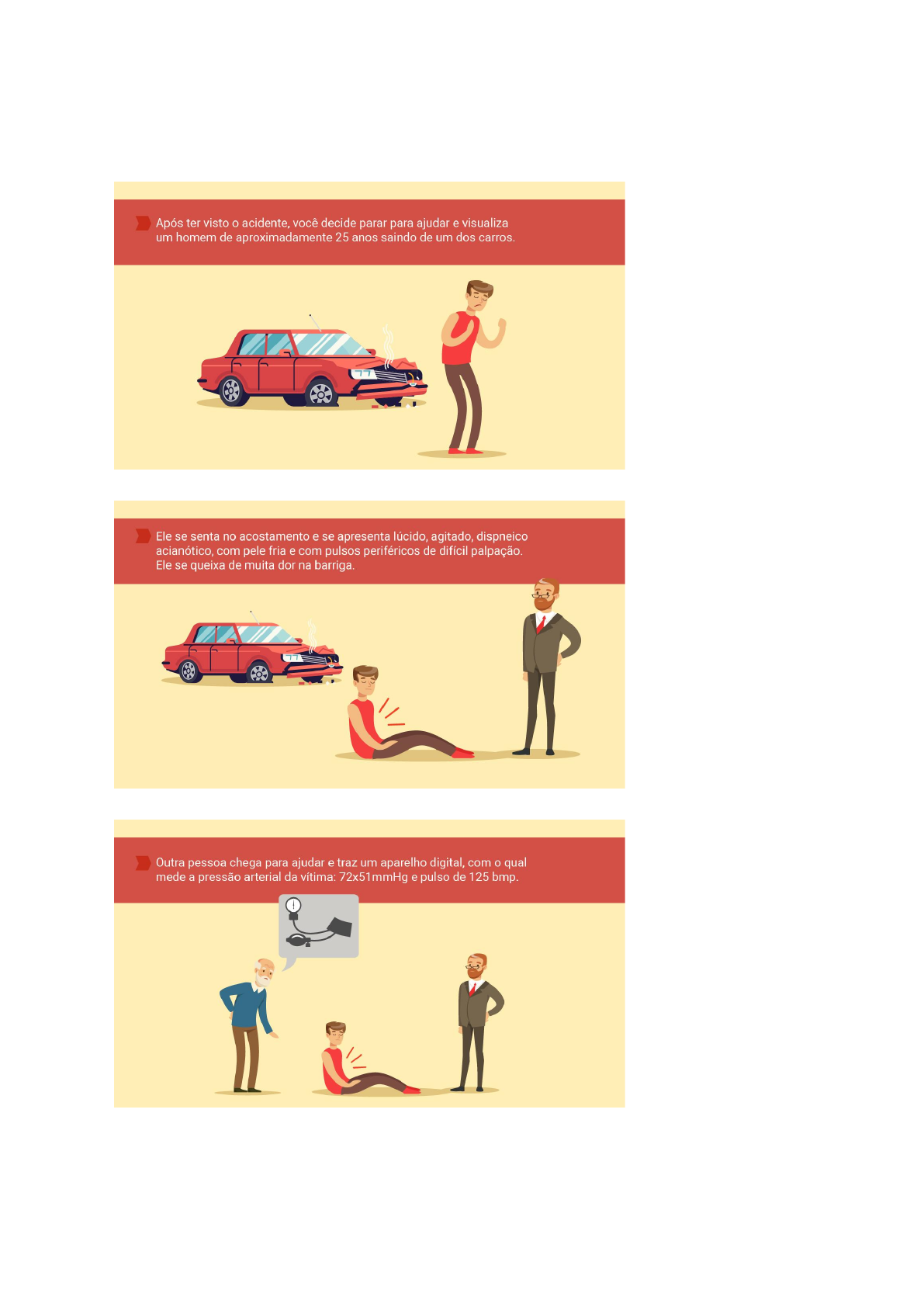 O estado de choque é um evento de extrema gravidade que coloca em risco a vida do paciente. Com base nessa informação, imagine a seguinte situação hipotética: Diante do caso apresentado, responda: 1 - Qual o provável distúrbio hemodinâmico está sendo apresentado pela vítima? 2 - Qual a consequência comum do estado de choque e quando ele ocorre? 3 - O que você pode fazer para ajudar a vítima? 1 - A vítima pode ter sofrido um choque hipovolêmico, causado por hemorragia interna abdominal pós-traumatismo automobilístico. 2 - A causa comum do estado de choque é a hipoperfusão sistêmica. Ocorre quando há queda na pressão de enchimento capilar ou pressão hidrostática. 3 - Para ajudar a vítima, é preciso reconher os sinais e sintomas de estado de choque e providenciar assistência especializada imediatamente. A vítima necessitará de um tratamento complexo, que só pode ser feito por profissionais com recursos especiais para intervirem nesses casos. Algumas providências podem ser tomadas para evitar o estado de choque, mas infelizmente não há muitos procedimentos de primeiros socorros a serem tomados para tirar a vítima do choque. Existem algumas providências que devem ser memorizadas com o intuito permanente de prevenir o agravamento e retardar a instalação do estado de choque, que são: - Deitar a vítima em posição horizontal, preferencialmente de costas e com as pernas a um nível cerca de 25 a 30 cm mais elevadas do que a cabeça. - Os membros inferiores devem ficar elevados em relação ao corpo. Isso pode ser feito colocando-os sobre uma almofada, umcobertor dobrado ou qualquer outro objeto. Esse procedimento deve ser feito apenas se não houver fraturas desses membros; ele serve para melhorar o retorno sanguíneo e levar o máximo de oxigênio ao cérebro. Não se deve erguer os membros inferiores da vítima a mais de 30 cm do solo. No caso de ferimentos no tórax, que dificultem a respiração, ou de ferimento na cabeça, os membros inferiores não devem ser elevados. - Afrouxar as roupas da vítima no pescoço, peito e na cintura, em seguida, verificar se há presença de prótese dentária, objetos ou alimento na boca e retirá-los. - No caso de a vítima estar inconsciente, ou se estiver consciente e sangrando pela boca ou pelo nariz, deitá-la na posição lateral de segurança para evitar asfixia. - Verificar quase que simultaneamente se a vítima respira. Deve-se estar preparado para iniciar manobras de RCP, se a vítima não estiver respirando. - Enquanto as providências já indicadas são executadas, observe o pulso da vítima. No choque, o pulso dela se apresenta rápido e fraco. - Cubra a vítima com uma manta, para evitar a perda de calor e o consequente arrefecimento corporal, sem aquecê-la demasiadamente. - Caso a vítima esteja obnubilada, não se deve dar comida ou qualquer bebida, porque pode provocar a passagem de alimentos para as vias respiratórias. - Se o socorro médico estiver demorando, tranquilize a vítima, mantendo-a calma sem demonstrar apreensão quanto ao seu estado. Permaneça junto a ela para passar segurança e monitorar alterações em seu estado físico e de consciência.